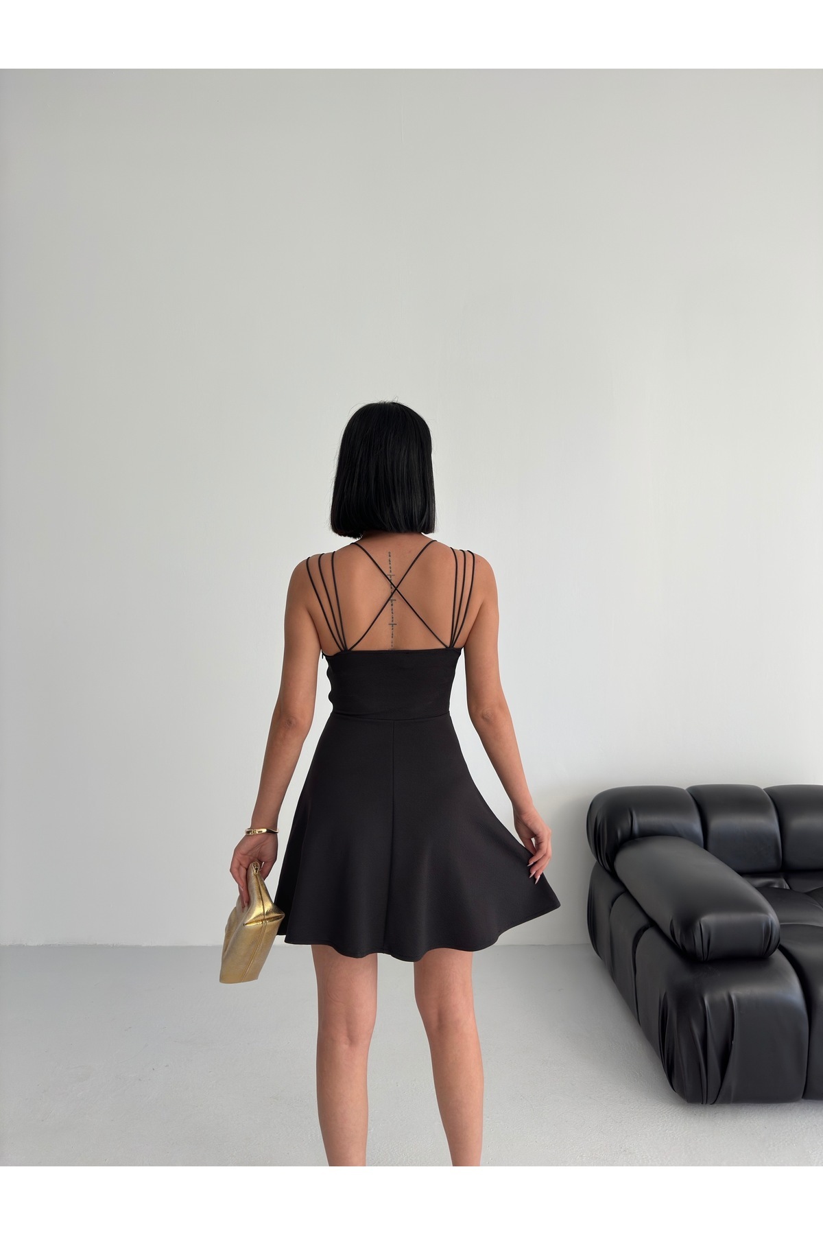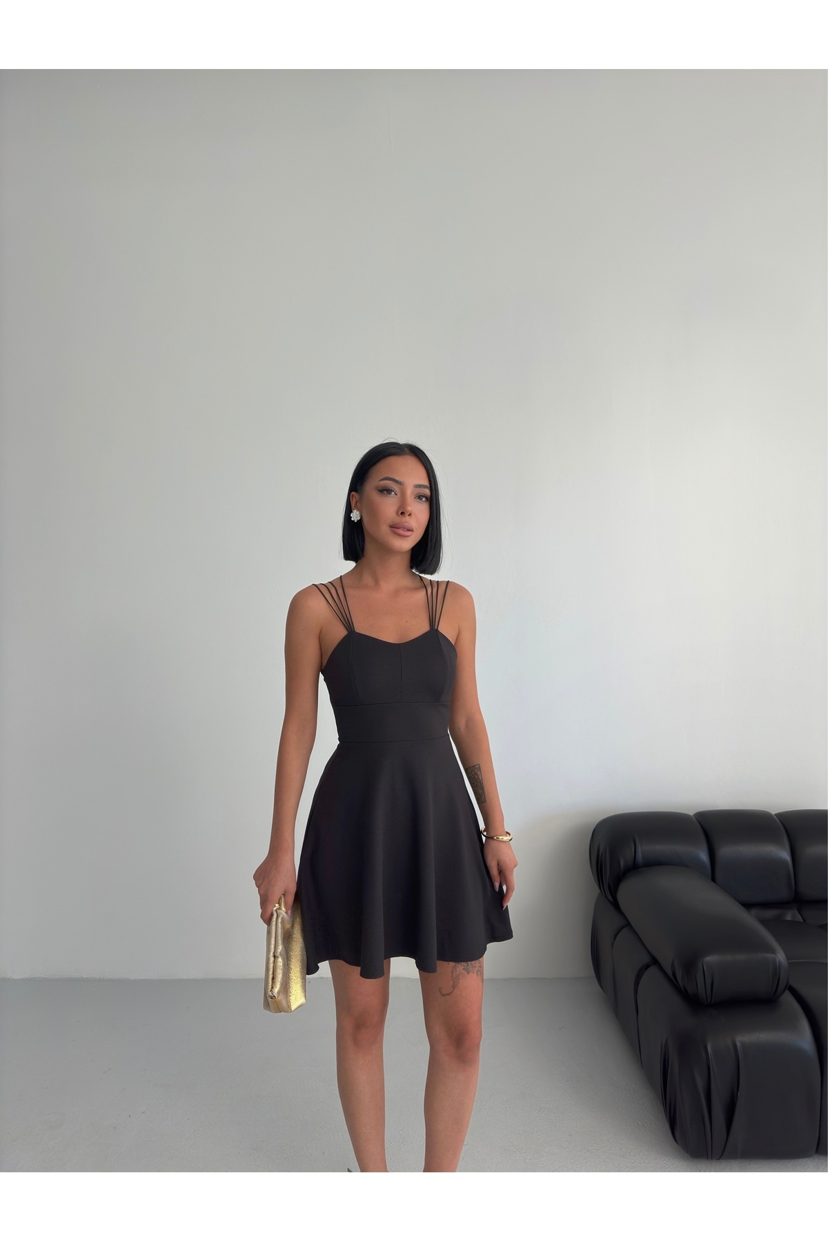 İnce Askılı Sırt Dekolteli Volan Kloş Mezuniyet Elbisesi Siyah