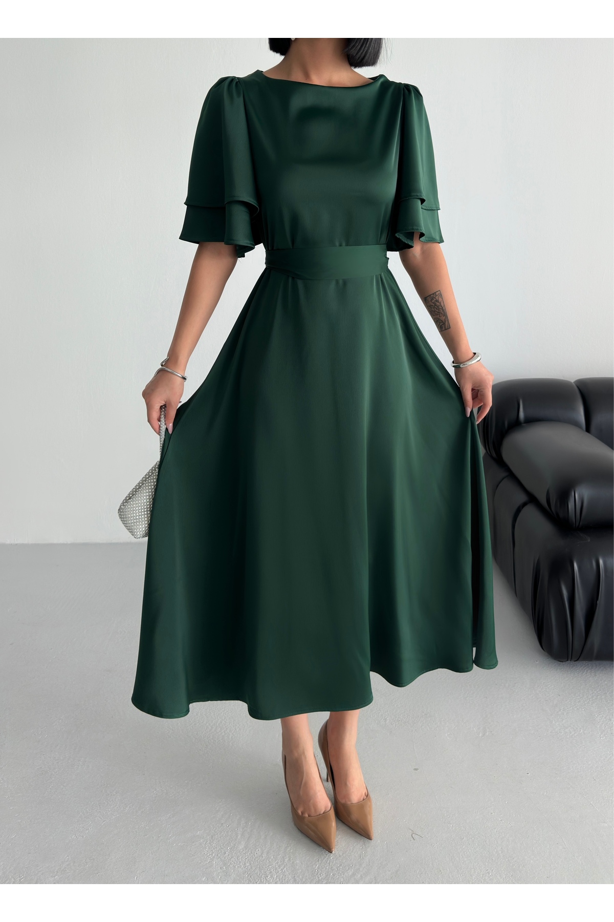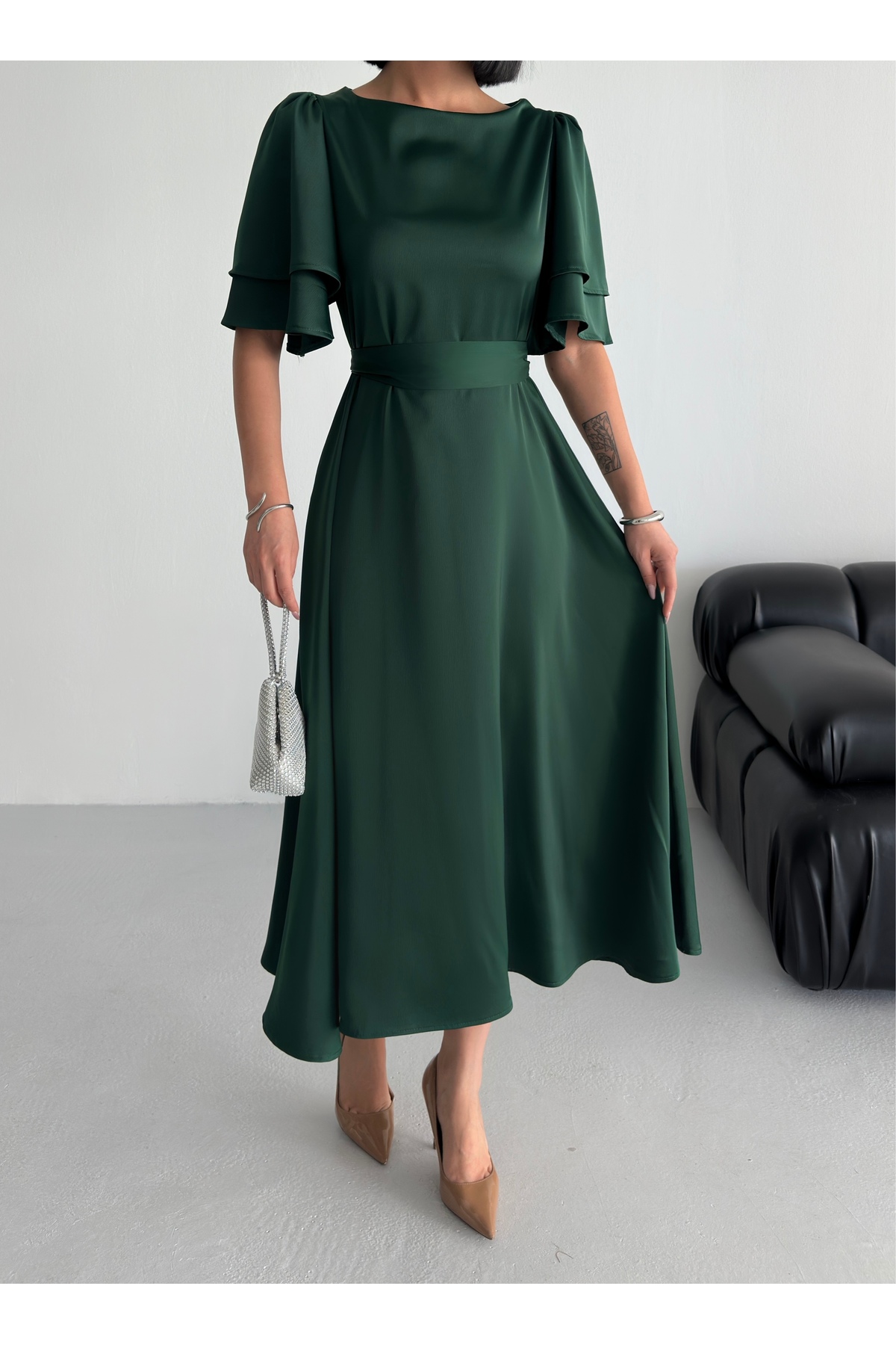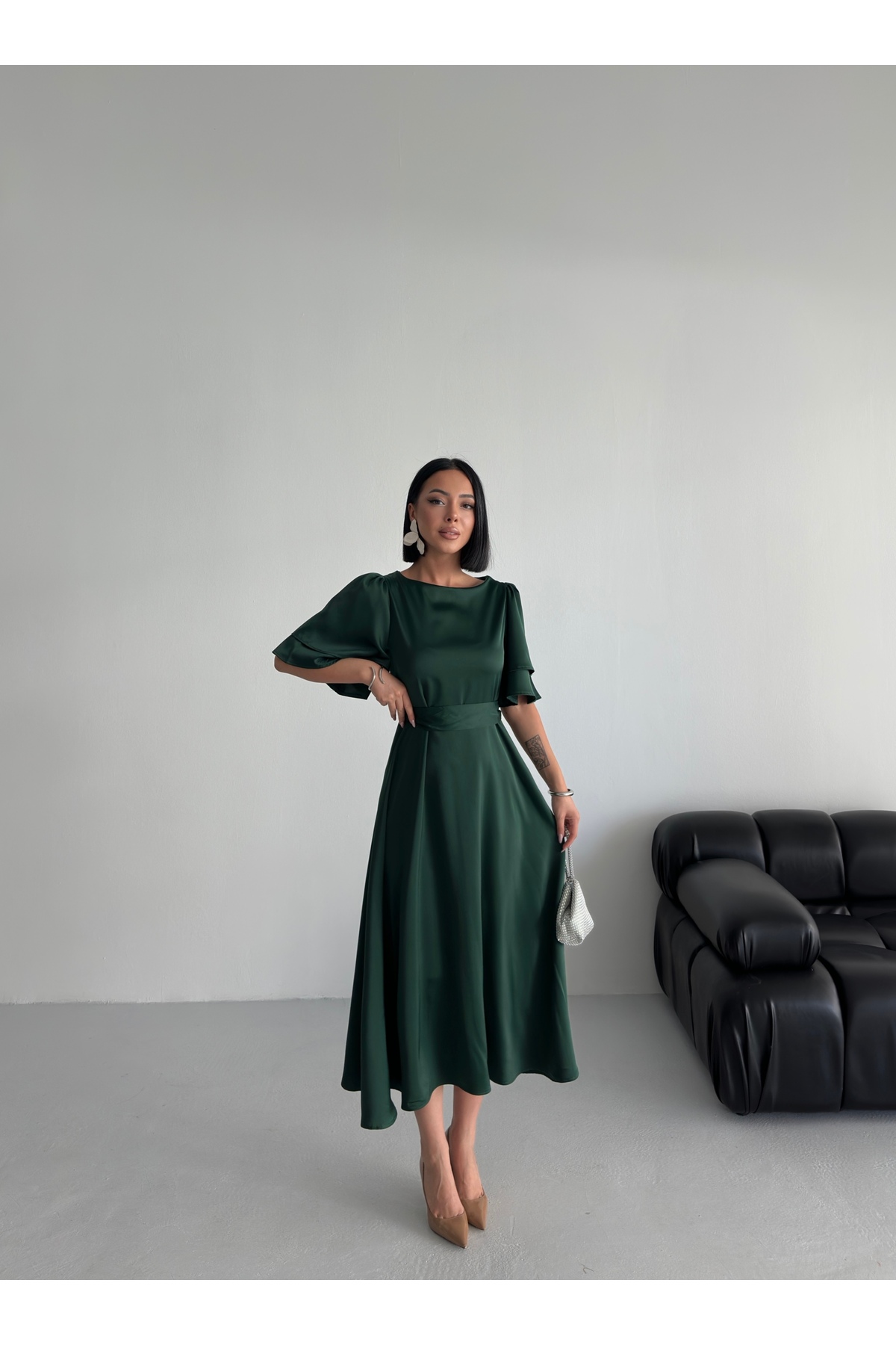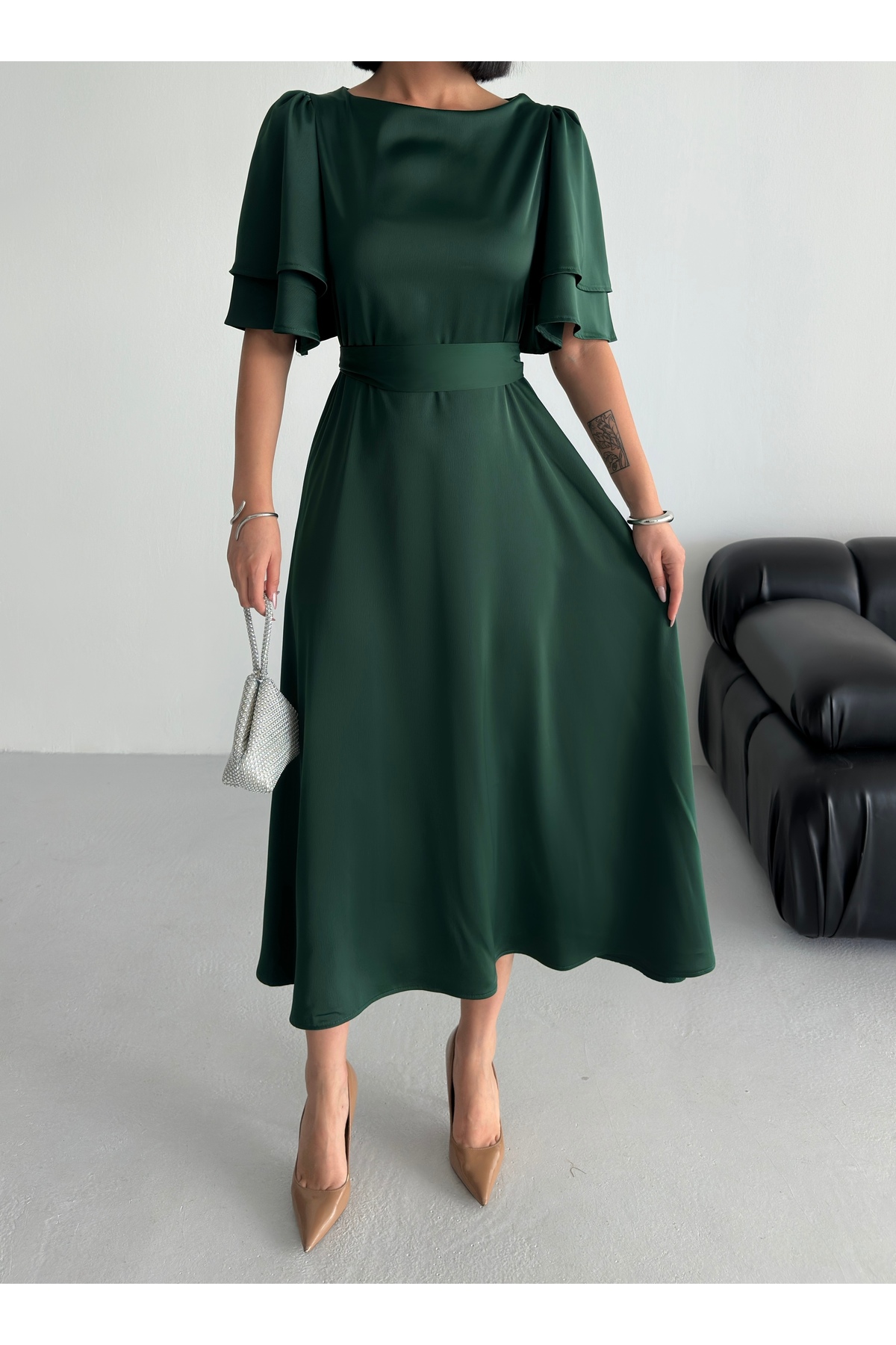 Saten kumaşın zarif dokusuyla öne çıkan bu abiye elbise, tüm özel günlerinizde şıklığınızı tamamlar; Klasik siyah rengiyle her zaman moda olan bu elbise, farklı yaş gruplarına hitap eder ve zamansız bir tarz sunar; İspanyol kol tasarımı ile modern ve feminen bir siluet oluştururken, kayık yaka detayı dekolte bölgesini zarifçe vurgular; Belinizi saran kuşak detayı sayesinde vücut hatlarınıza mükemmel uyum sağlar ve feminen bir duruş kazandırır; Regular kalıp ile rahat hareket etme özgürlüğü sunarken, dokuma kumaş tipi dayanıklılığı arttırarak uzun süreli kullanım imkanı tanır; Düz kesimiyle sade ve şık bir görünüm sergilerken, kloş silueti hareket özgürlüğünüzü kısıtlamaz; Pratik kuşak kapama şekliyle kolayca giyilip çıkartılabilir ve kişisel zevkinize göre ayarlama imkanı sunar;