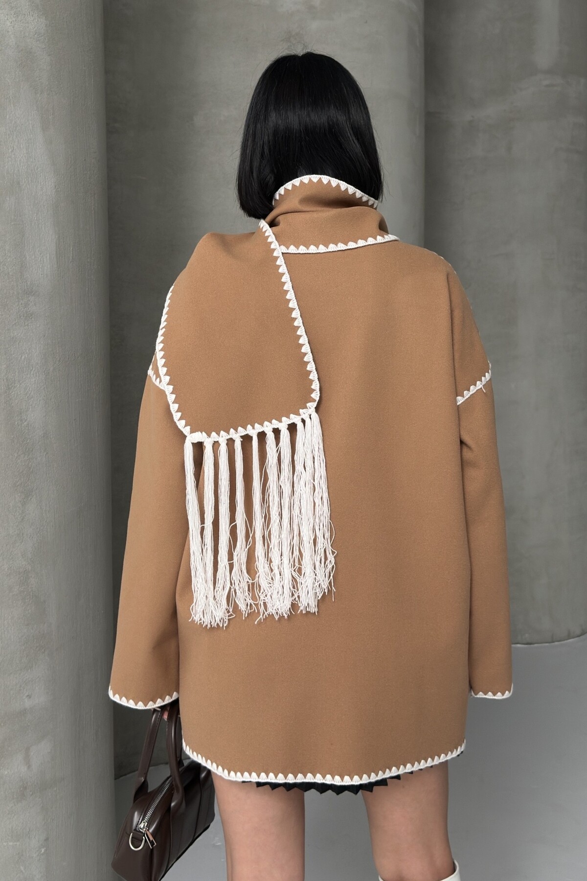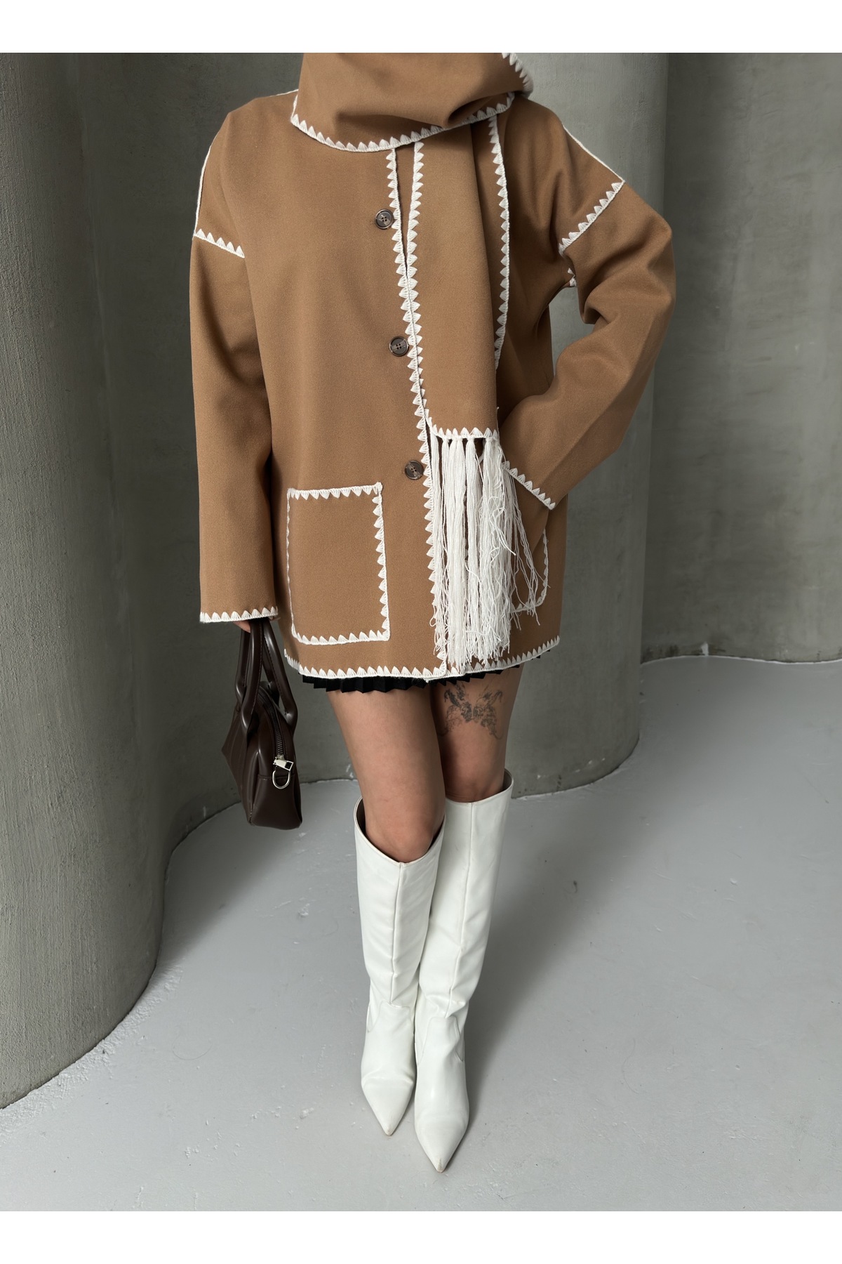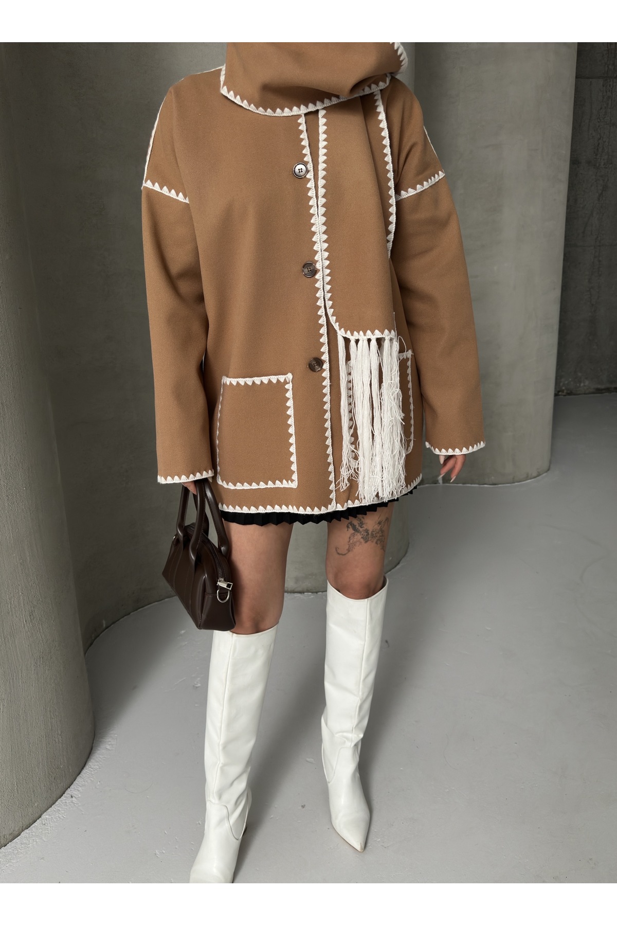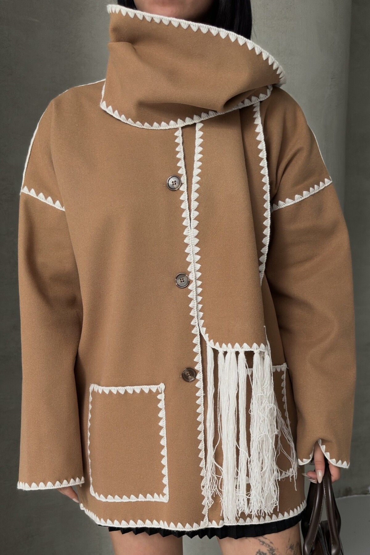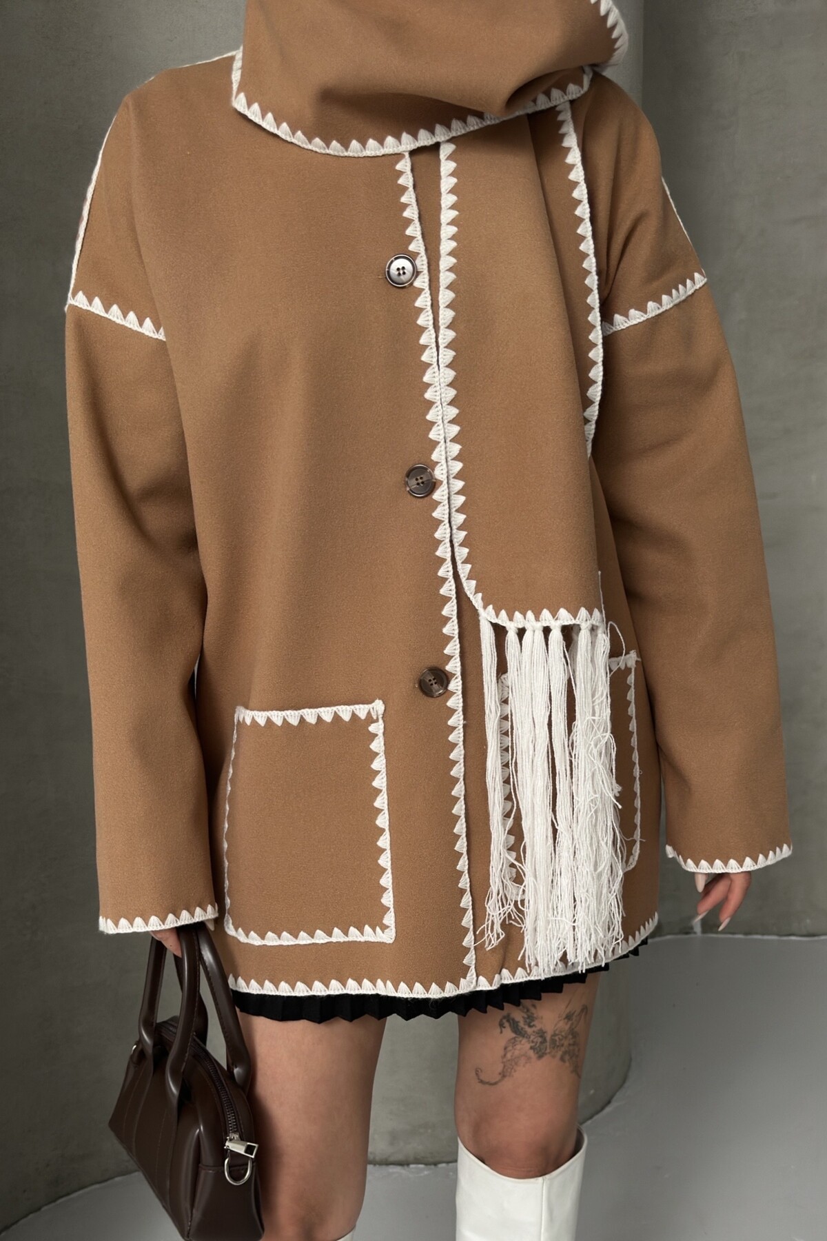 Nakış Detaylı Atkılı Yumuşak Triko Hırka Ceket Bej