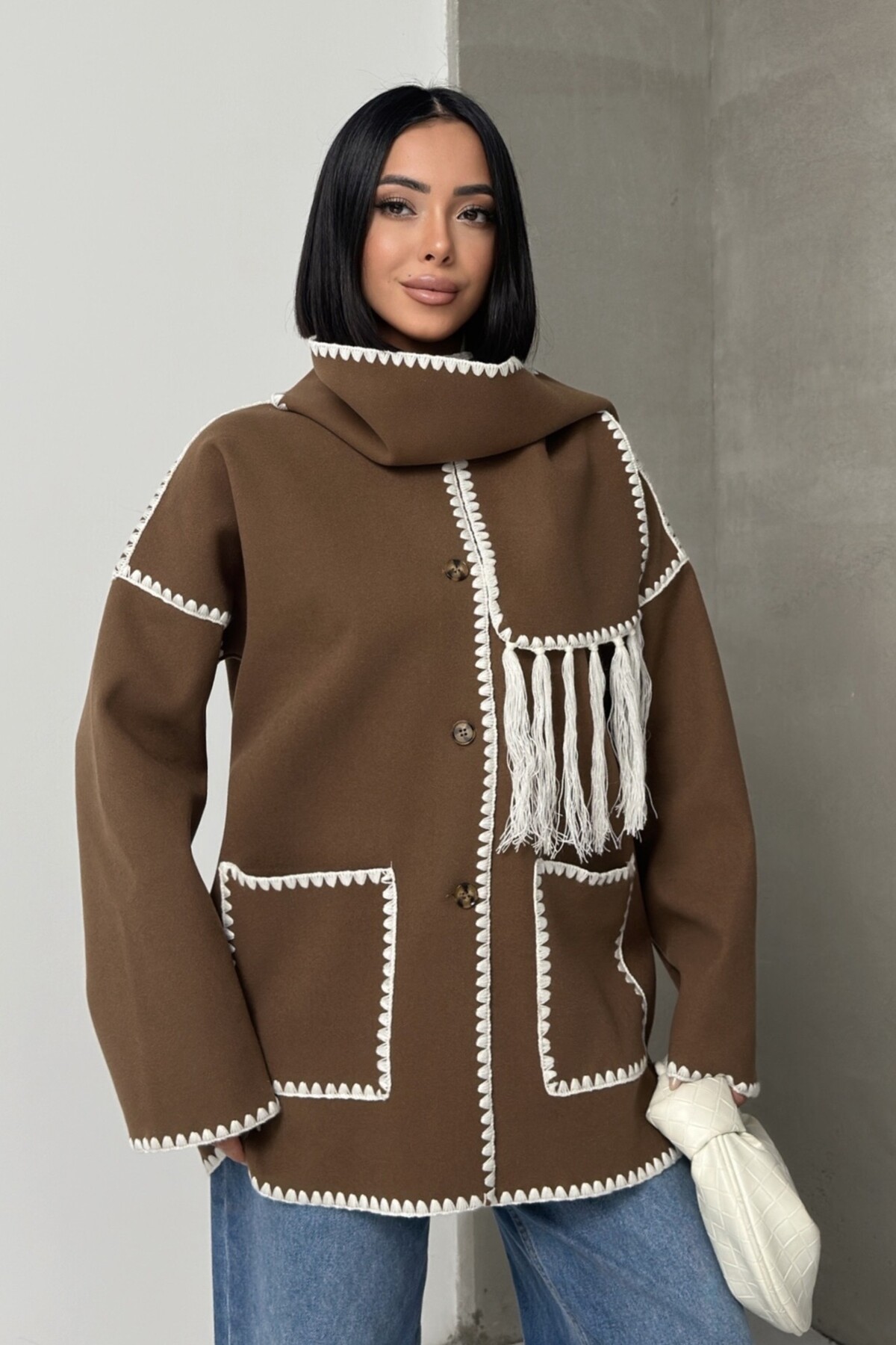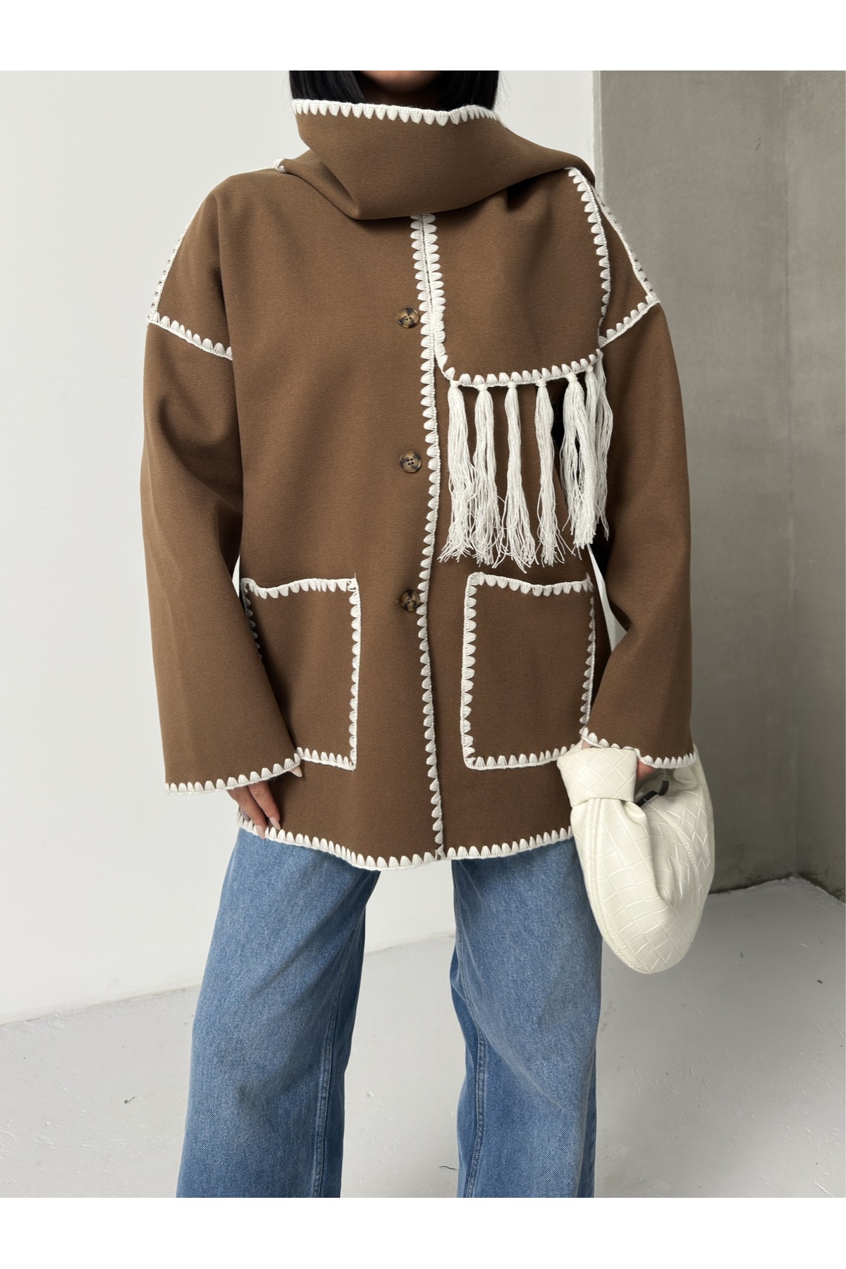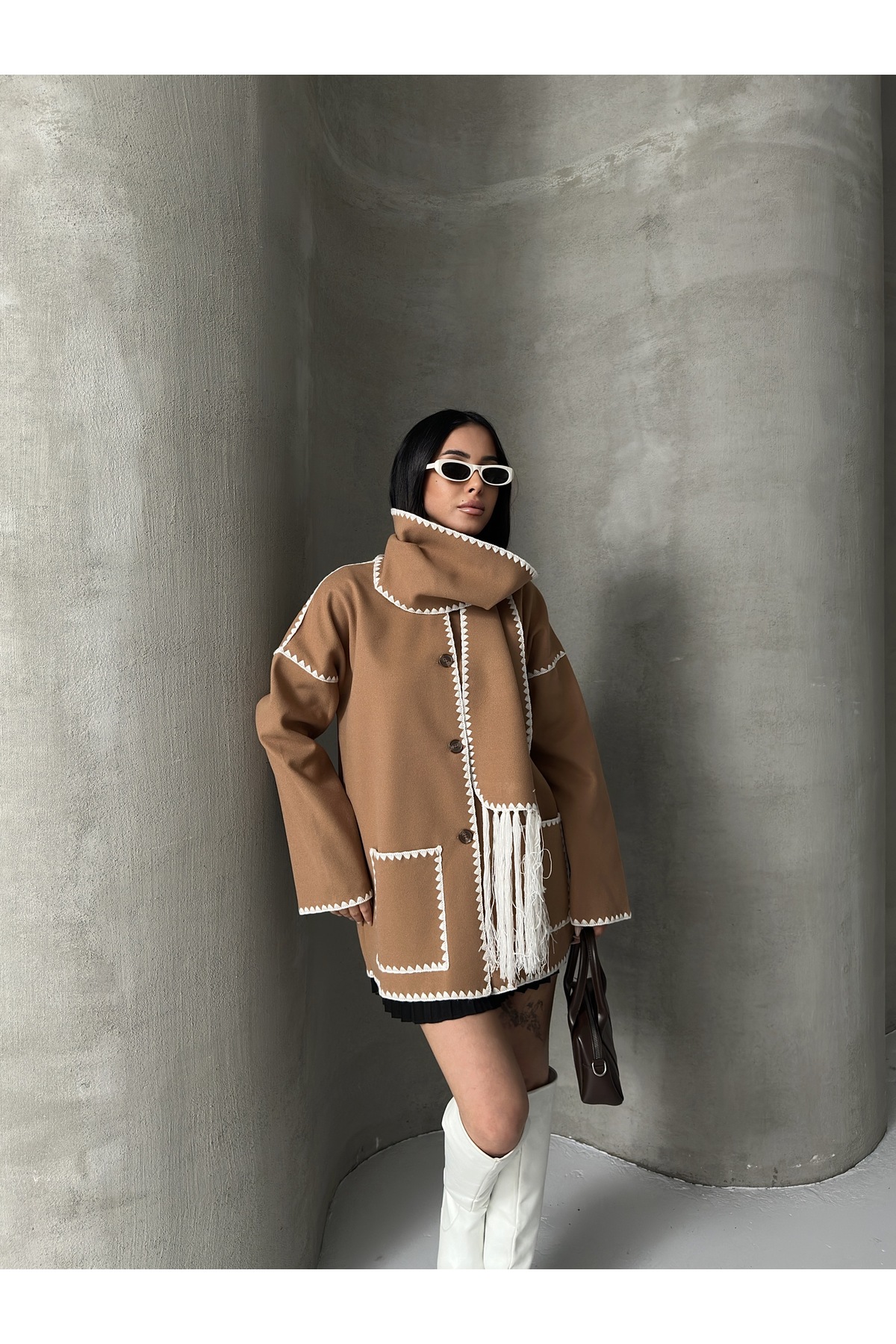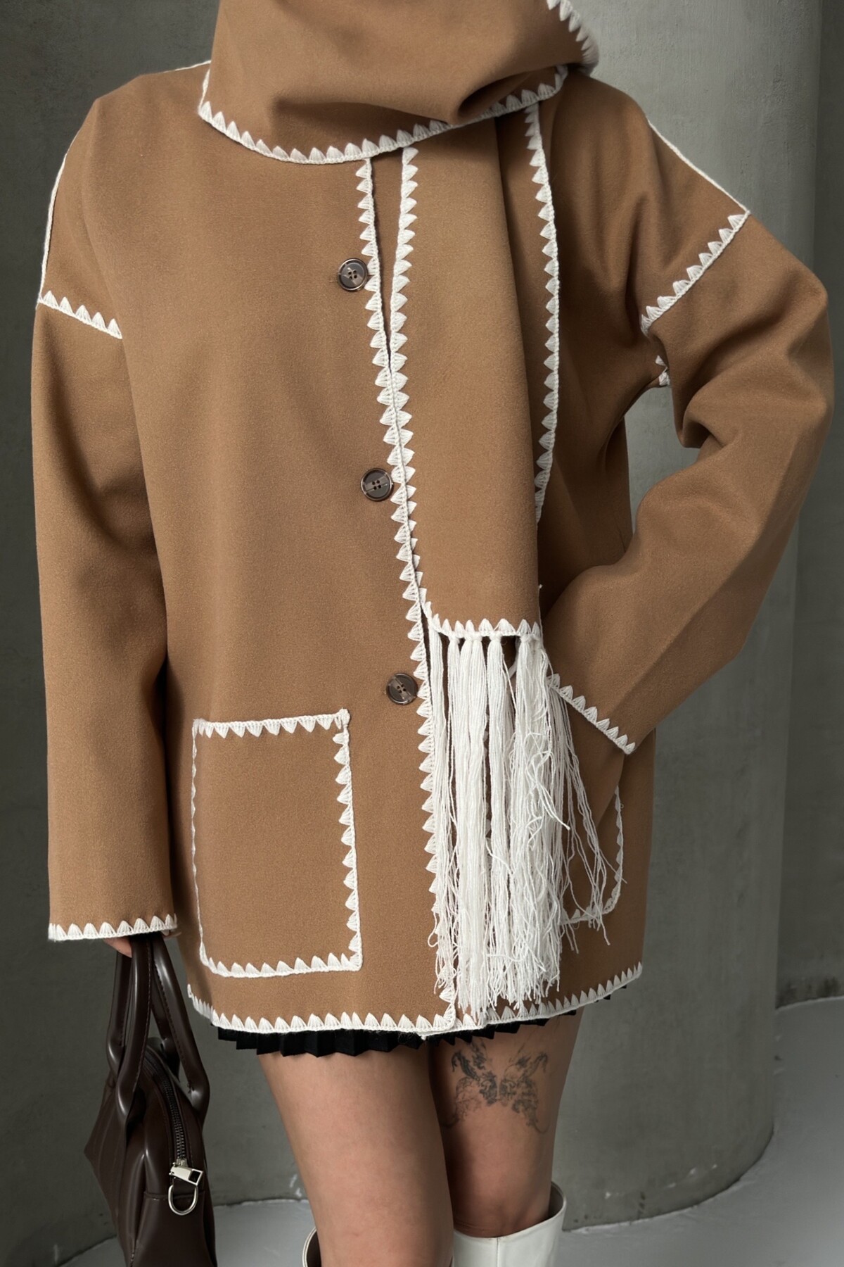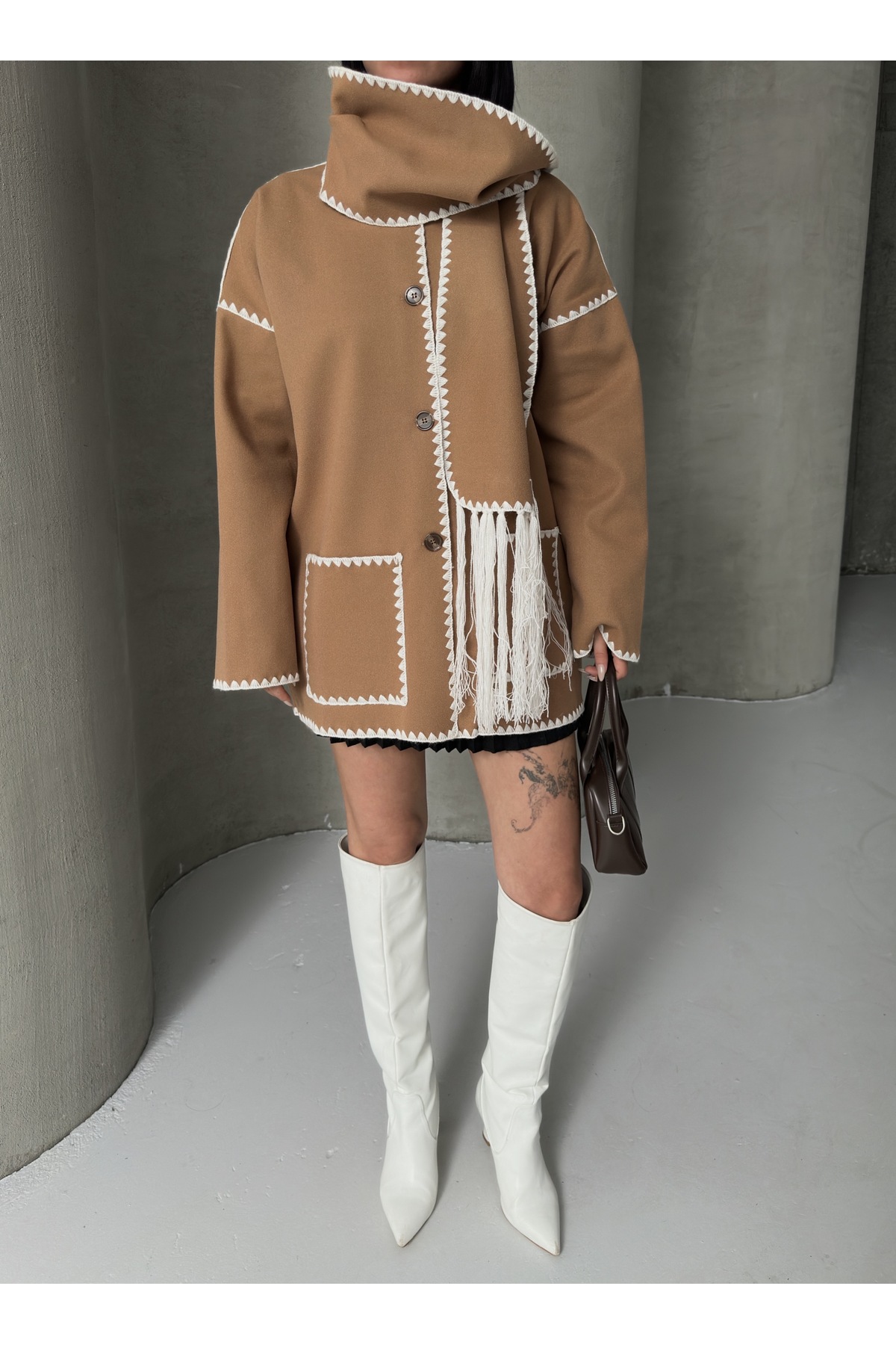Nakış Detaylı Atkılı Yumuşak Triko Hırka Ceket Bej