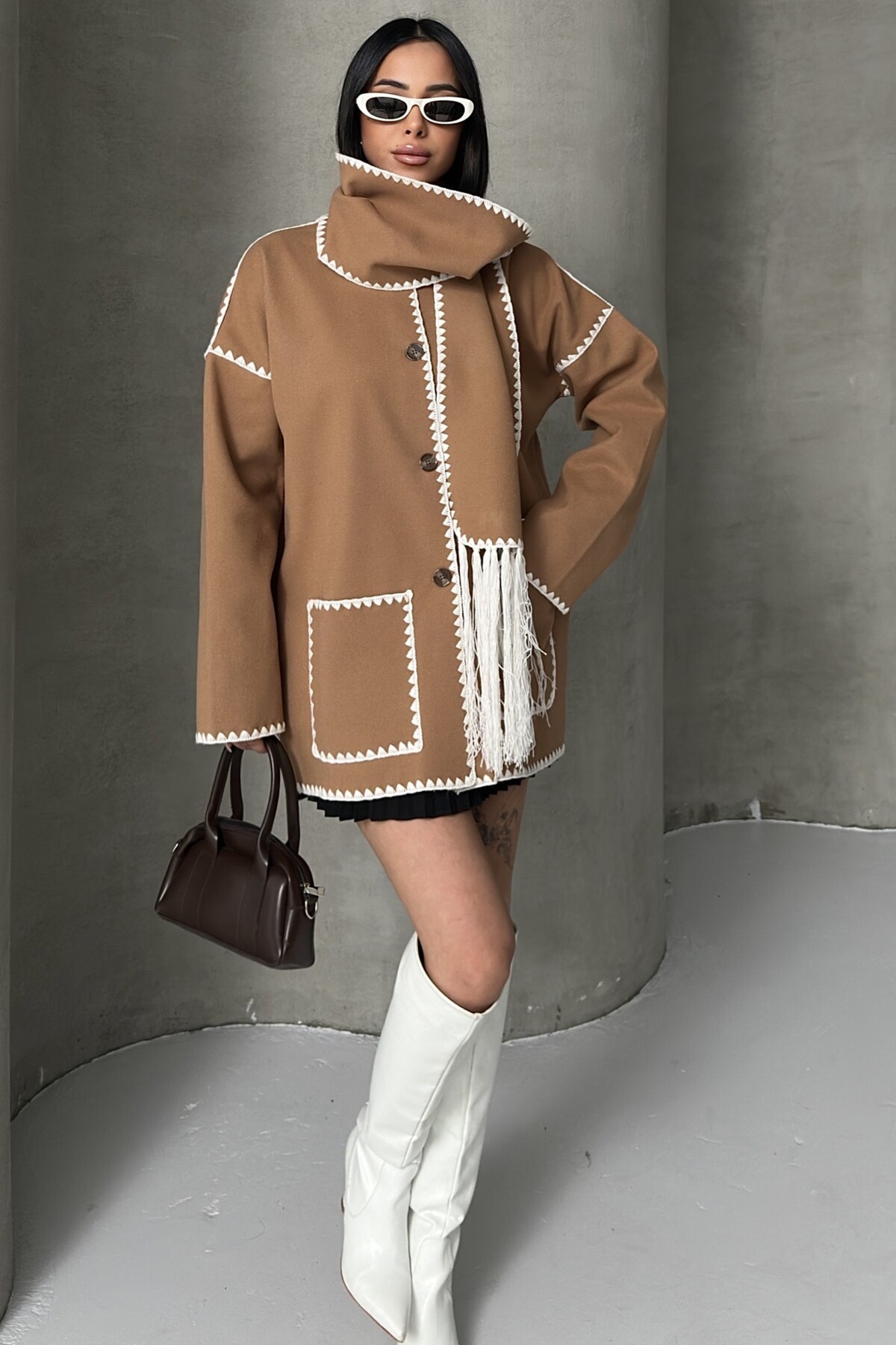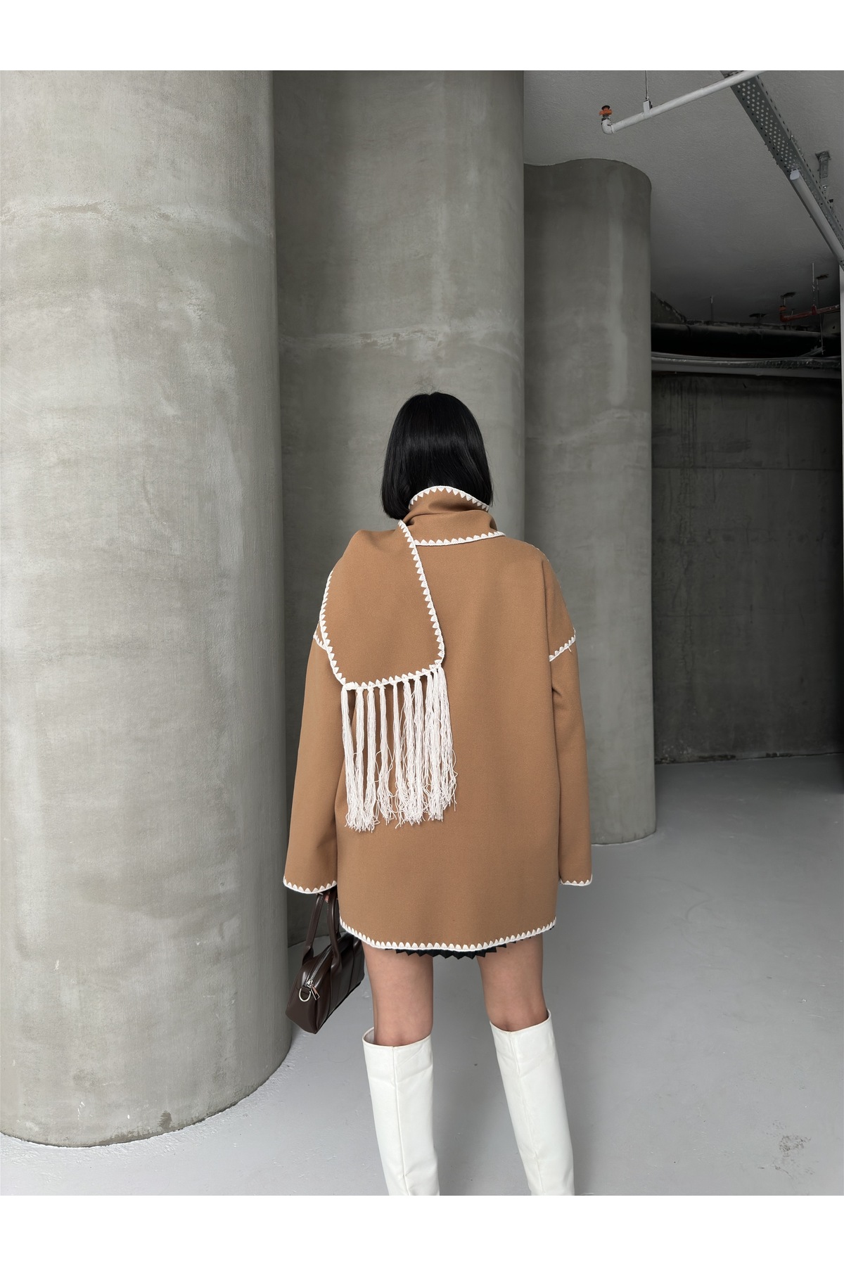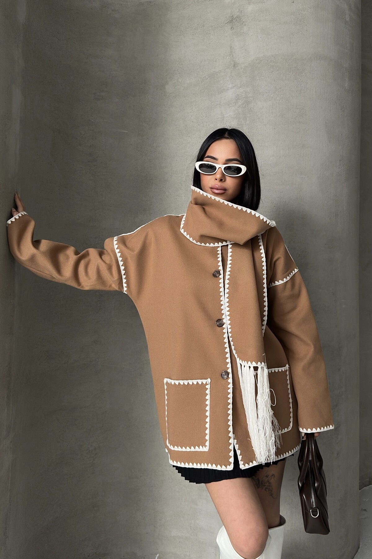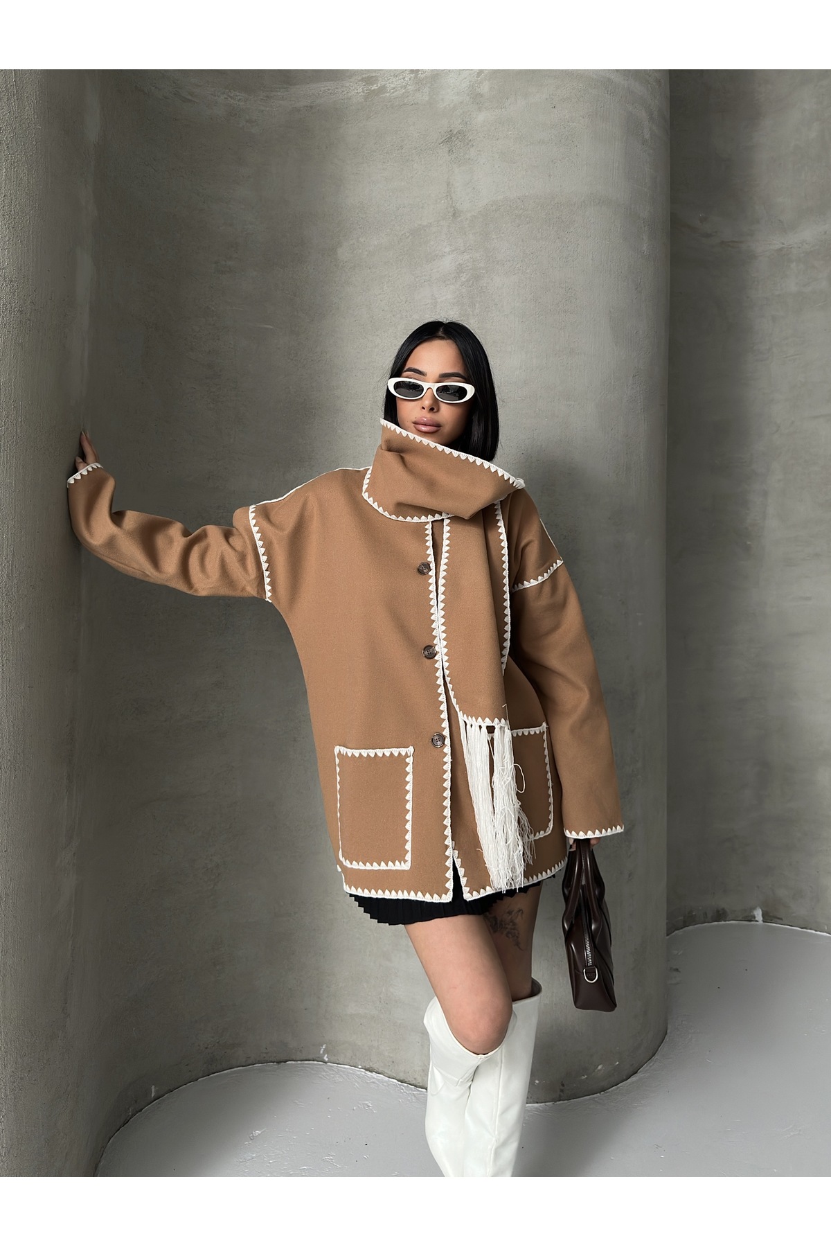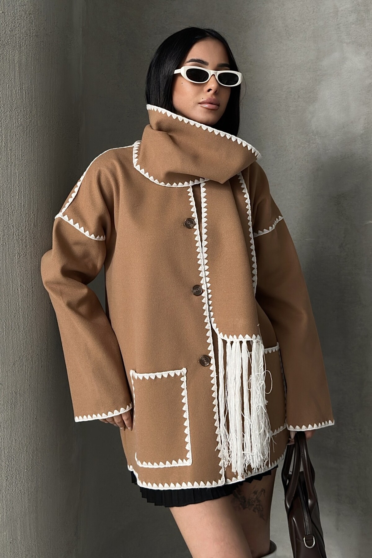 Nakış Detaylı Atkılı Yumuşak Triko Hırka Ceket Bej