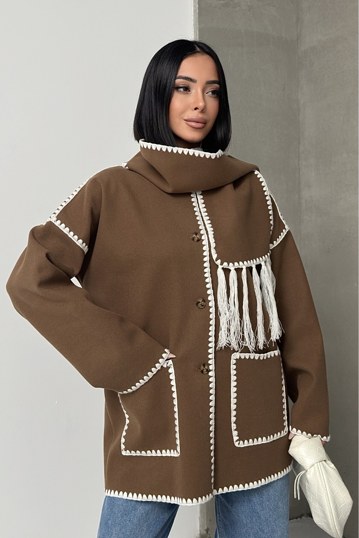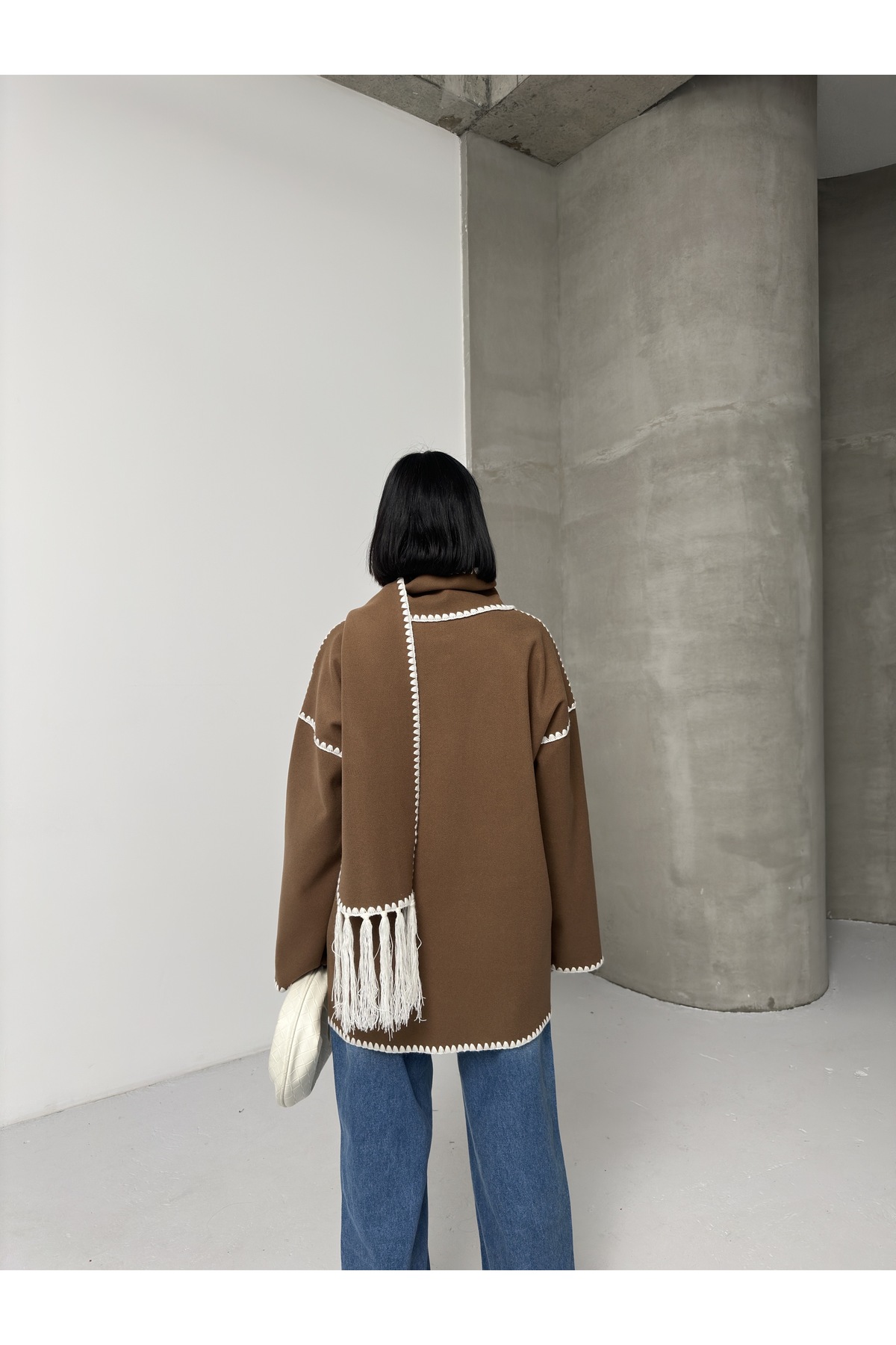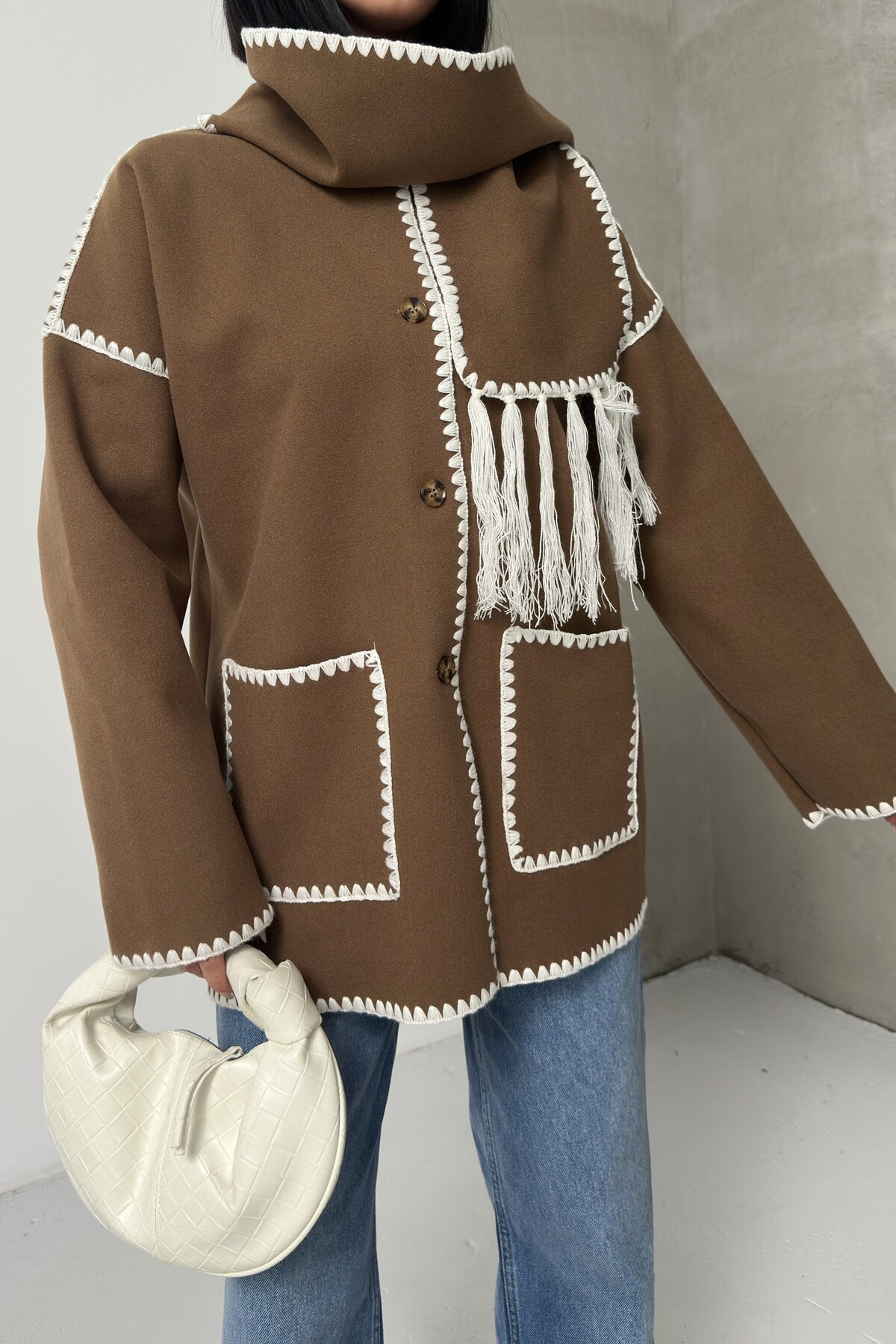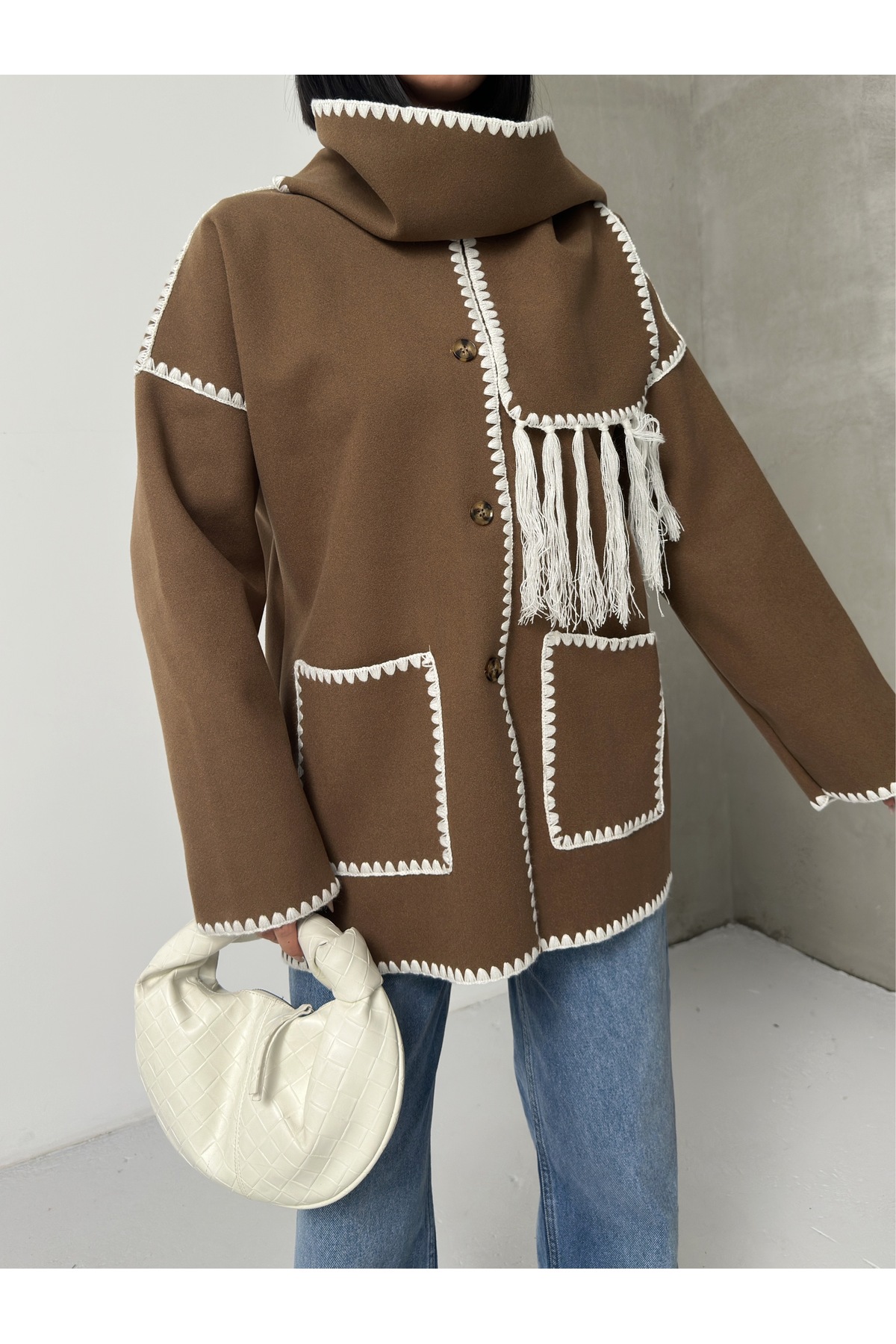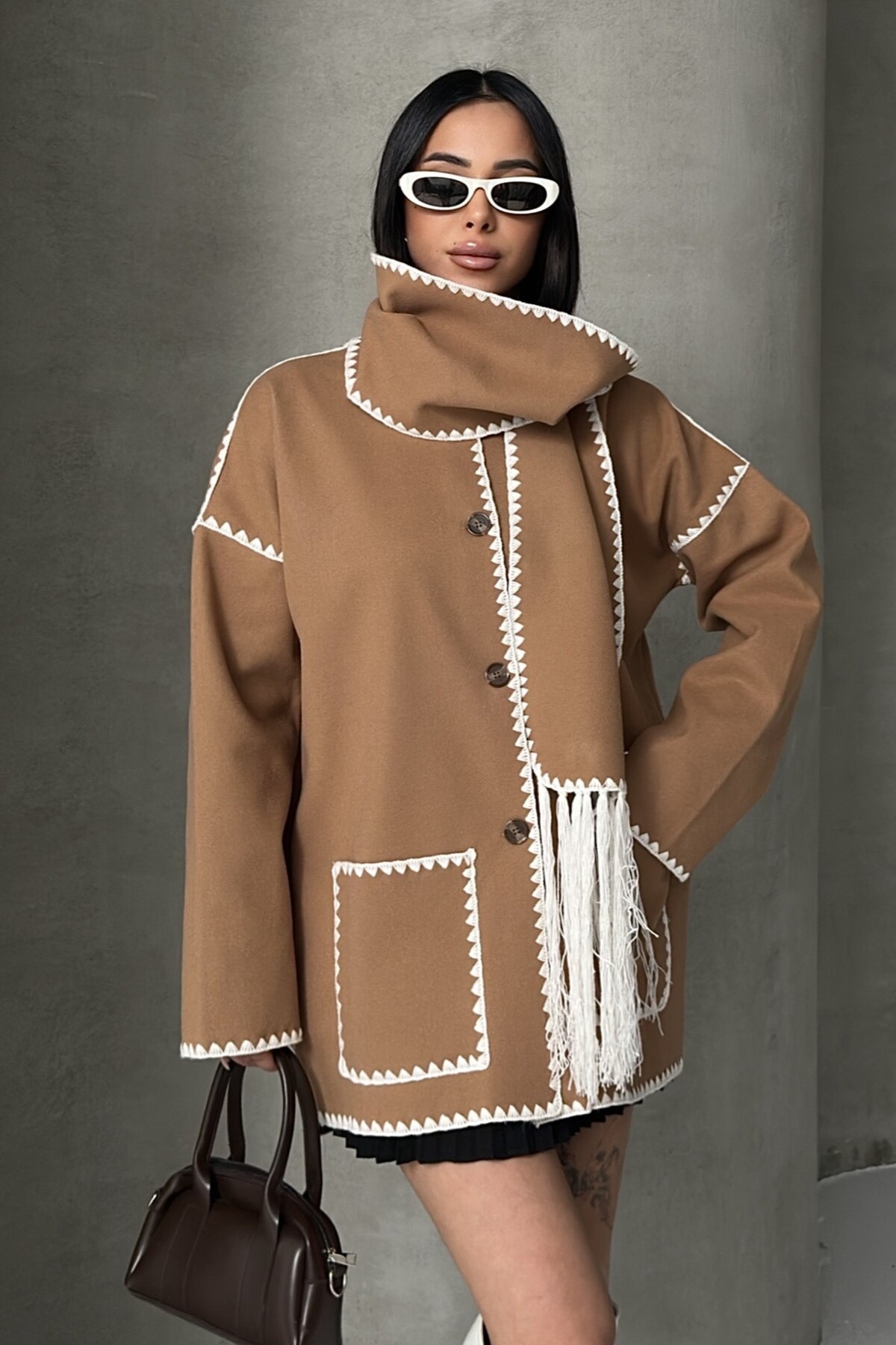 Nakış Detaylı Atkılı Yumuşak Triko Hırka Ceket Bej