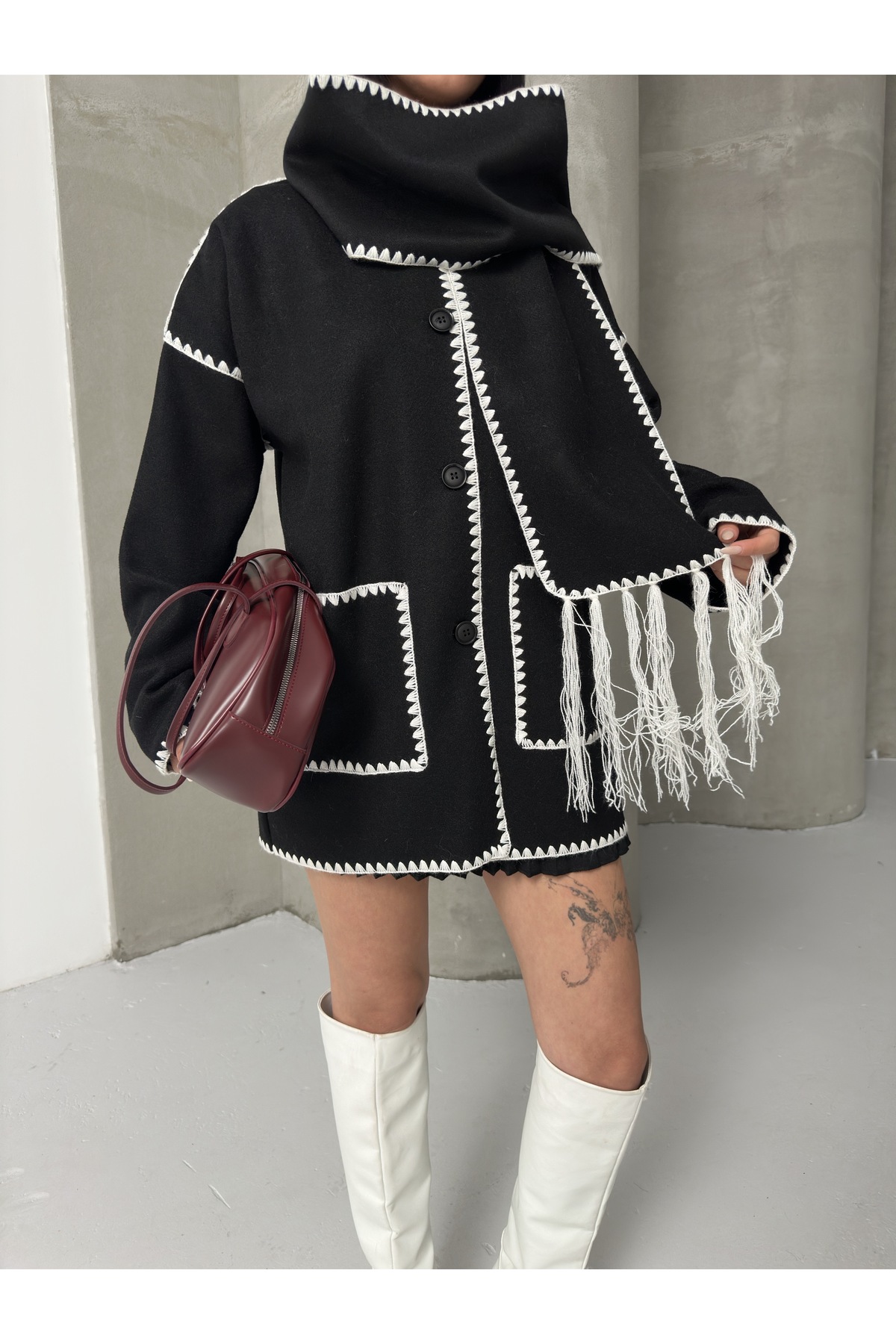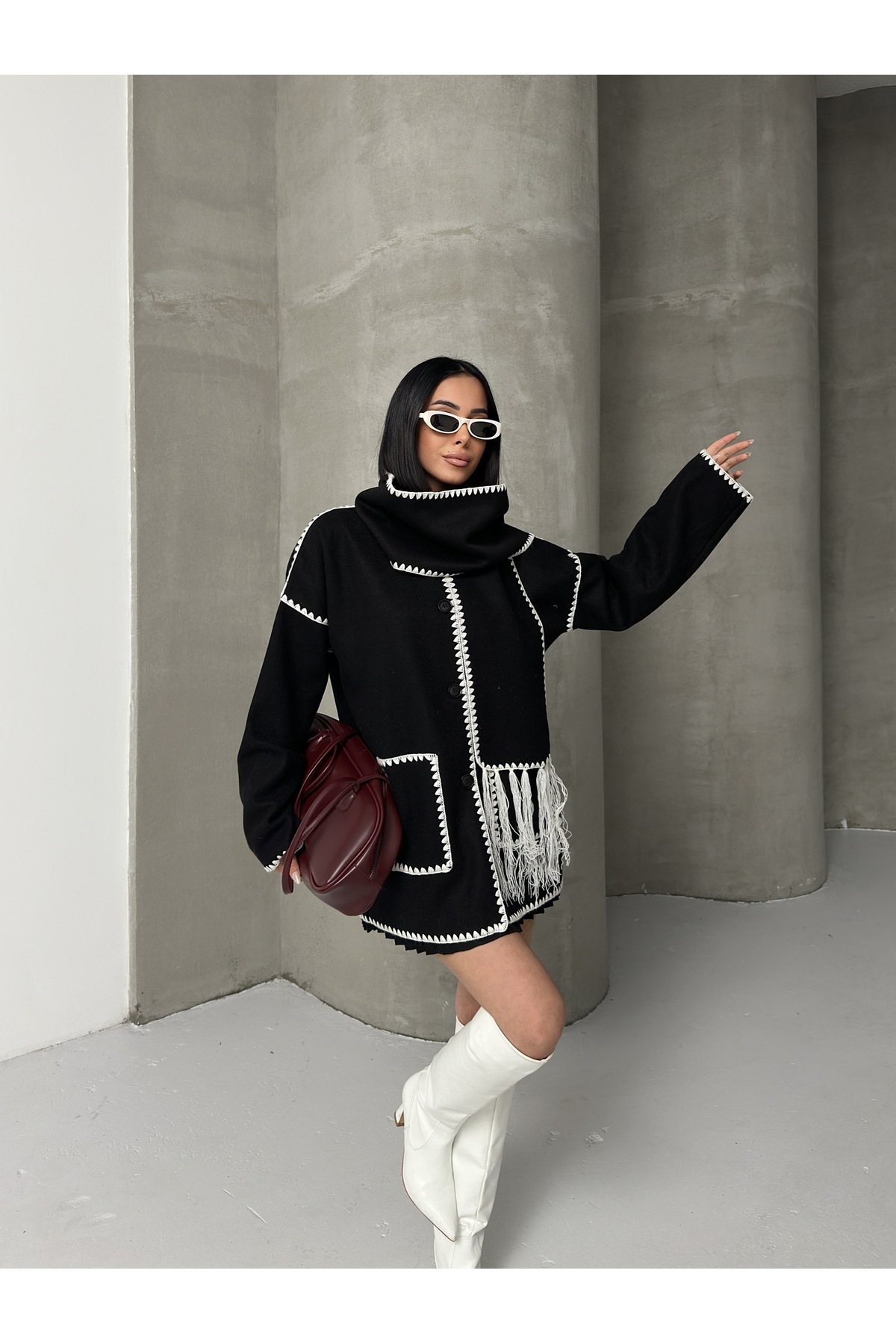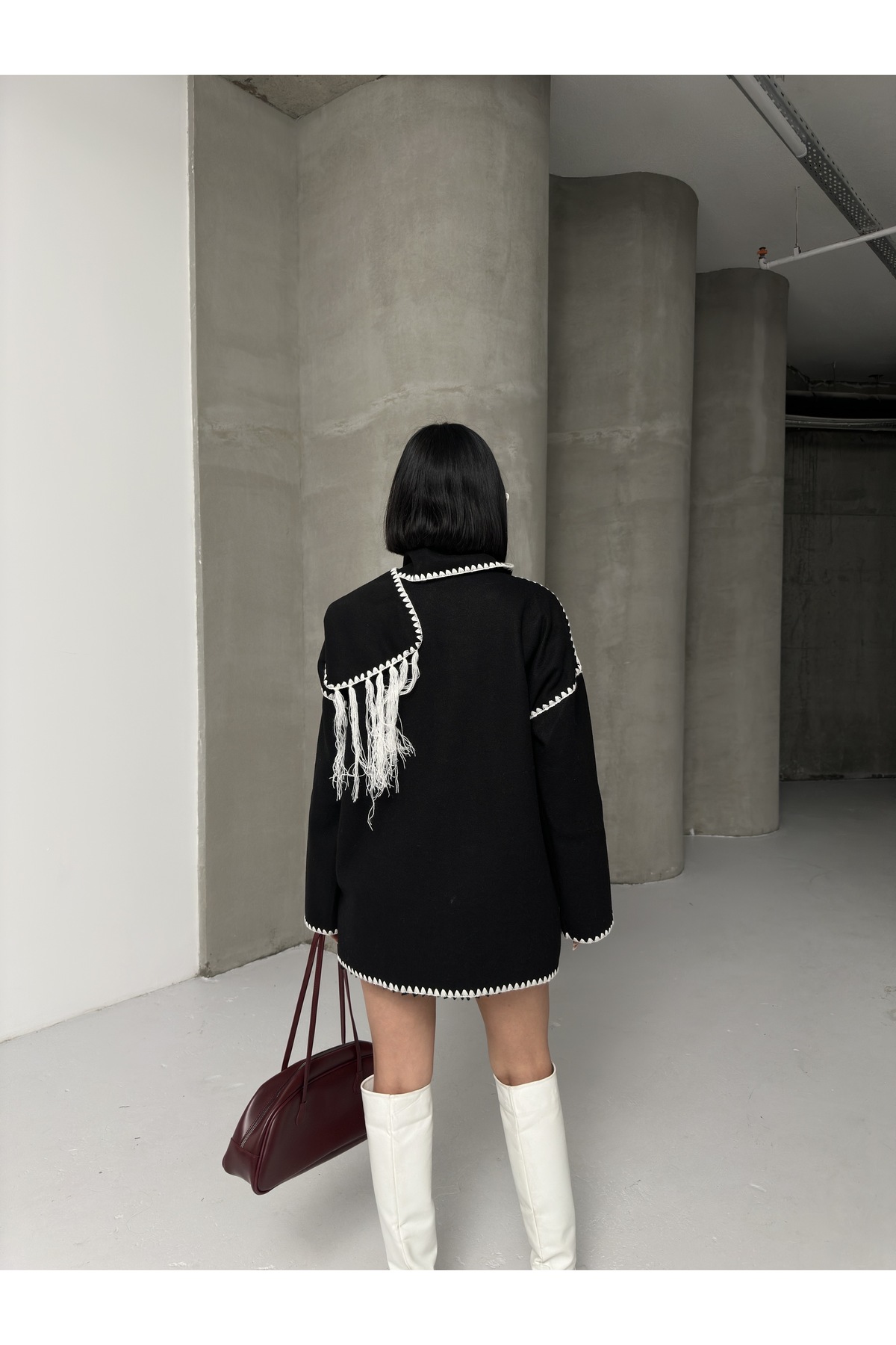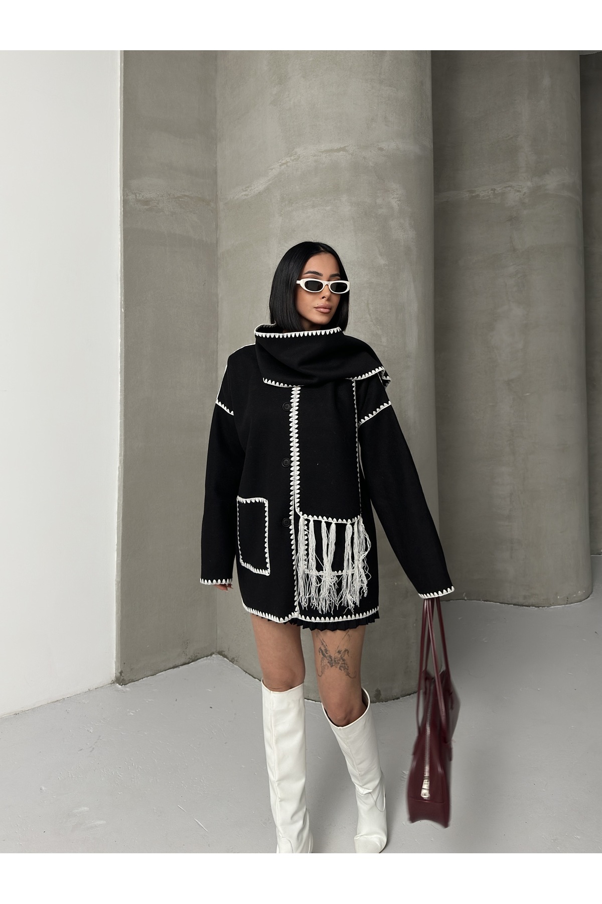 Nakış Detaylı Atkılı Yumuşak Triko Hırka Ceket Siyah