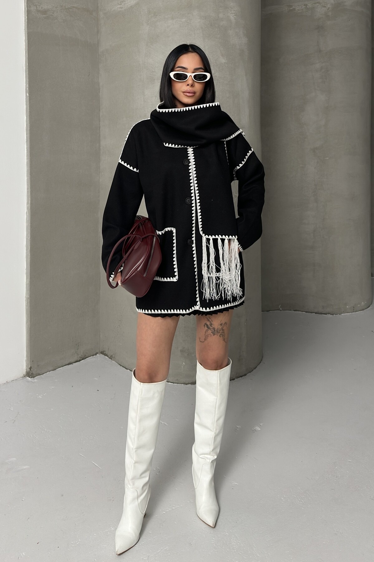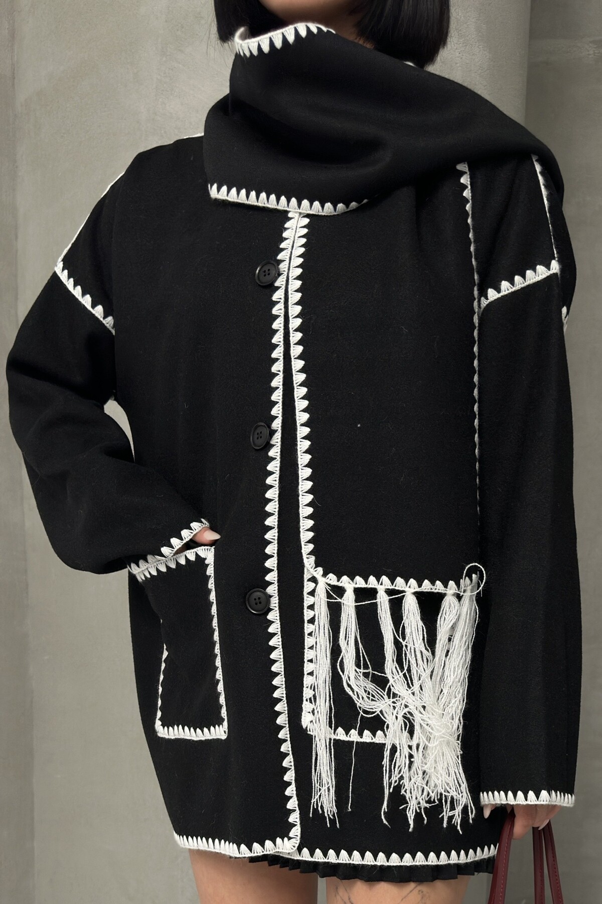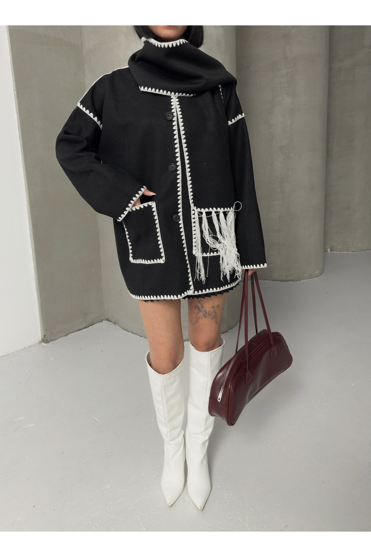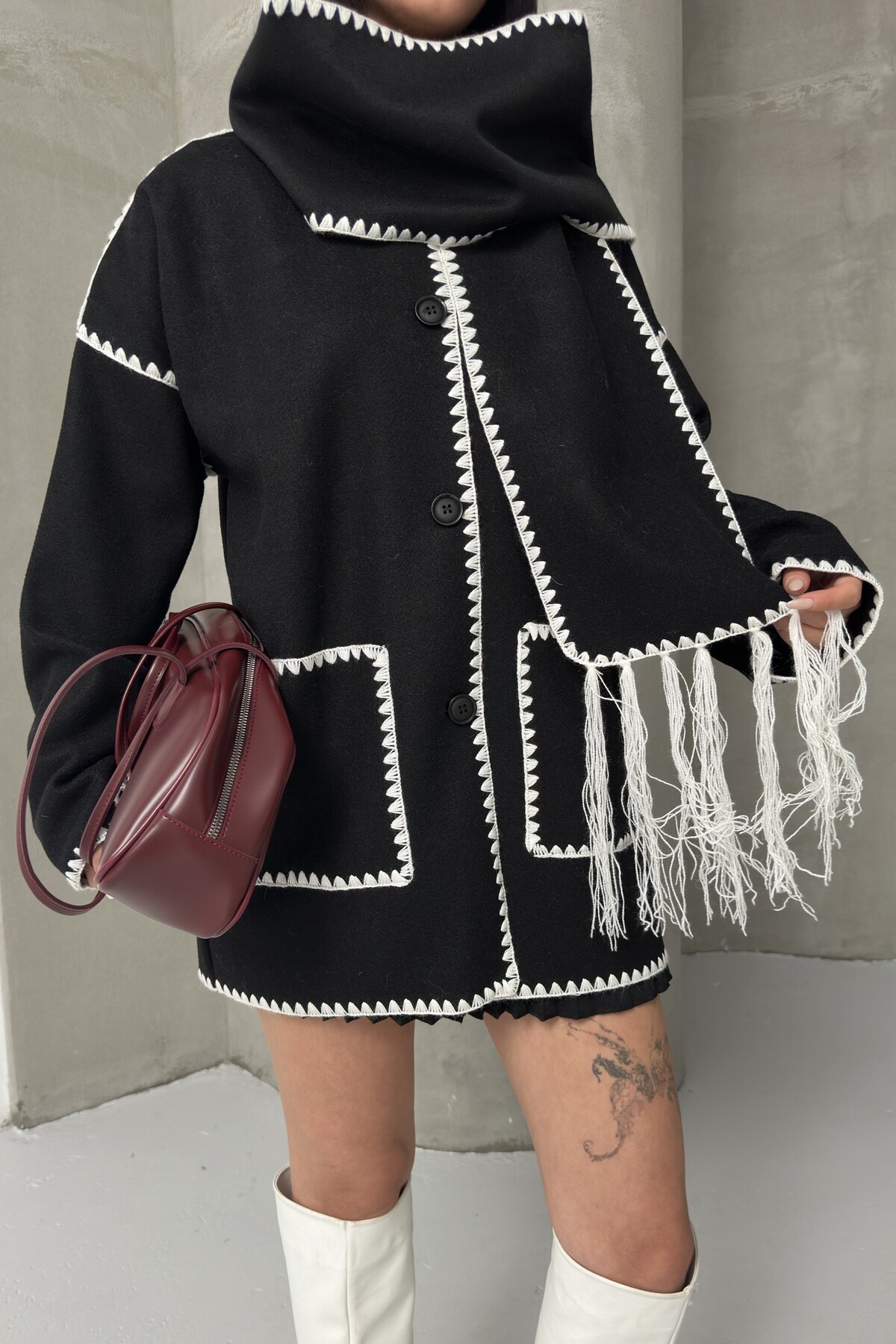 Nakış Detaylı Atkılı Yumuşak Triko Hırka Ceket Siyah