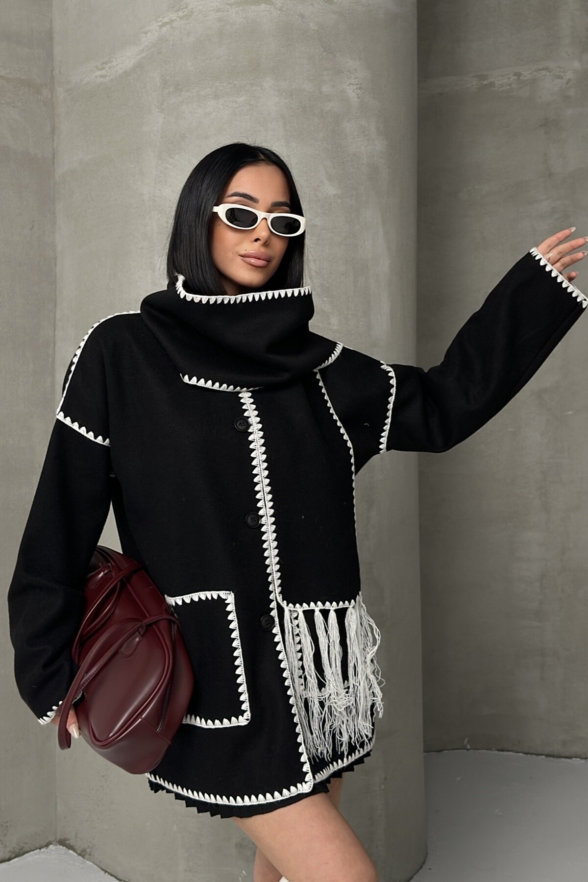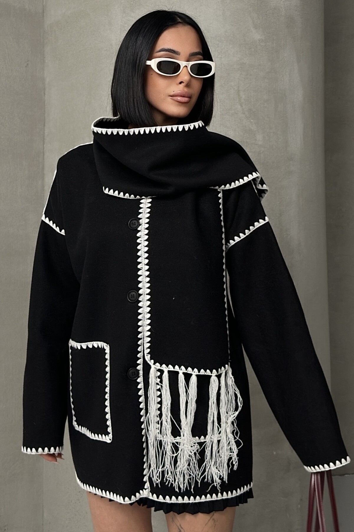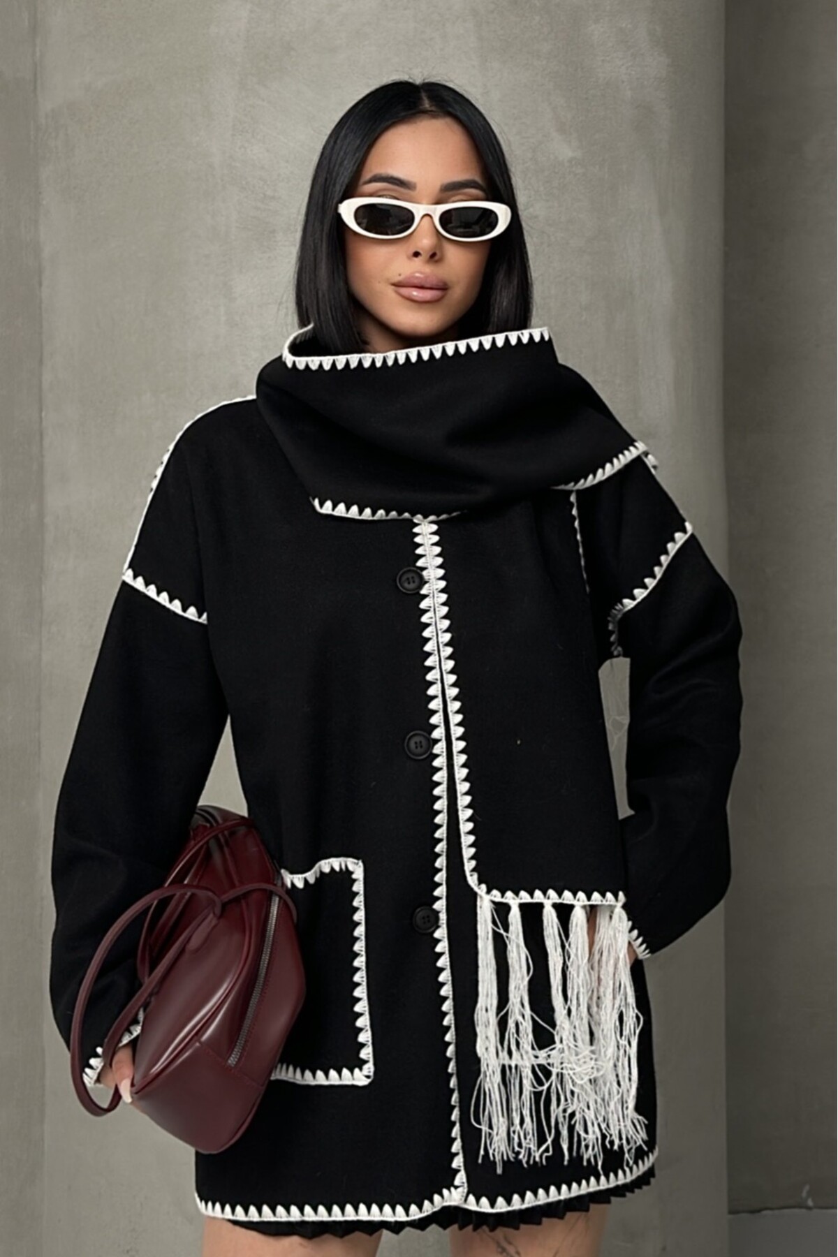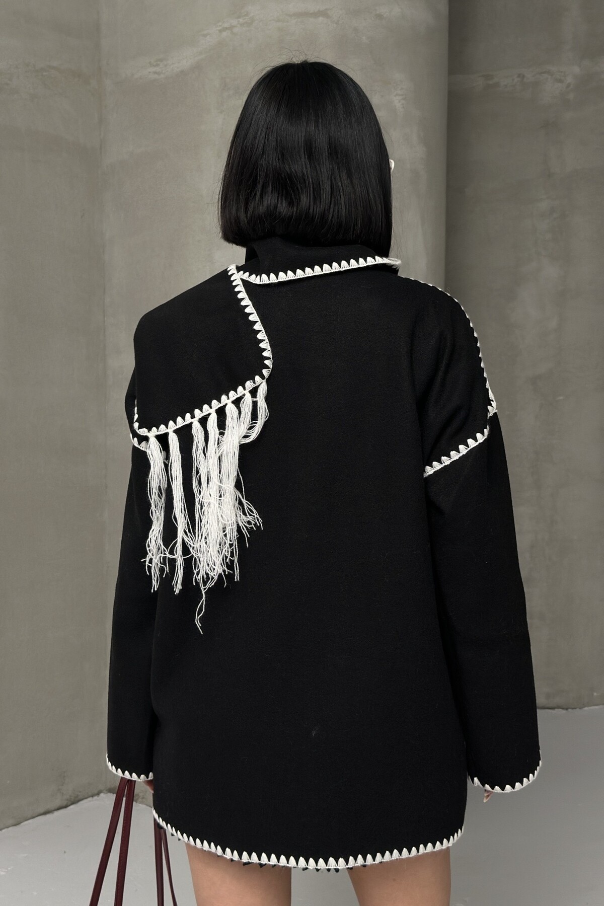 Nakış Detaylı Atkılı Yumuşak Triko Hırka Ceket Siyah