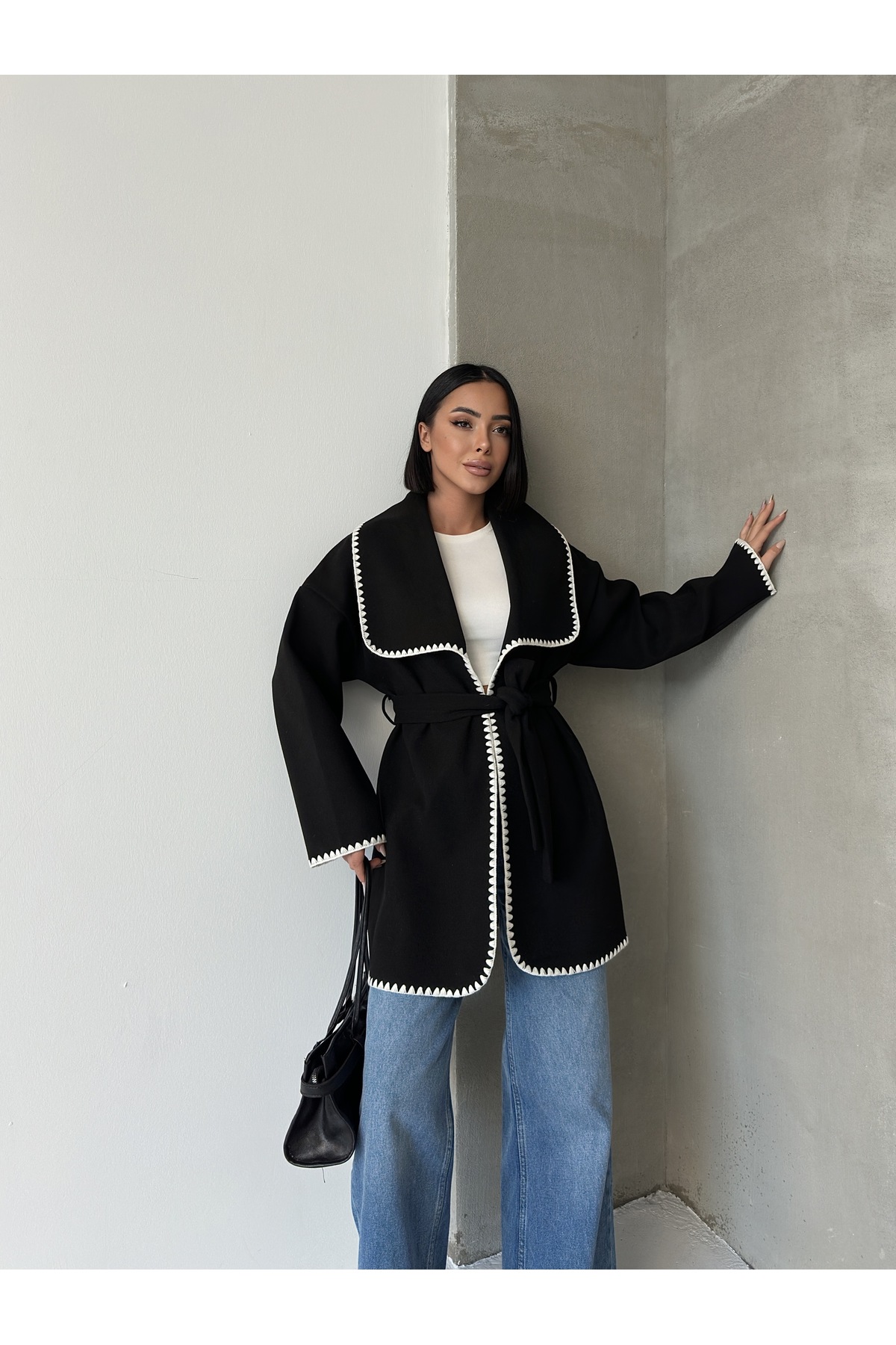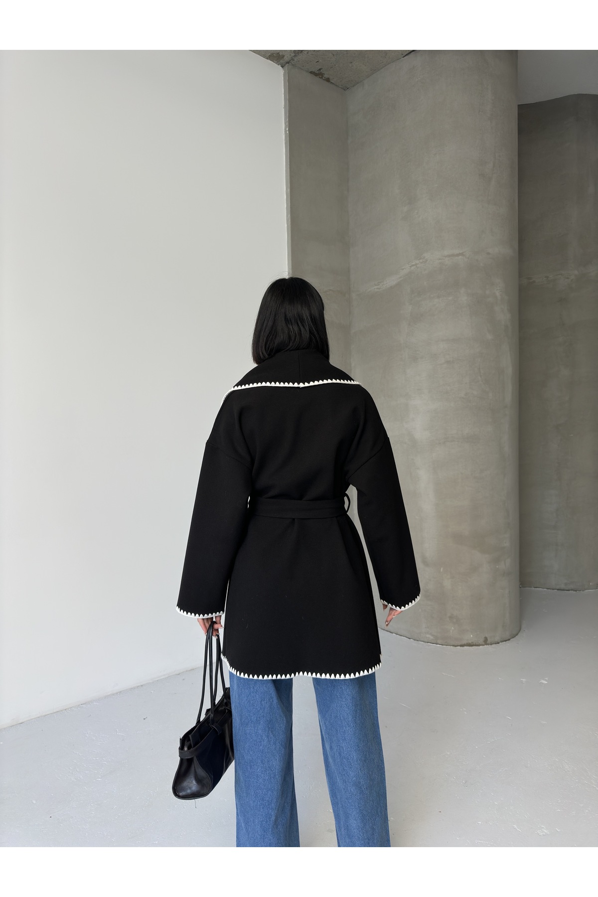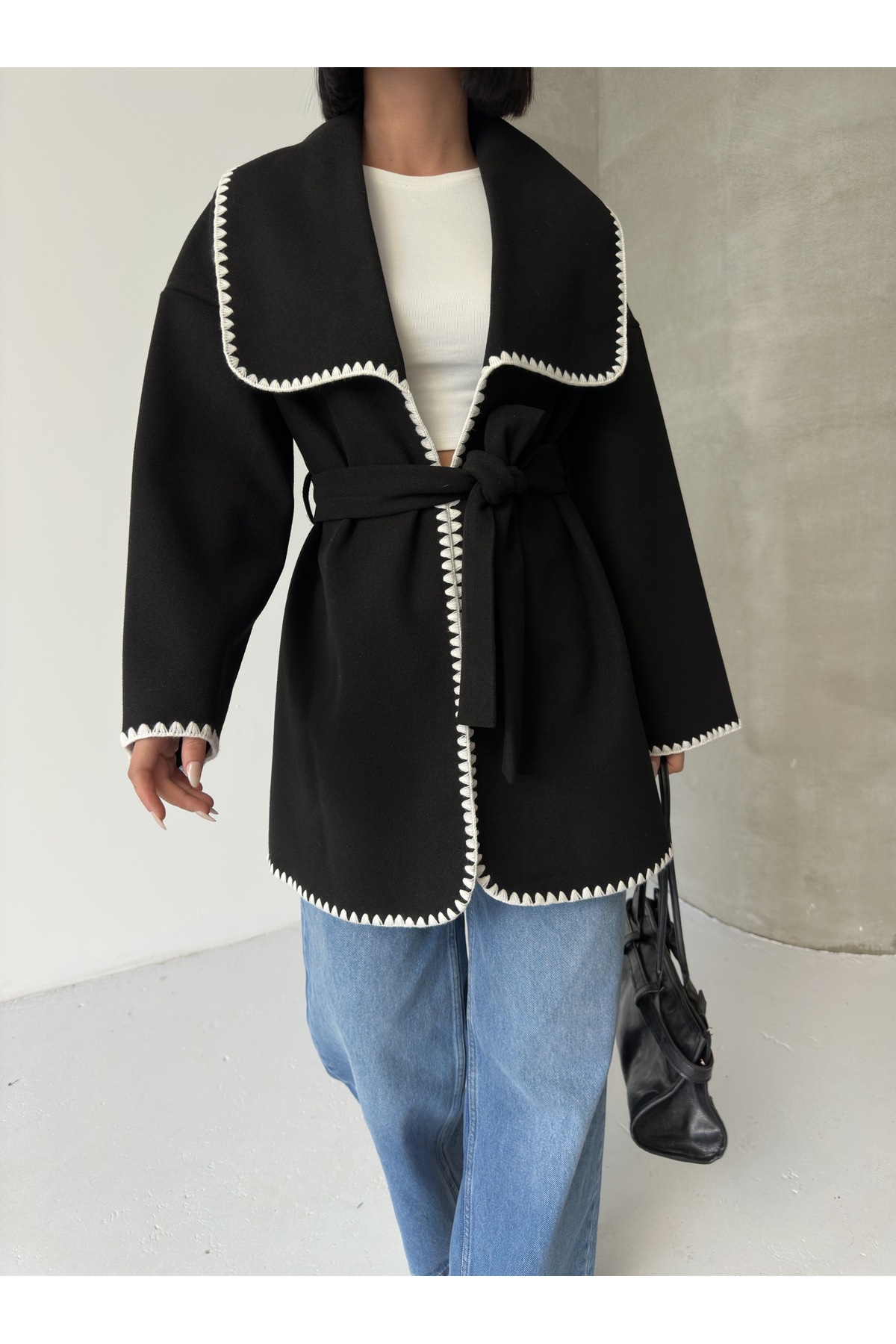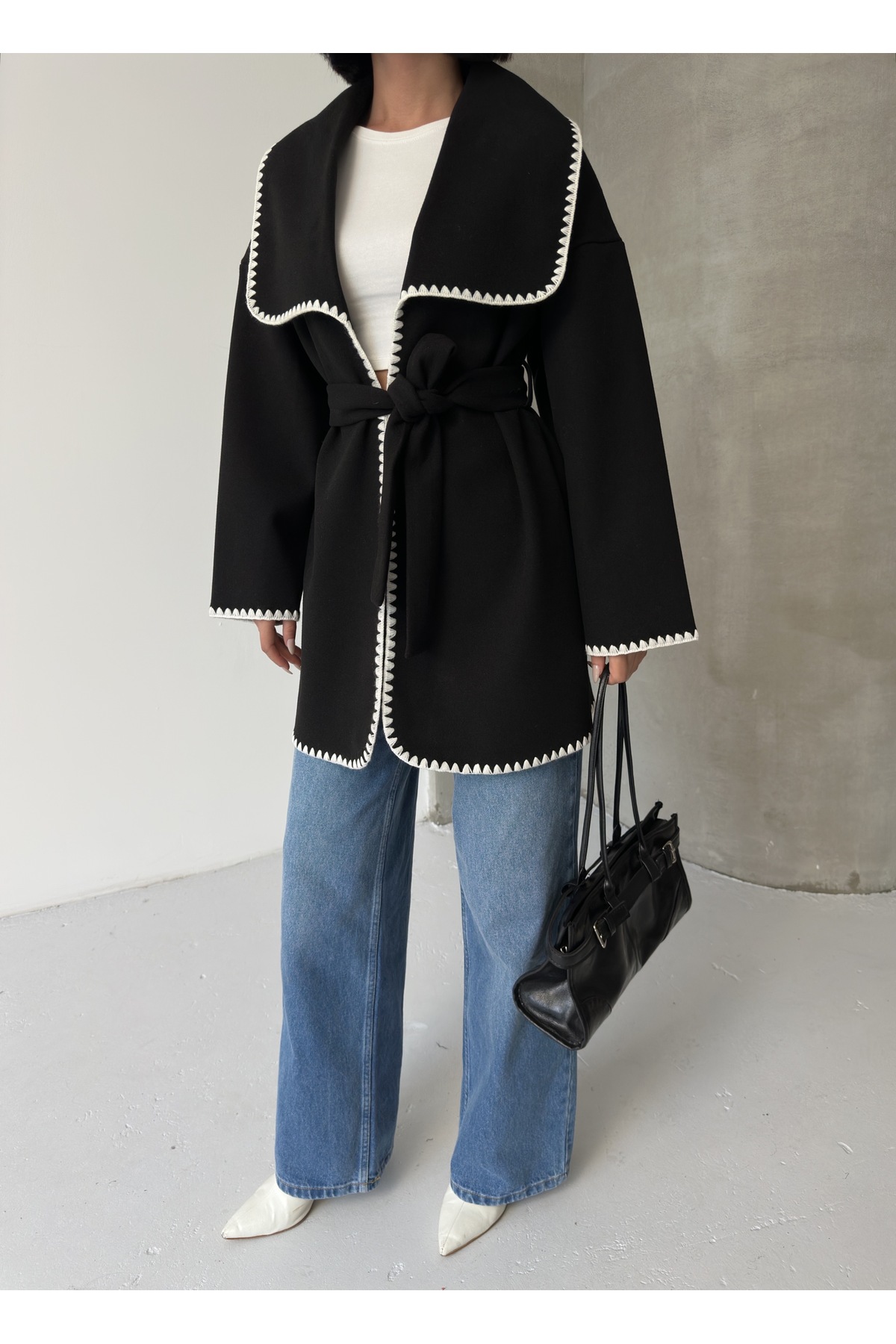 Nakış Detaylı Kemerli Yumuşak Siyah Ceket