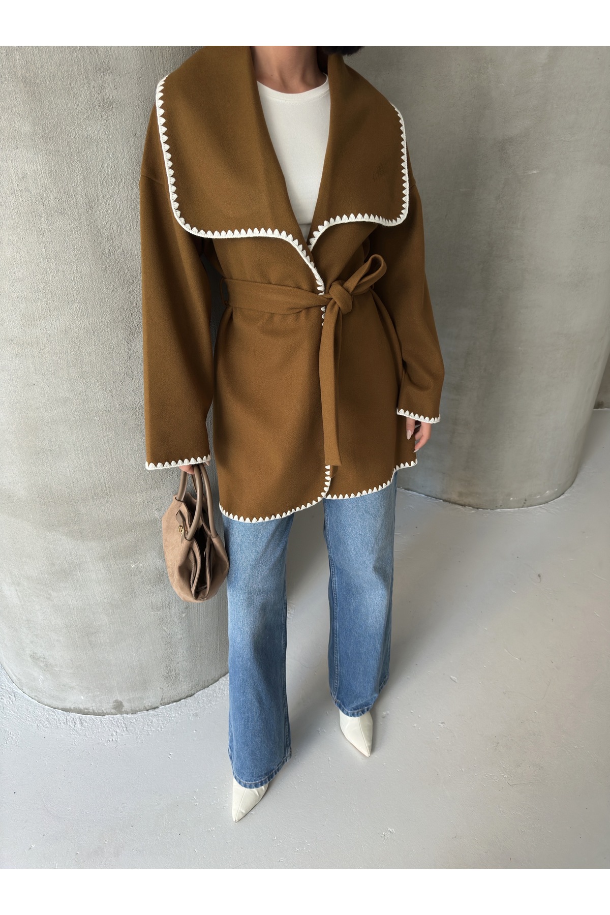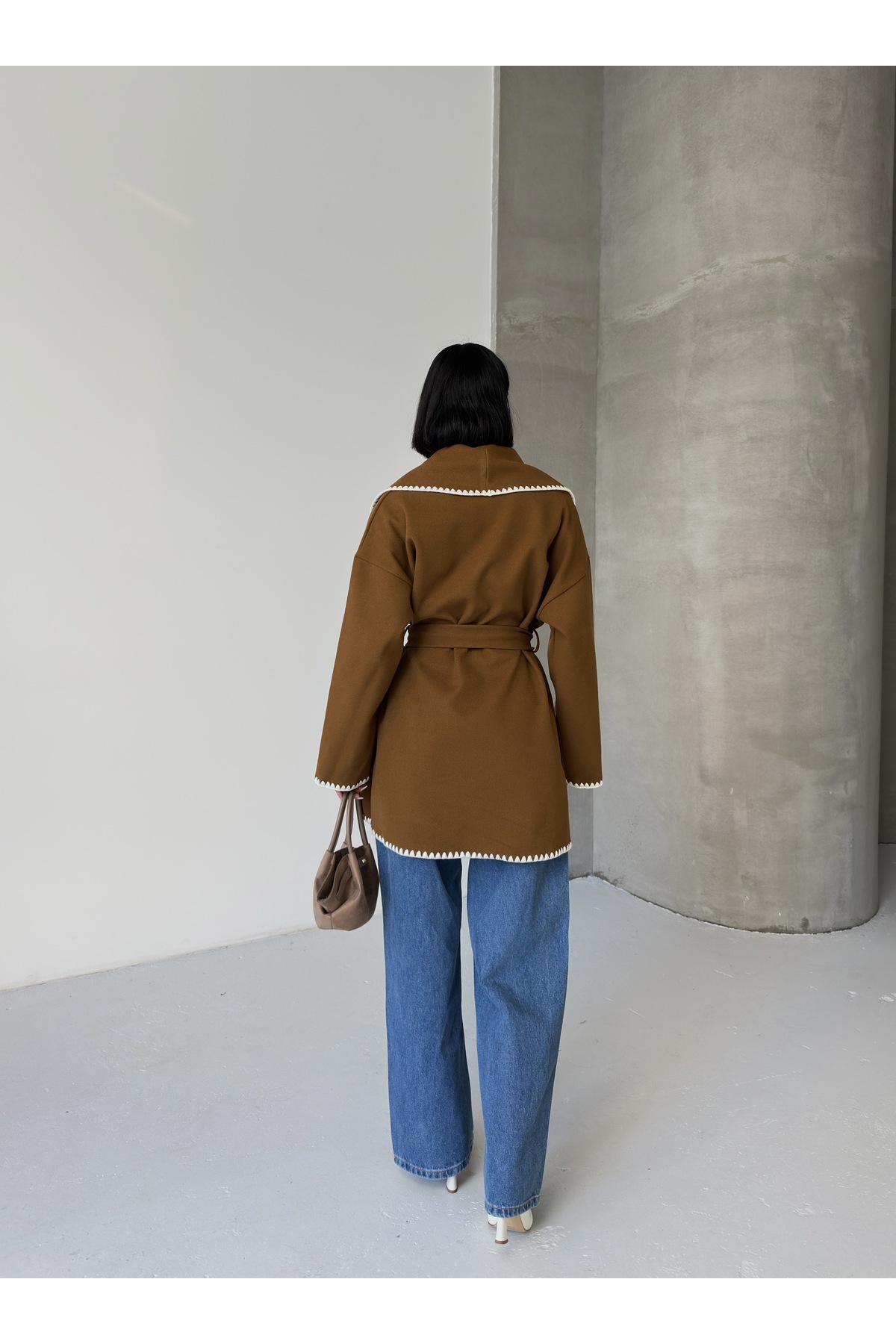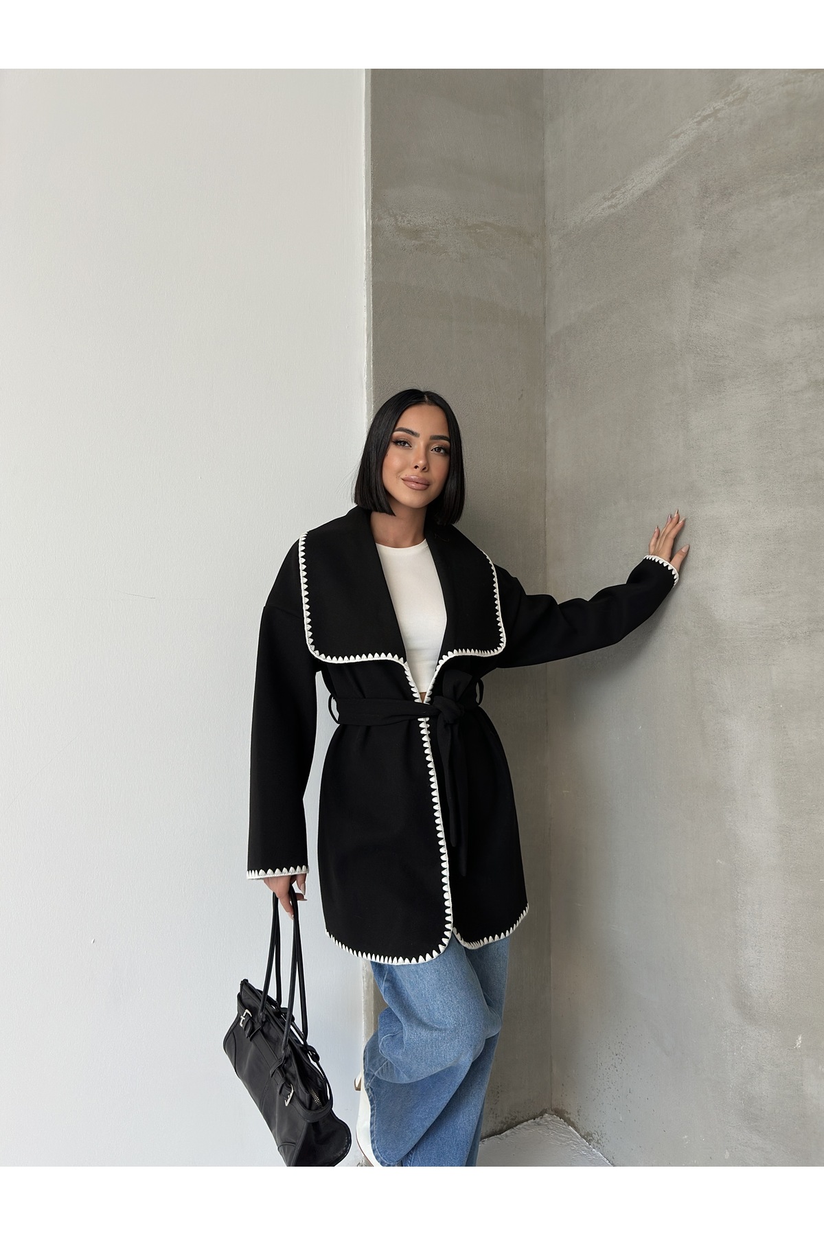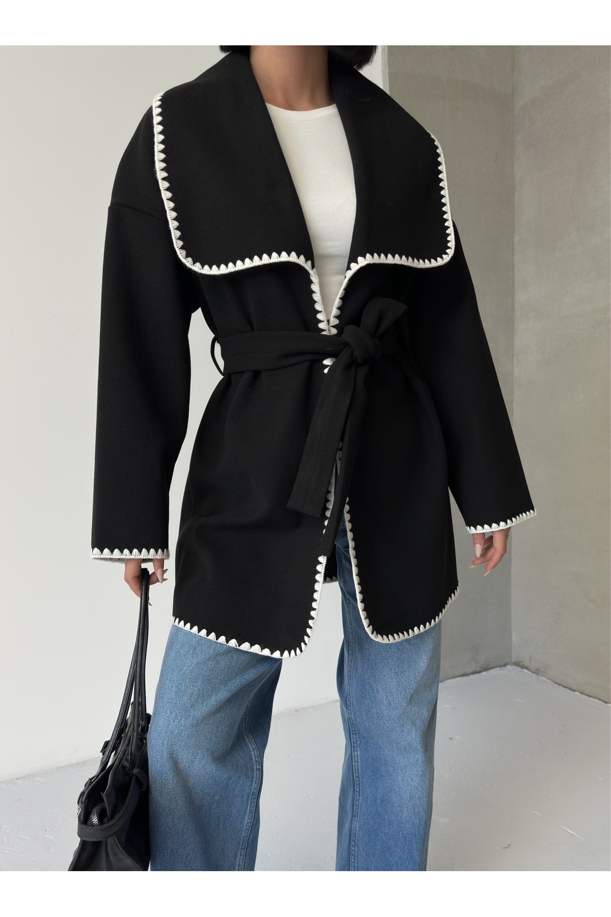 Nakış Detaylı Kemerli Yumuşak Siyah Ceket