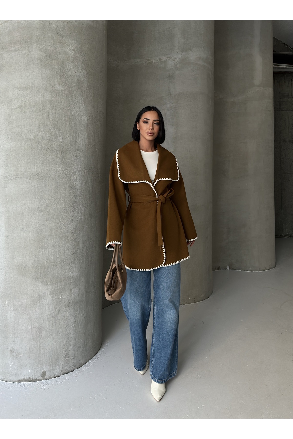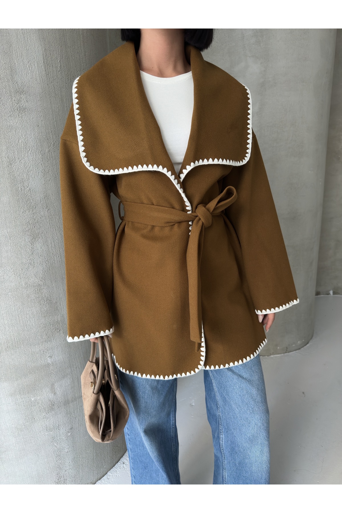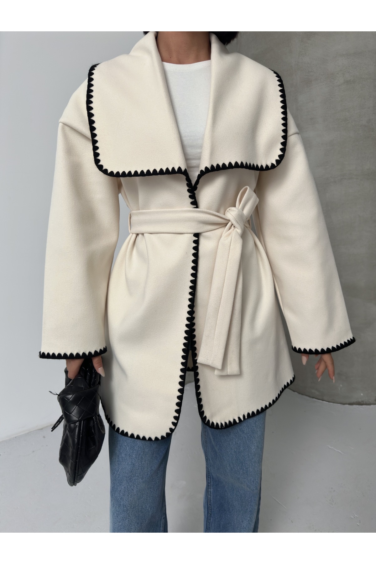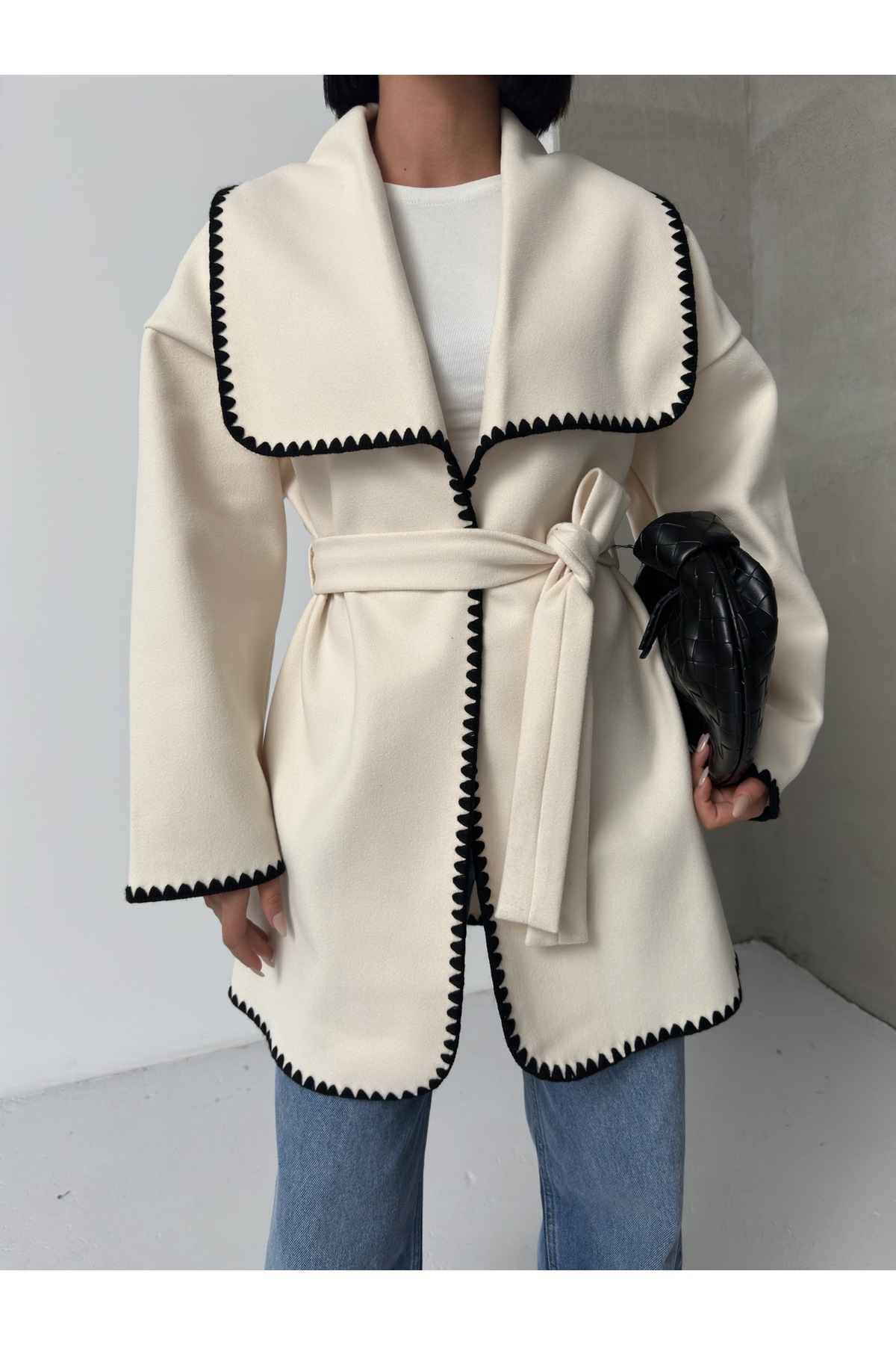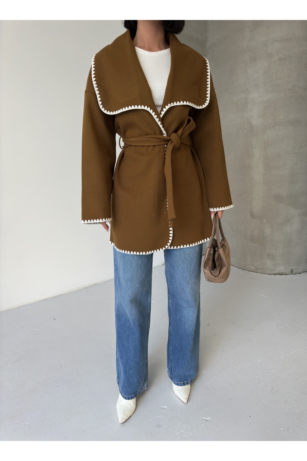 Nakış Detaylı Kemerli Yumuşak Siyah Ceket