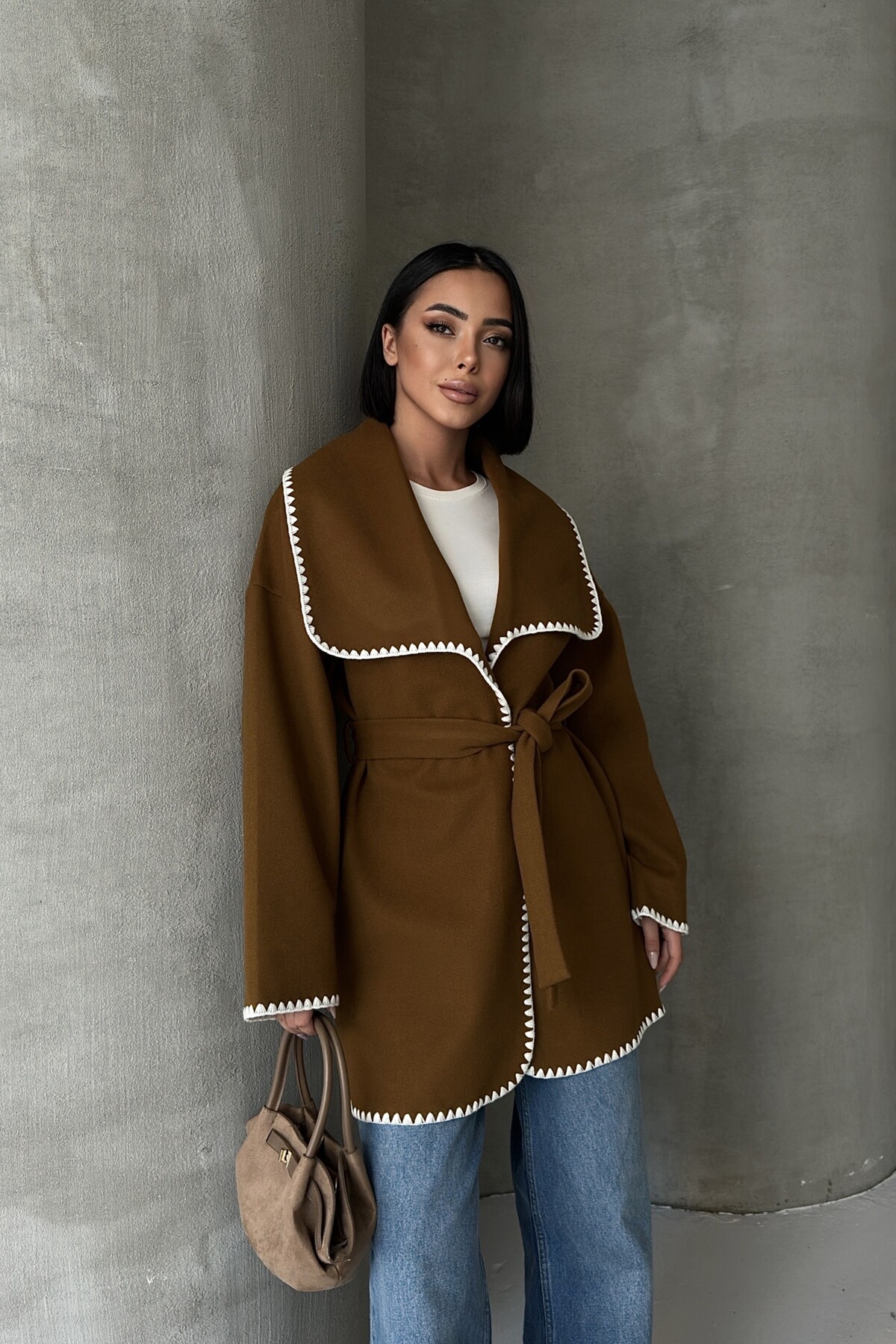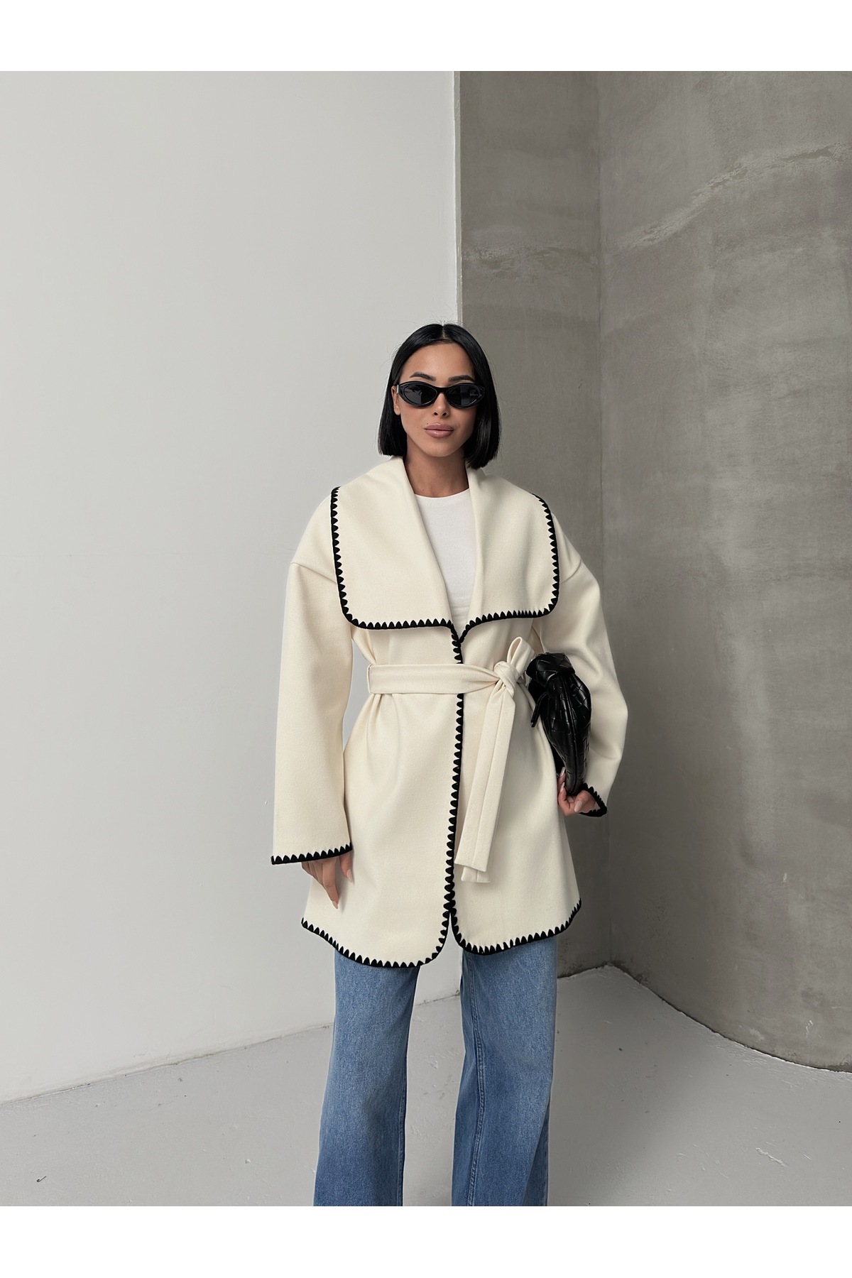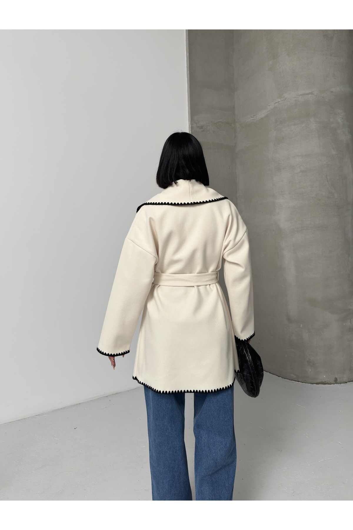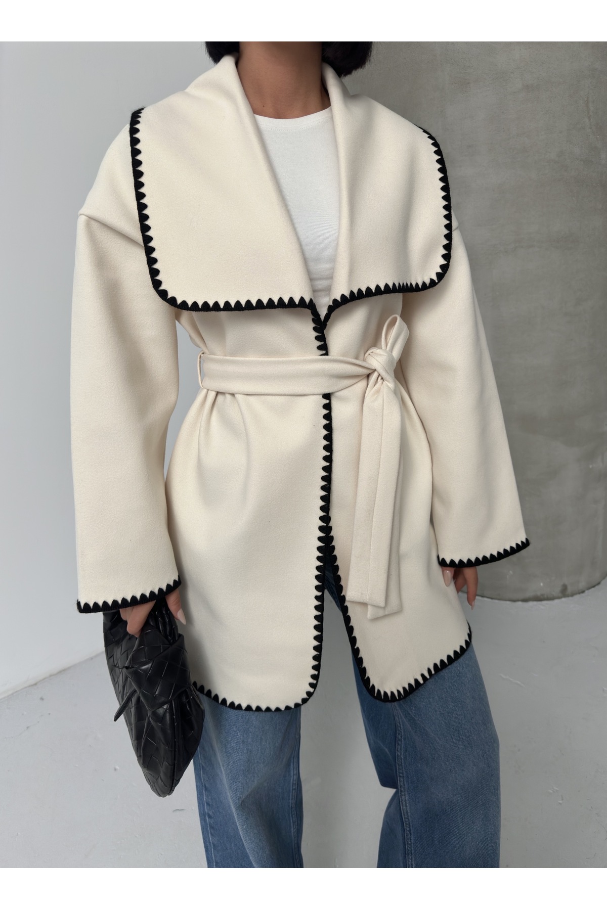 Nakış Detaylı Kemerli Yumuşak Siyah Ceket