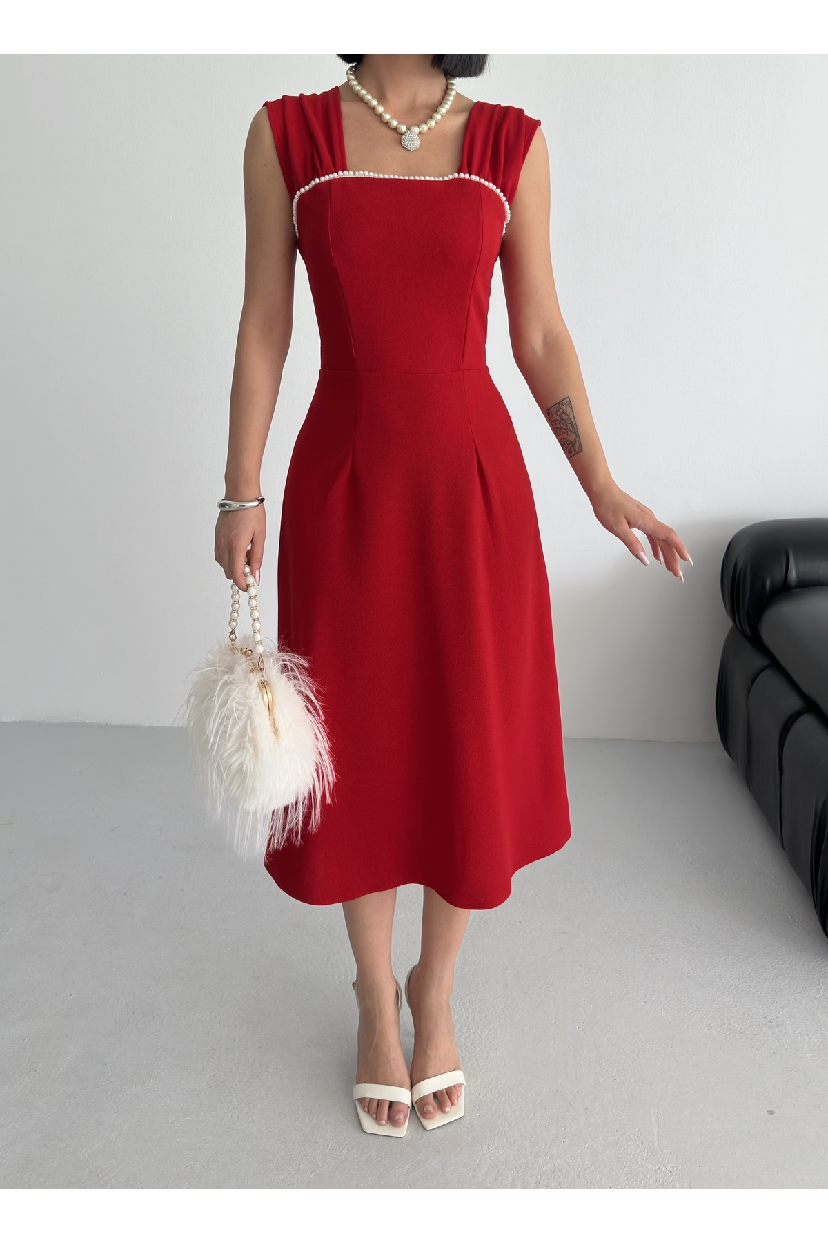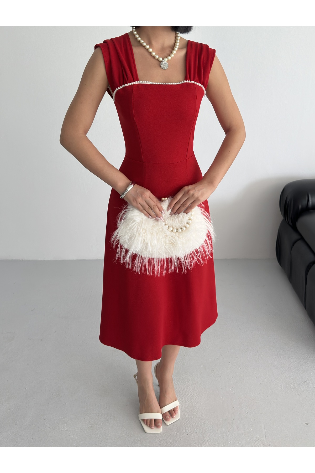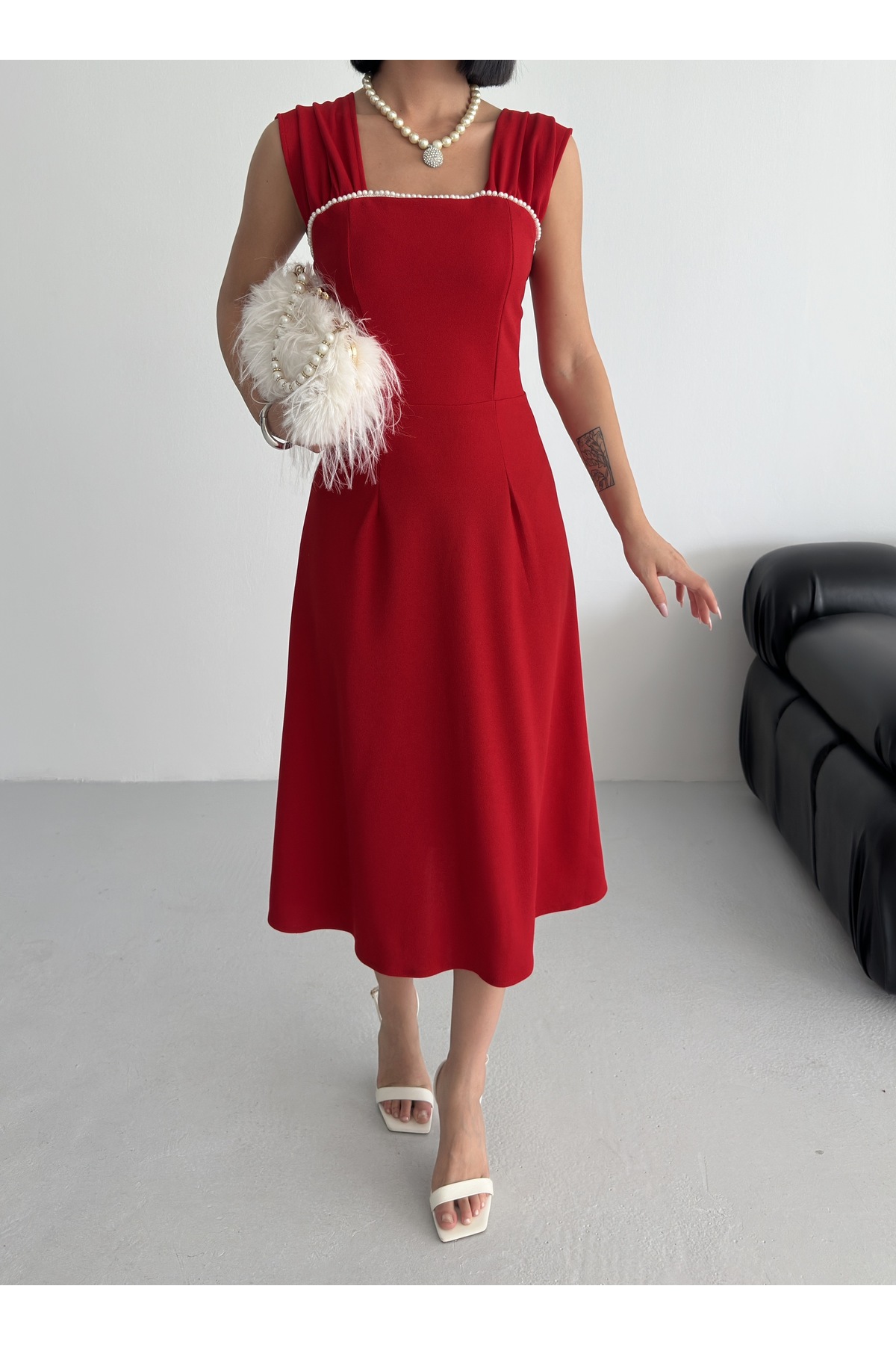 Özel Tasarım İnce Detay Kırmızı Midi Elbise