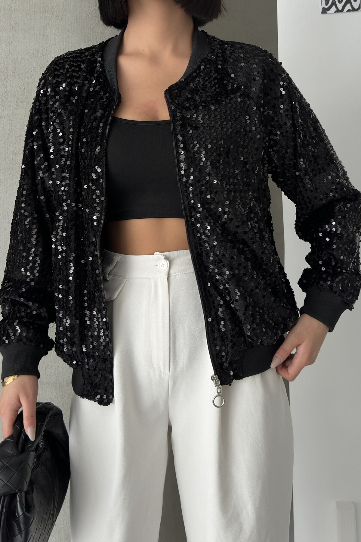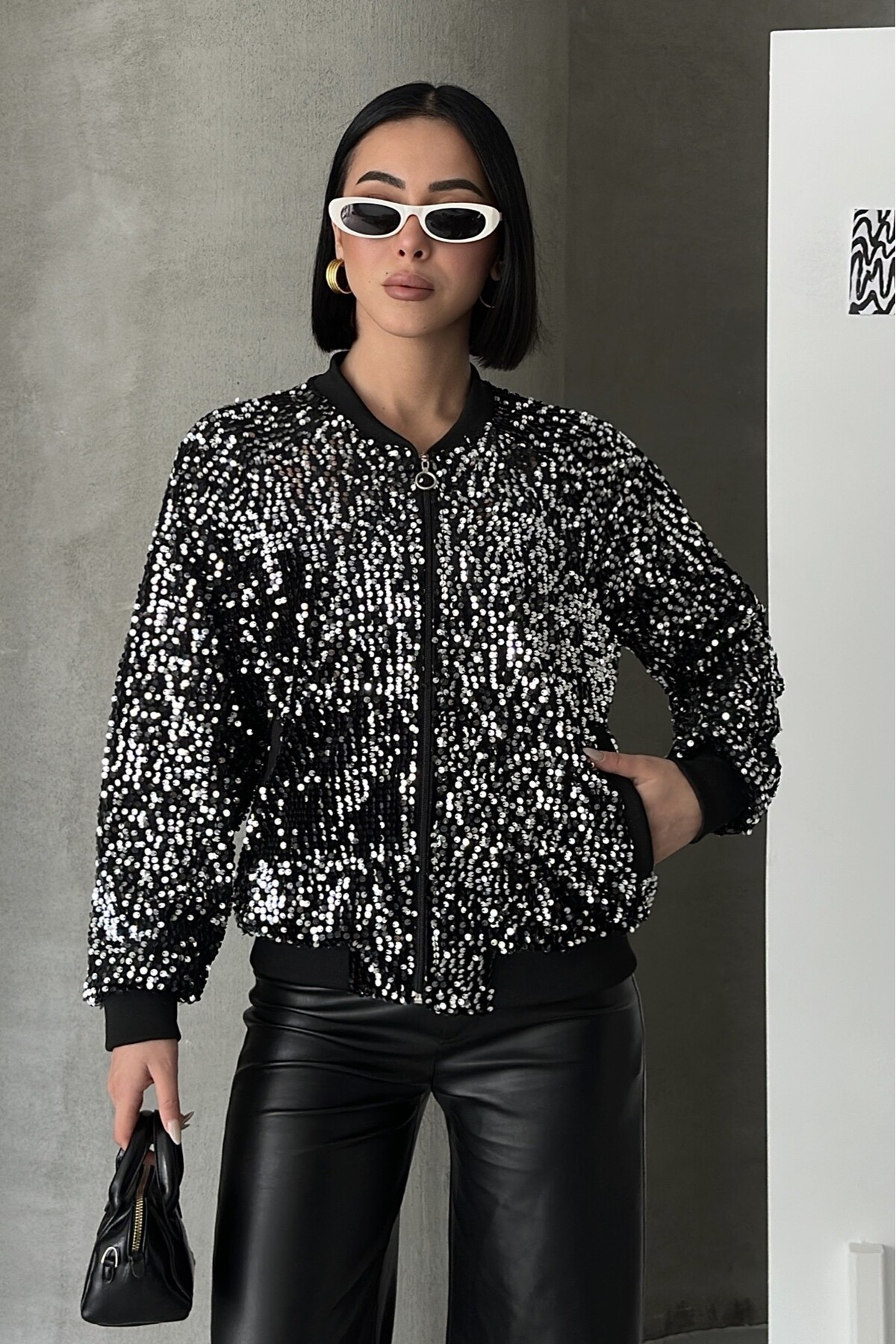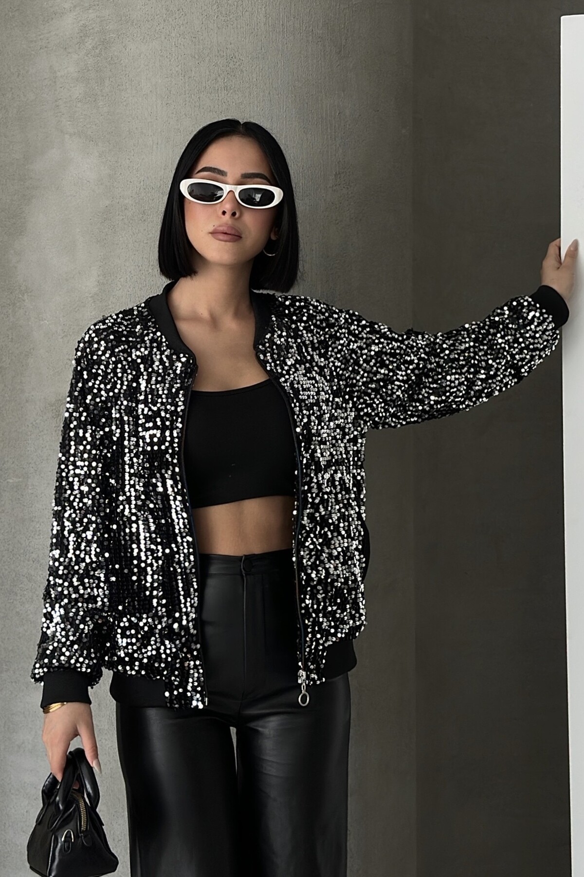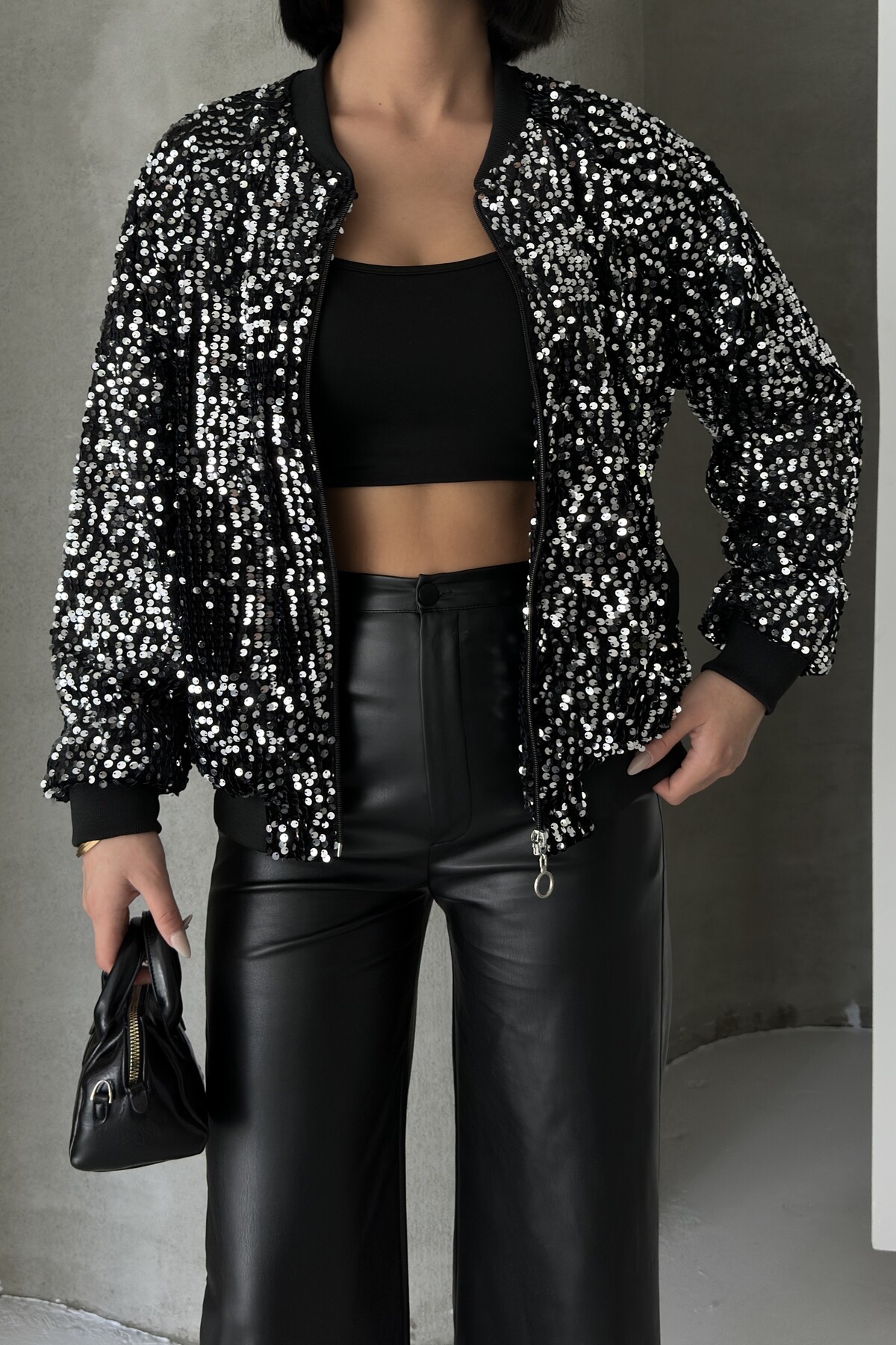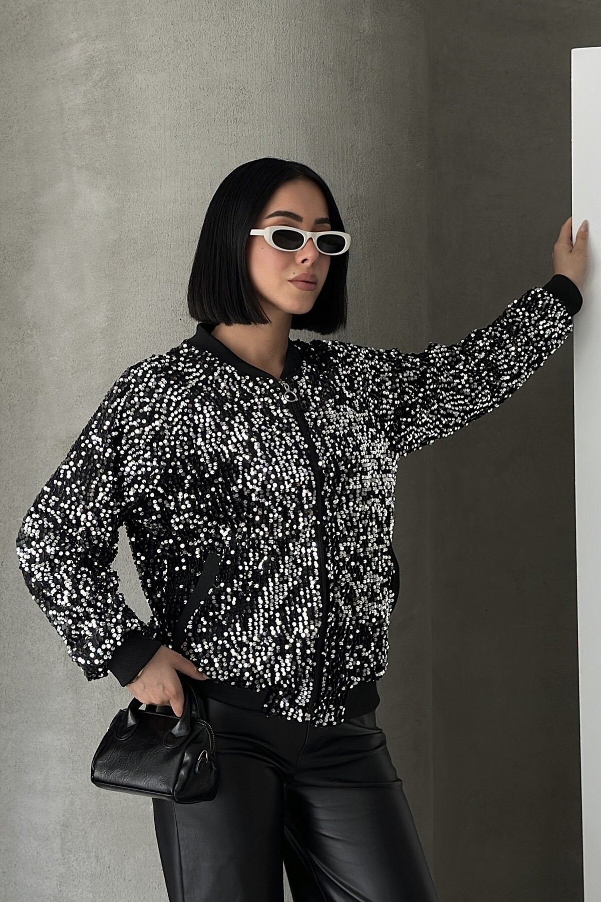 Siyah Payetli Bomber Ceket - Gece Işıltısı Seninle!
