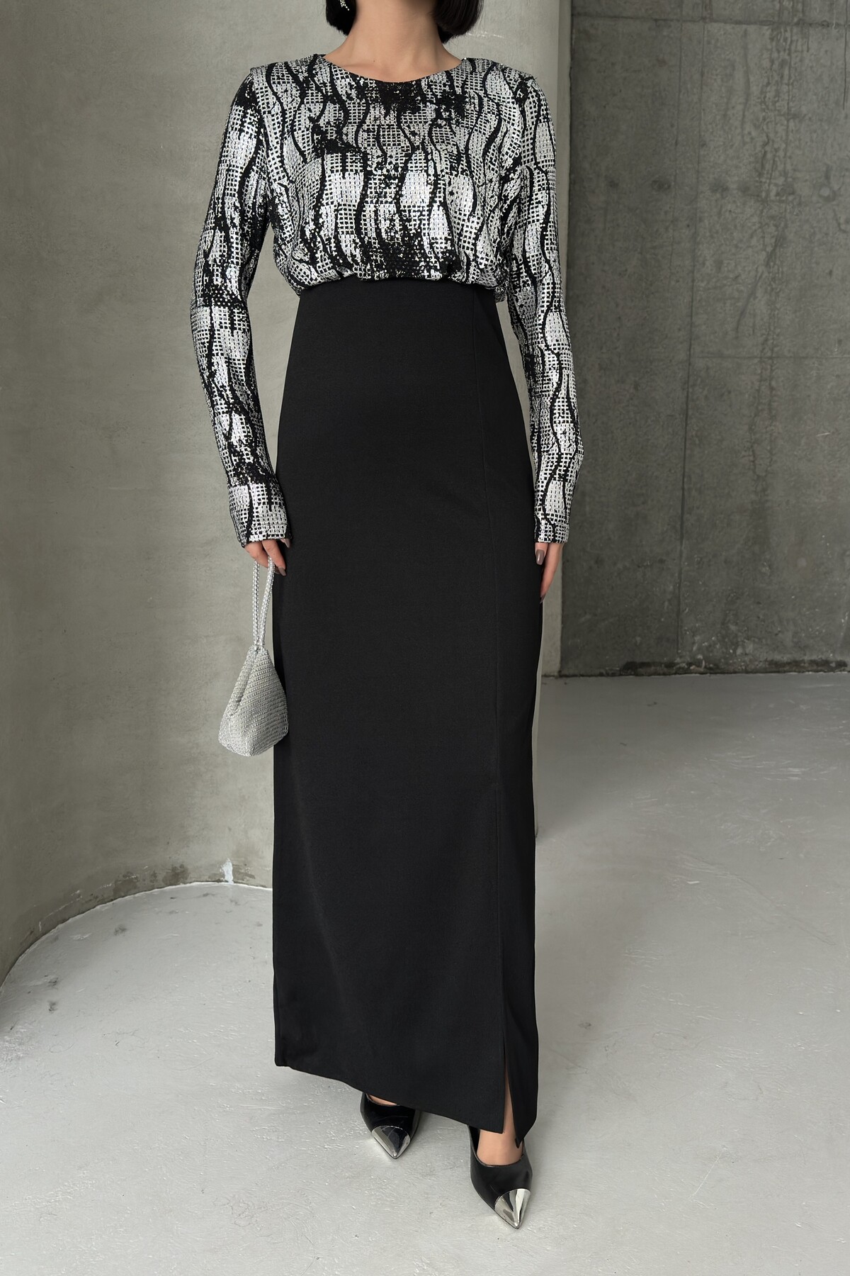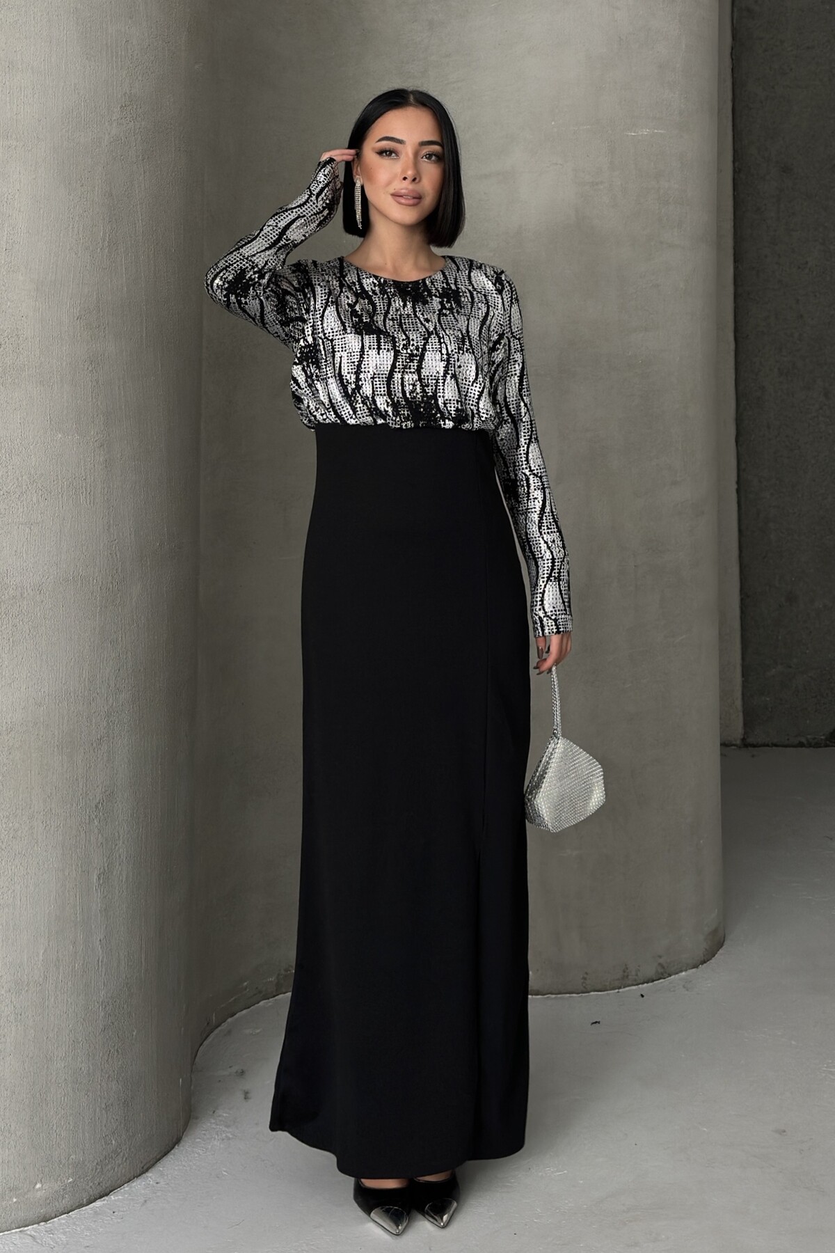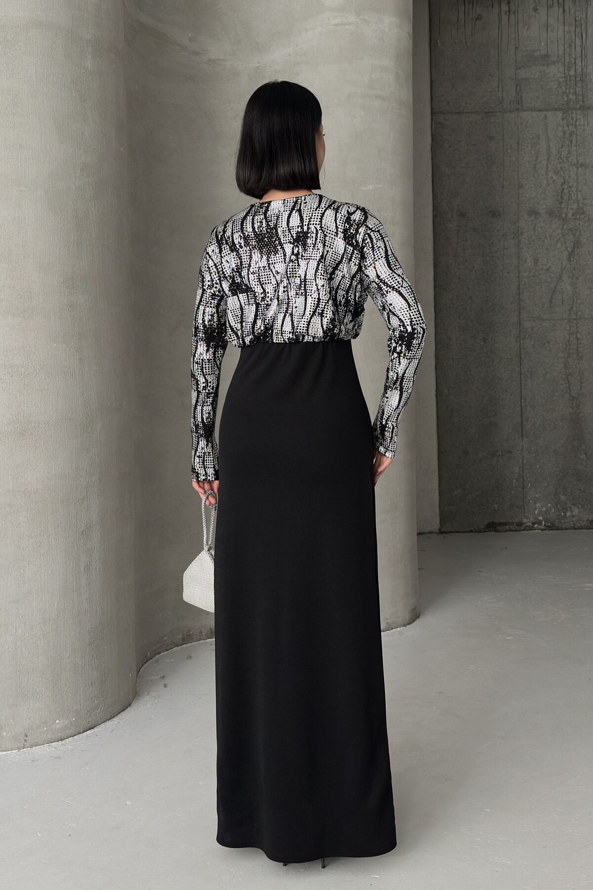 - Uzun kollu tasarımı ile mevsim geçişlerinde ve serin havalarda şıklığınızı korurken konforunuzdan ödün vermezsiniz.; - Krep dokuma tipi, zarif bir dokunuşla elbisenin formunu korurken esnek yapısıyla rahat hareket etme olanağı sunar.; - Düğün ve nikah gibi özel günlerde tercih edebileceğiniz düz kesim, zamansız bir şıklık yaratır.; - Cepsiz tasarımı sayesinde minimalist bir görünüm elde ederken, aksesuarlarınızla kombin yapma özgürlüğünüz artar.; - Pırıltılı detayları ile göz alıcı bir ışıltı kazandırarak, her ortamda dikkat çekici olmanızı sağlar.; - A-line silueti vücut hatlarını nazikçe sararak feminen bir duruş sergiler ve zarif bir görünüm sunar.; - Bisiklet yaka tasarımı modern ve sade bir stil oluştururken, tüm sezonlarda rahatlıkla tercih edilebilir.; - İç göstermeyen yapısı ile rahatlık ve özgüven sağlarken, soyut deseniyle modern bir estetik sunar.; - Dokuma kumaş tipi dayanıklılığı arttırarak uzun süreli kullanım imkanı tanır.; - Türkiye menşei garantisiyle üretilen bu