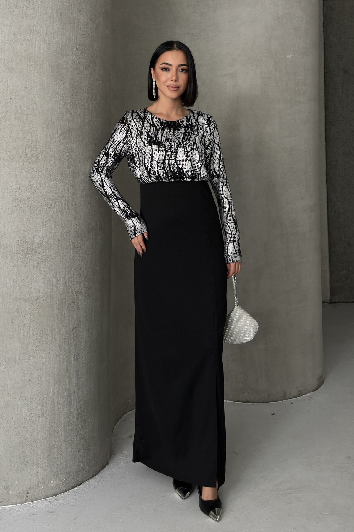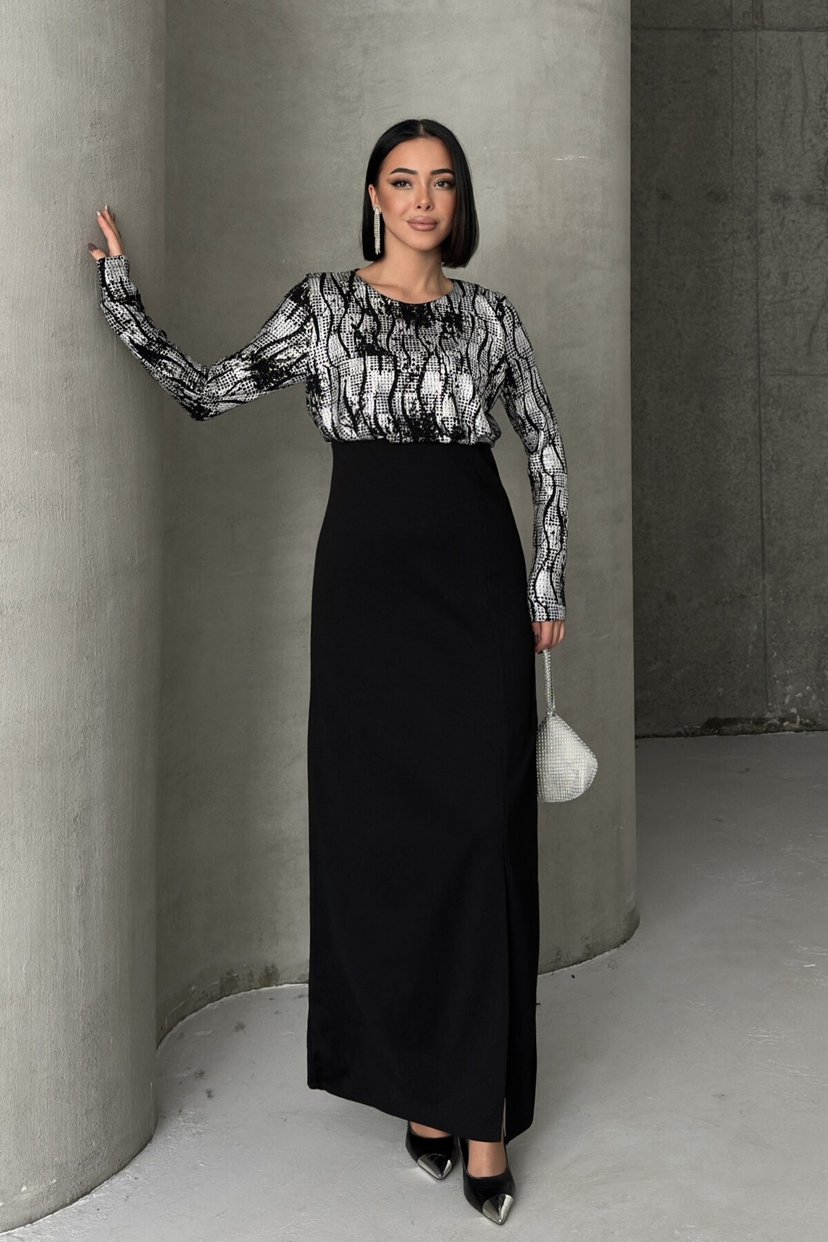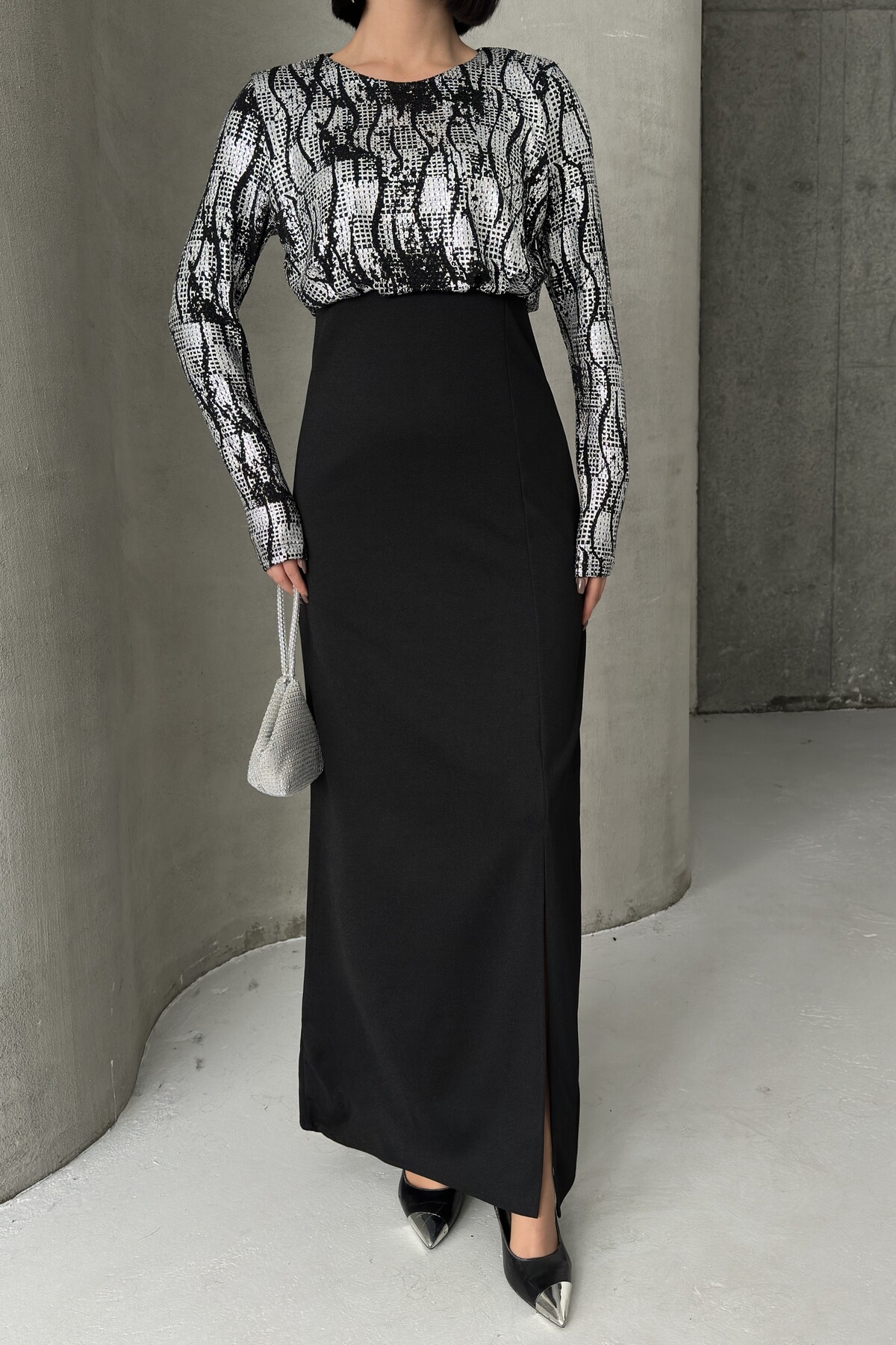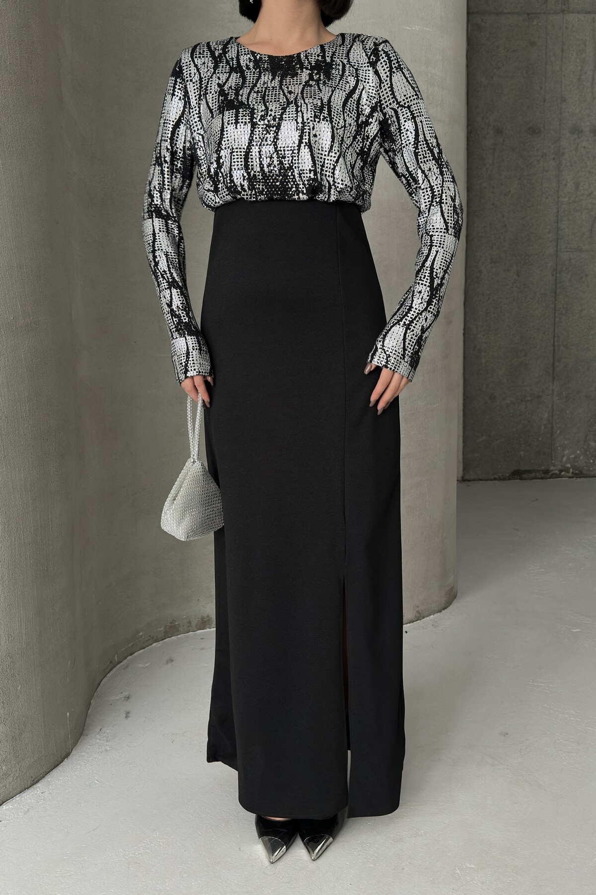 - Uzun kollu tasarımı ile mevsim geçişlerinde ve serin havalarda şıklığınızı korurken konforunuzdan ödün vermezsiniz.; - Krep dokuma tipi, zarif bir dokunuşla elbisenin formunu korurken esnek yapısıyla rahat hareket etme olanağı sunar.; - Düğün ve nikah gibi özel günlerde tercih edebileceğiniz düz kesim, zamansız bir şıklık yaratır.; - Cepsiz tasarımı sayesinde minimalist bir görünüm elde ederken, aksesuarlarınızla kombin yapma özgürlüğünüz artar.; - Pırıltılı detayları ile göz alıcı bir ışıltı kazandırarak, her ortamda dikkat çekici olmanızı sağlar.; - A-line silueti vücut hatlarını nazikçe sararak feminen bir duruş sergiler ve zarif bir görünüm sunar.; - Bisiklet yaka tasarımı modern ve sade bir stil oluştururken, tüm sezonlarda rahatlıkla tercih edilebilir.; - İç göstermeyen yapısı ile rahatlık ve özgüven sağlarken, soyut deseniyle modern bir estetik sunar.; - Dokuma kumaş tipi dayanıklılığı arttırarak uzun süreli kullanım imkanı tanır.; - Türkiye menşei garantisiyle üretilen bu