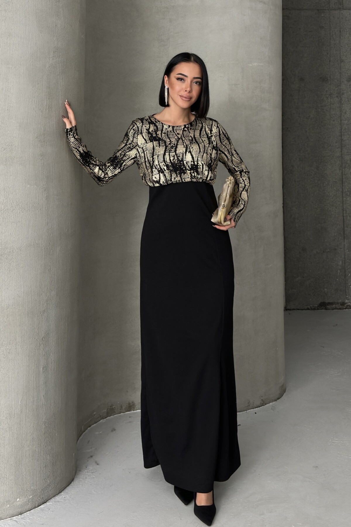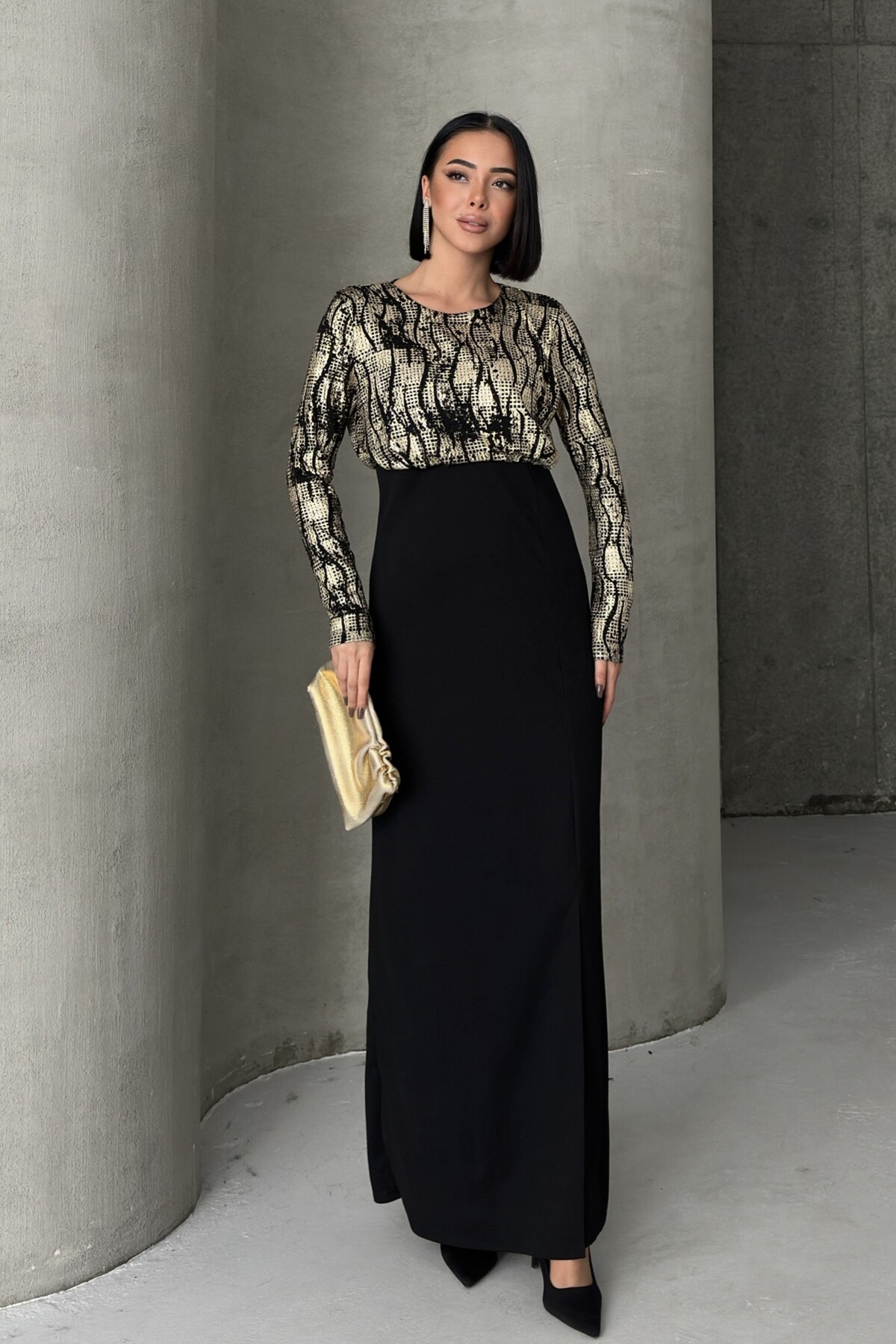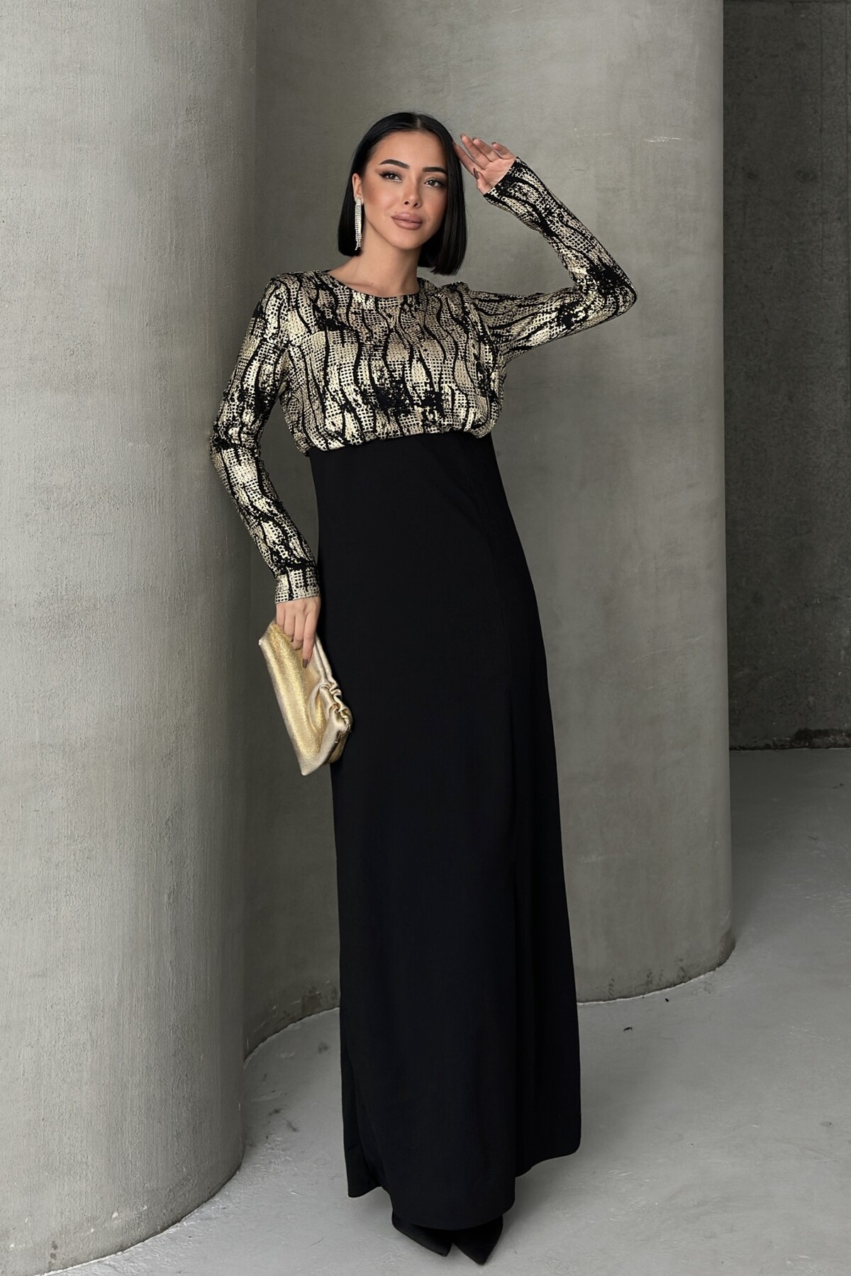 Siyah Gold Desenli Uzun Kollu Şık Maxi Abiye Elbise