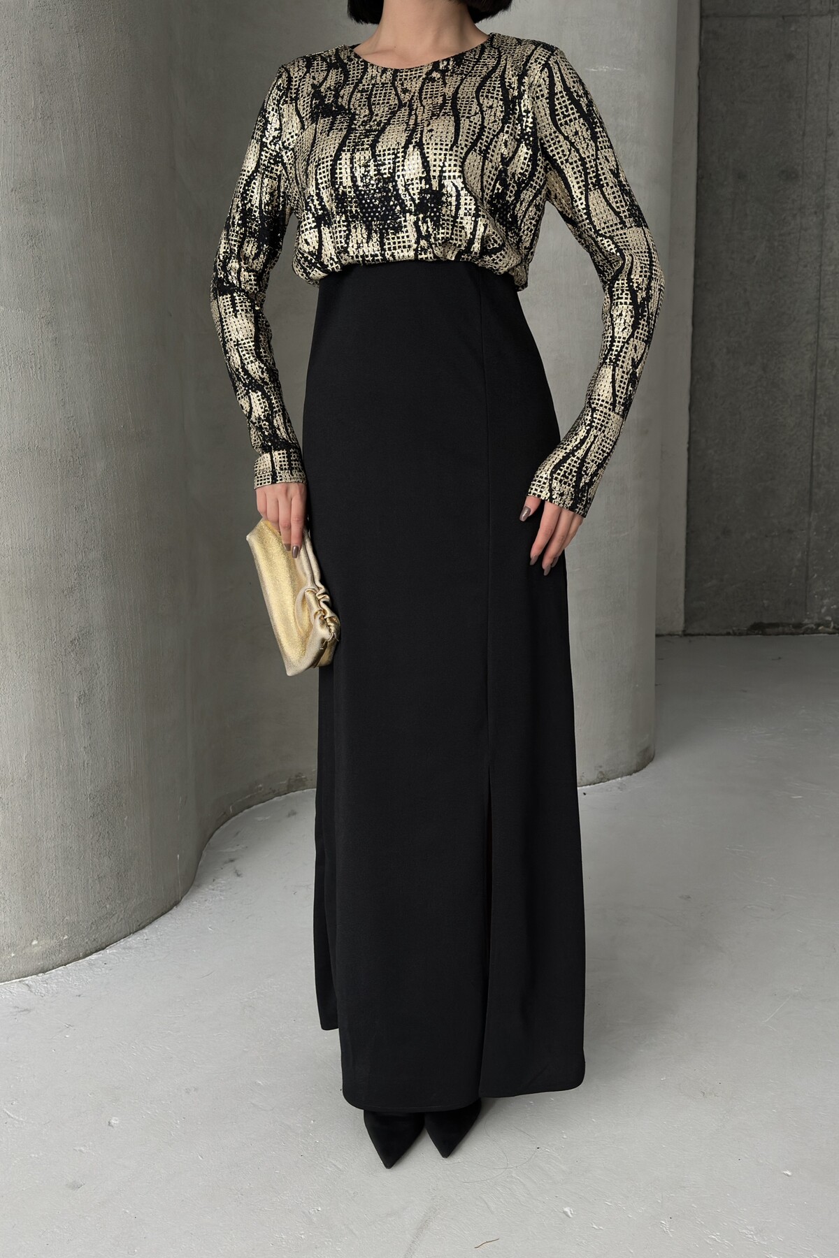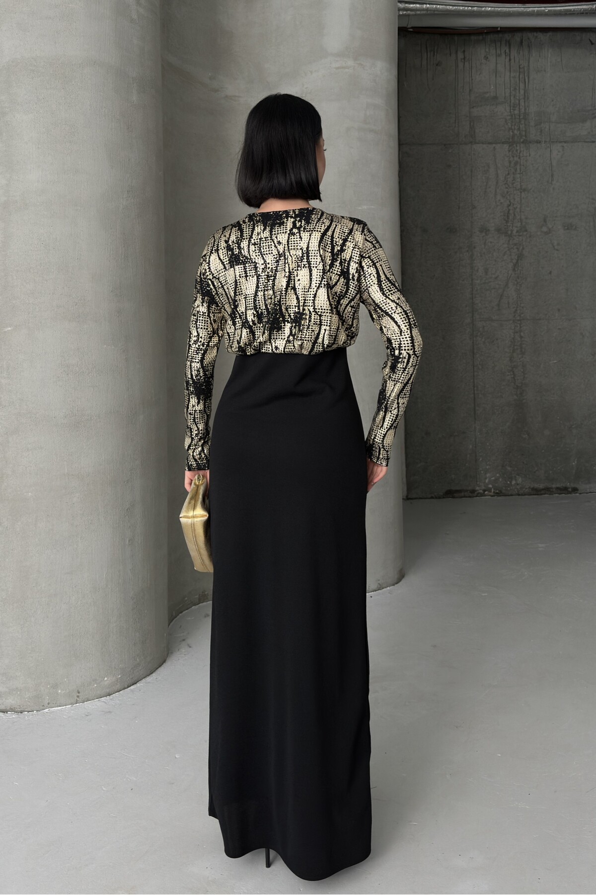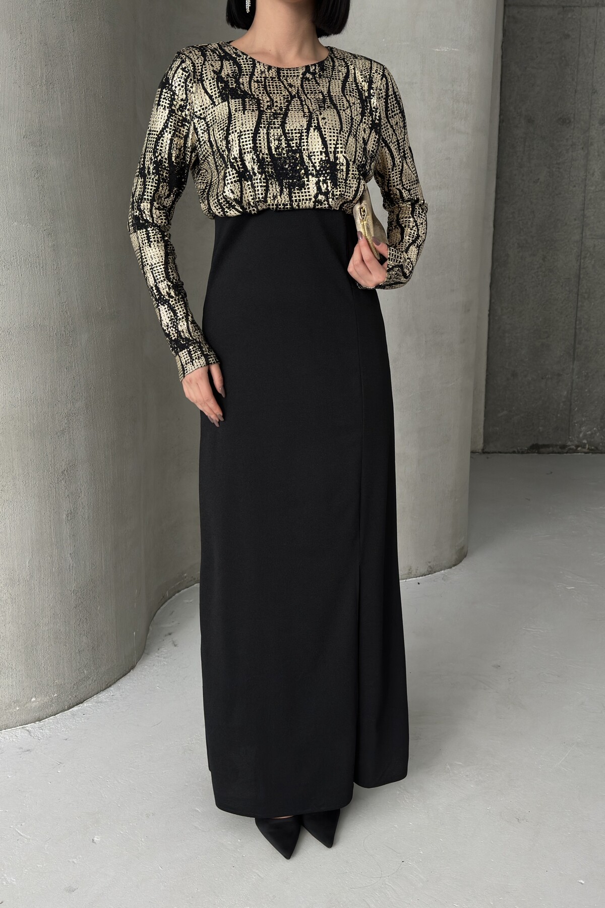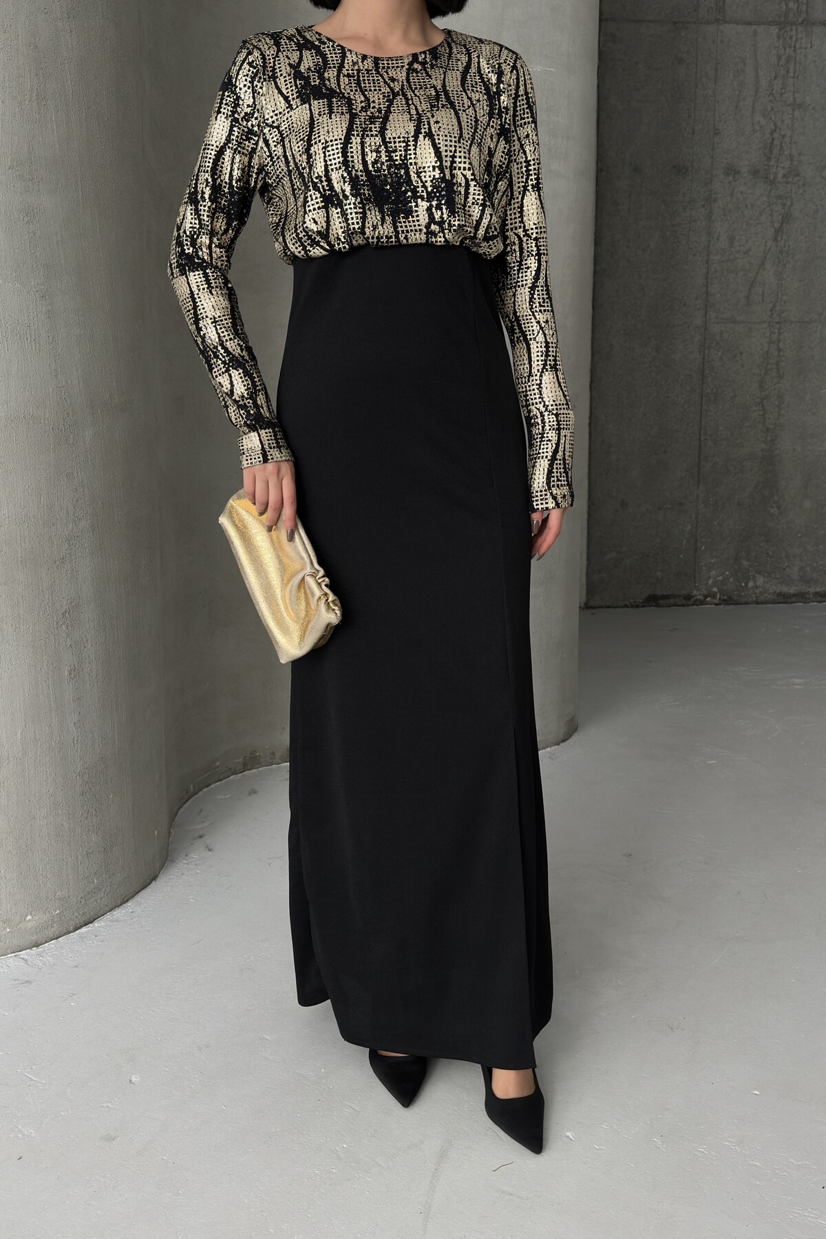 Siyah Gold Desenli Uzun Kollu Şık Maxi Abiye Elbise