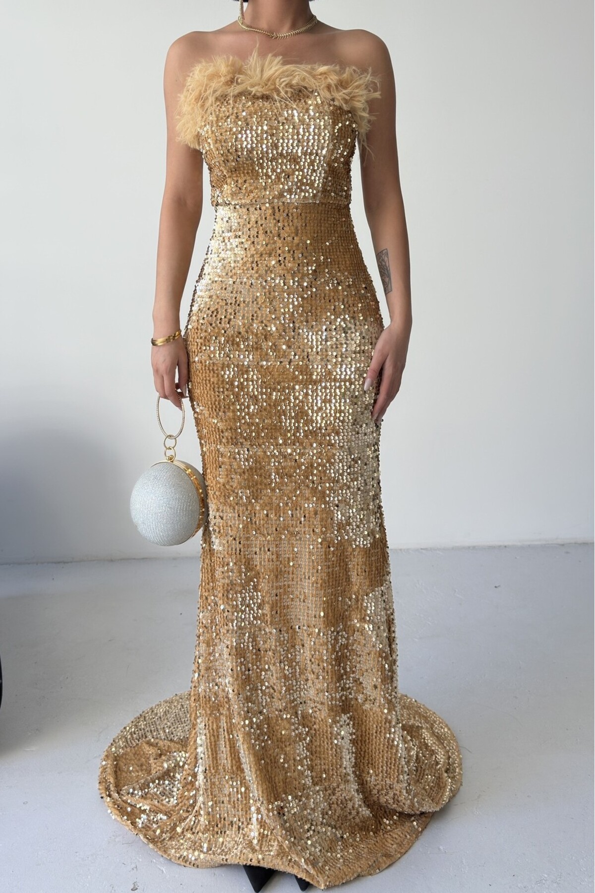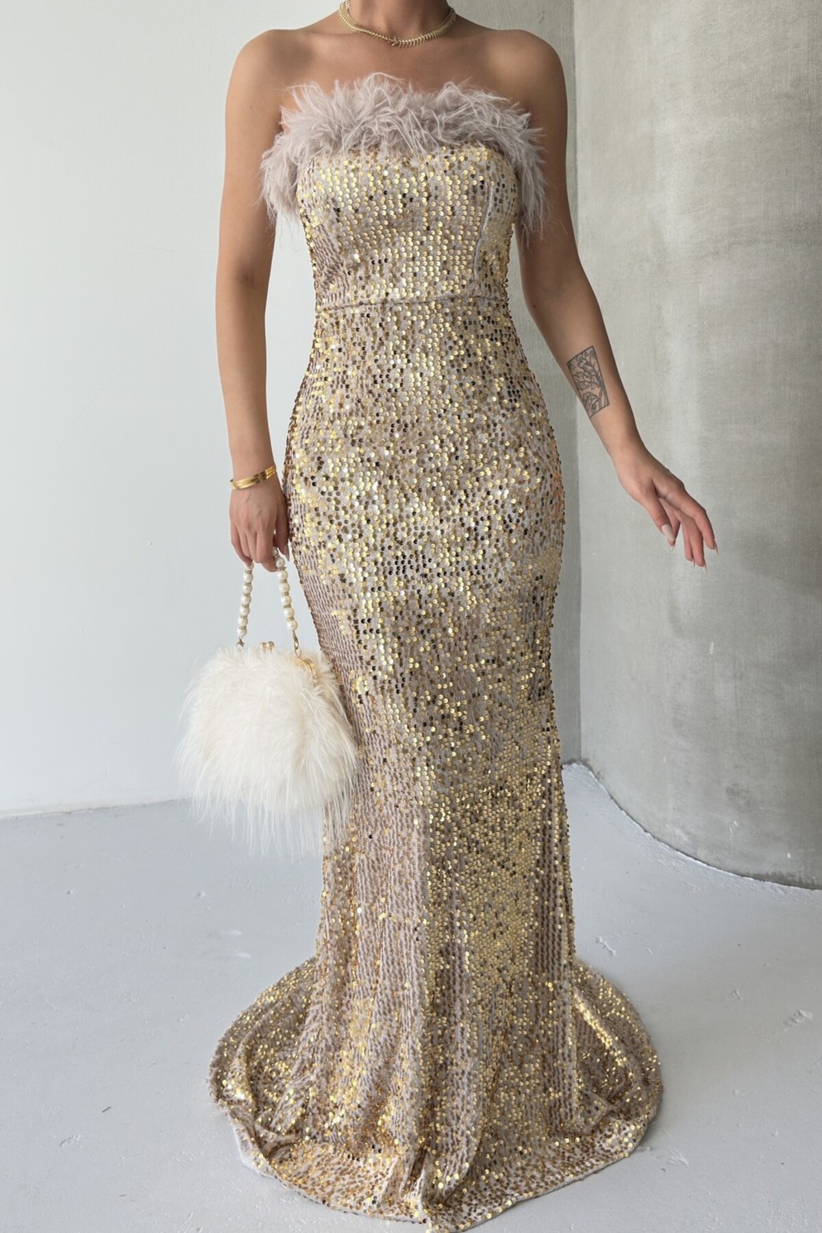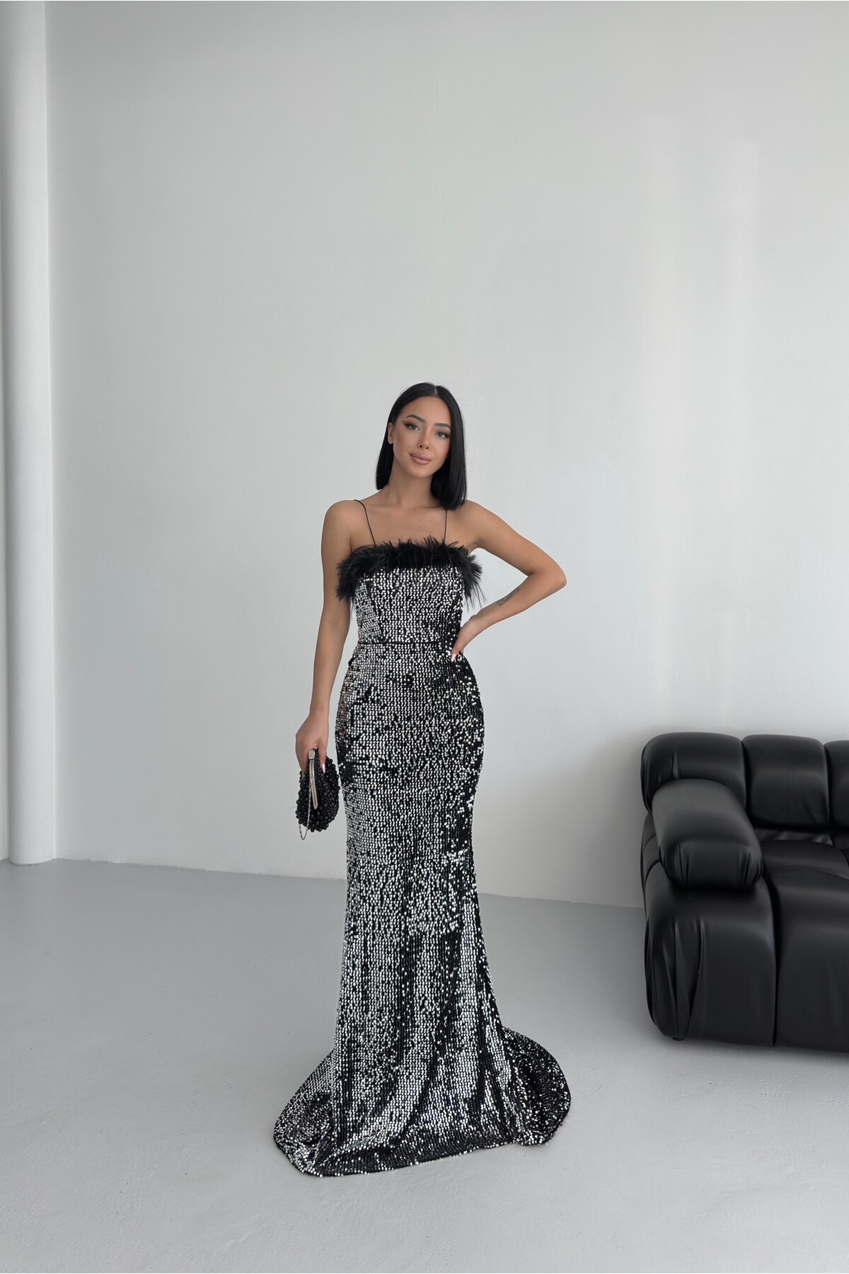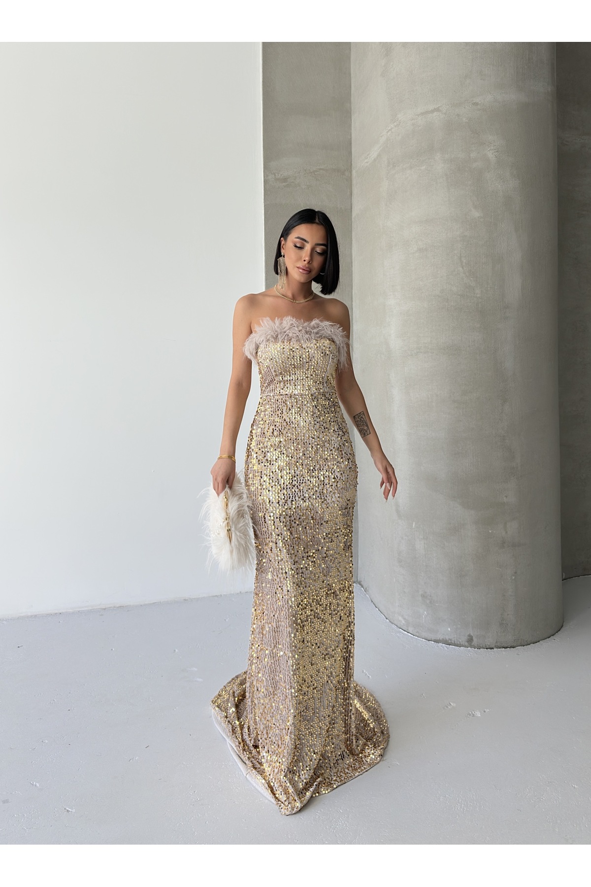 Trend Pul Payetli Tüy Detaylı Abiye Kadife Gri Elbise