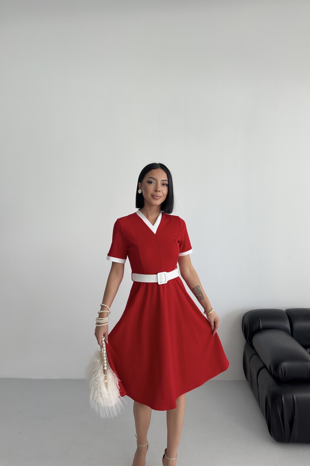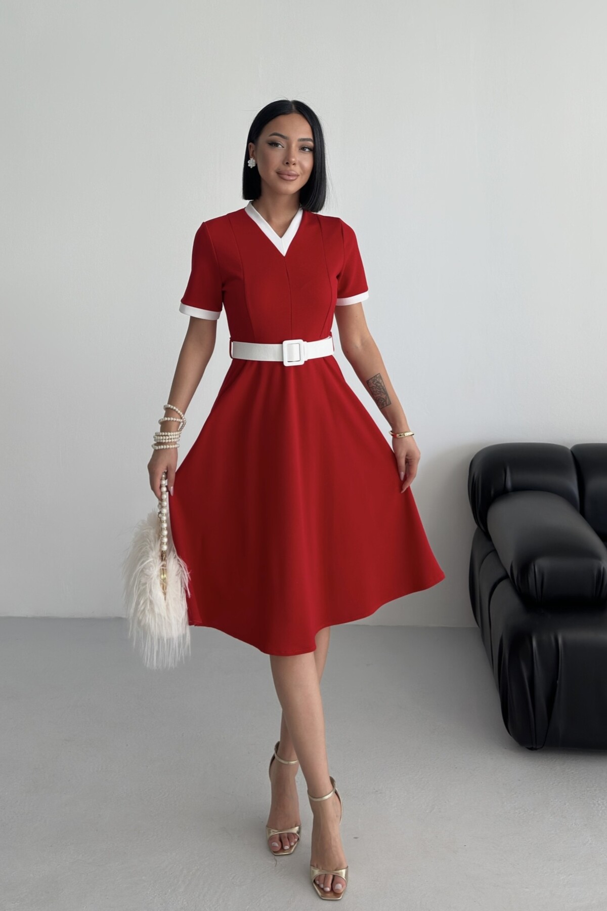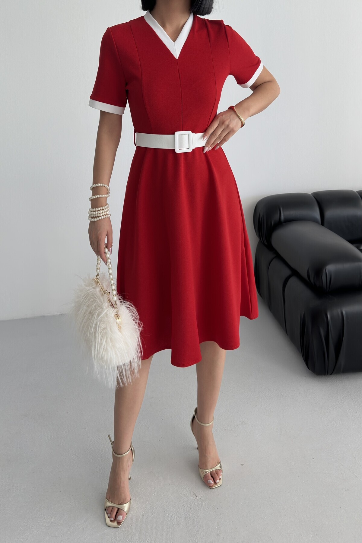 V Yaka Çift Renk Midi Kemerli Kırmızı Elbise