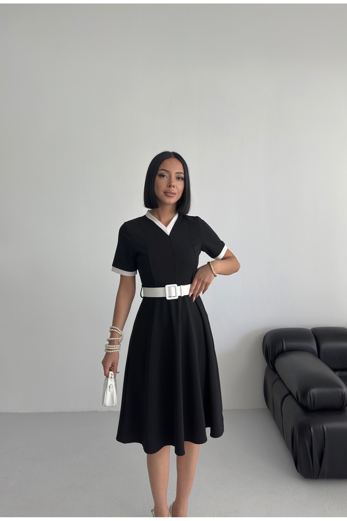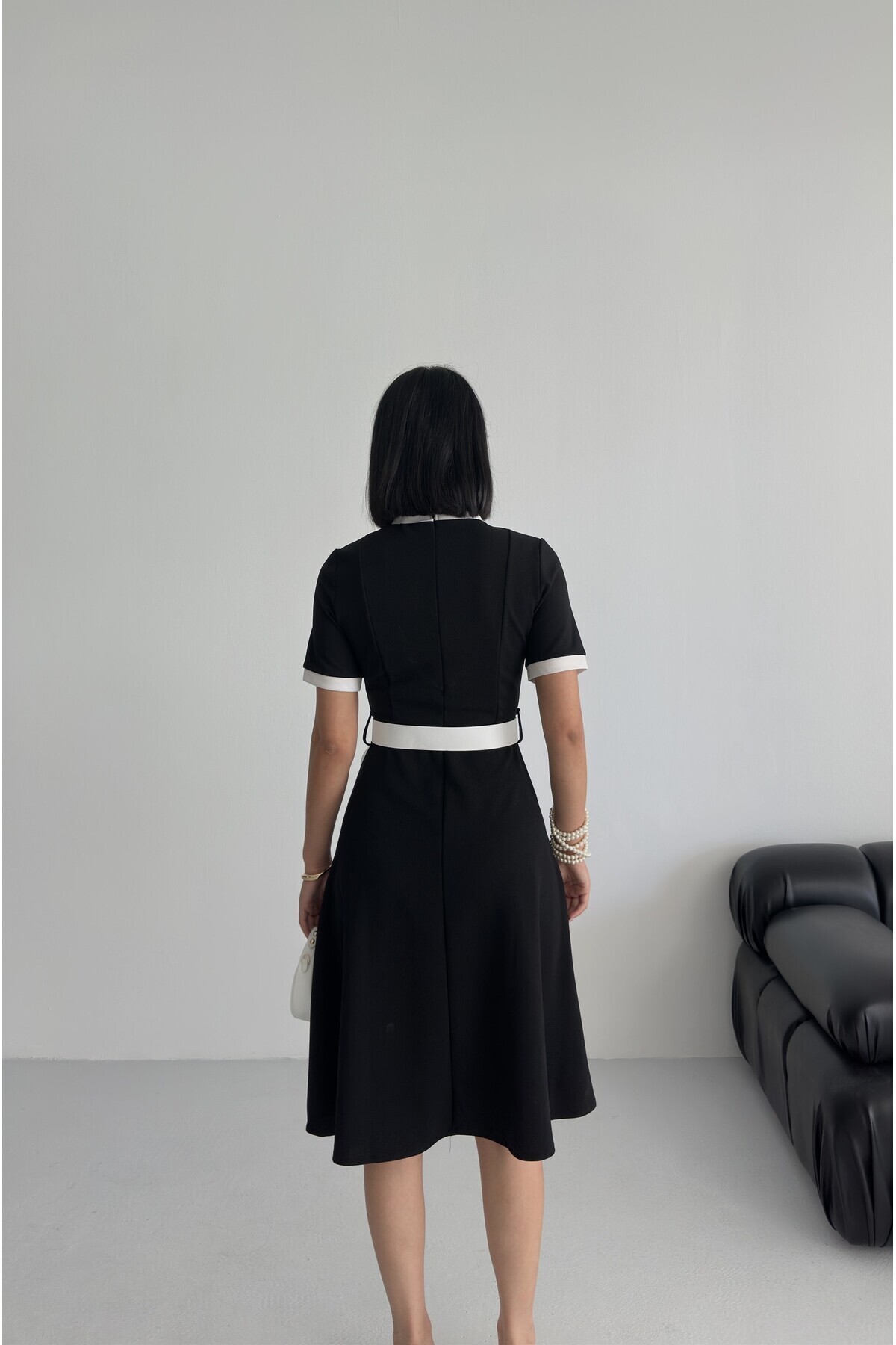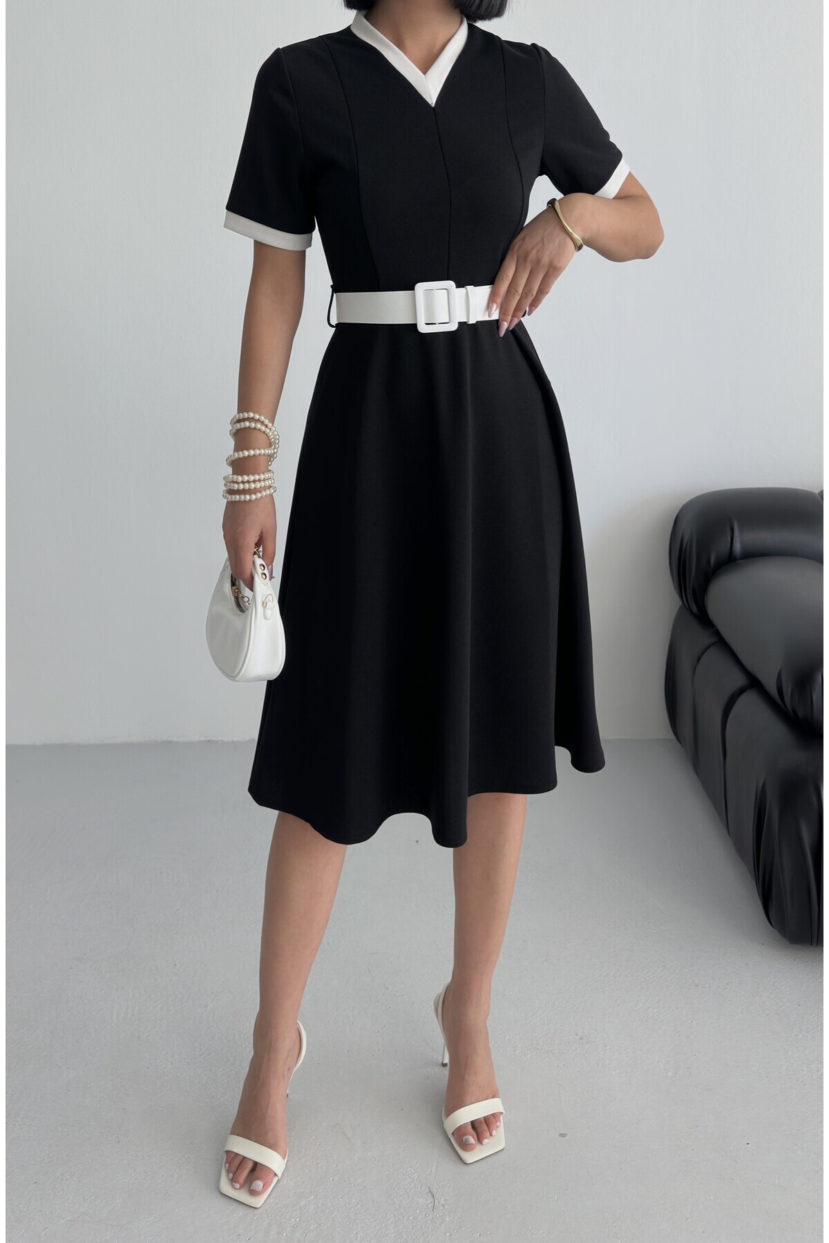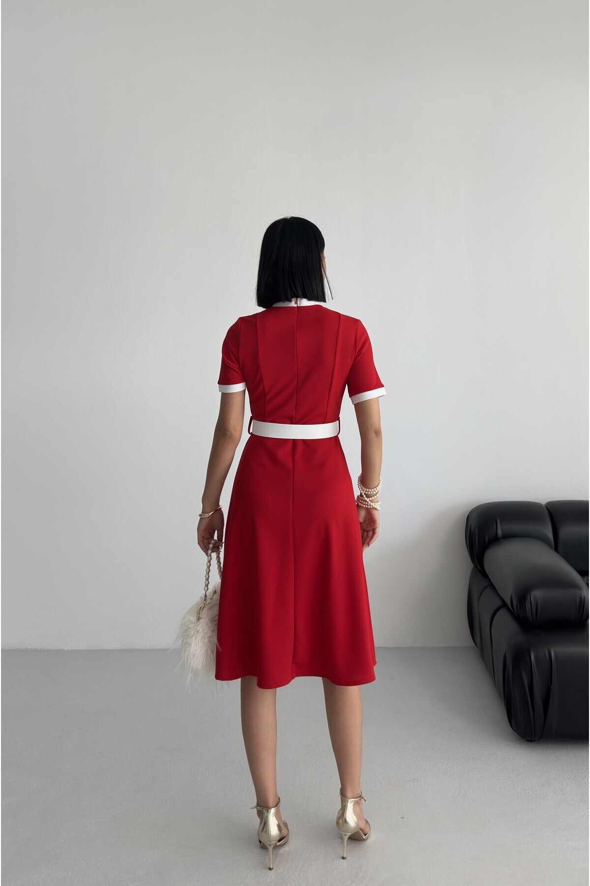 V Yaka Çift Renk Midi Kemerli Kırmızı Elbise