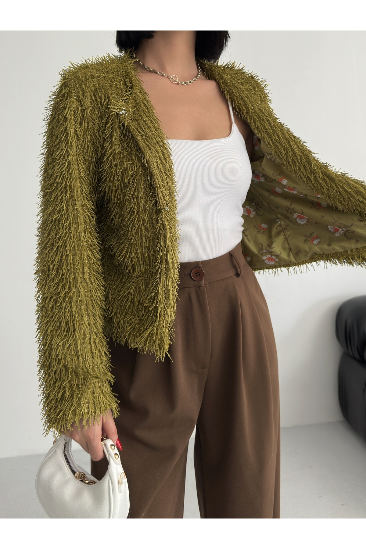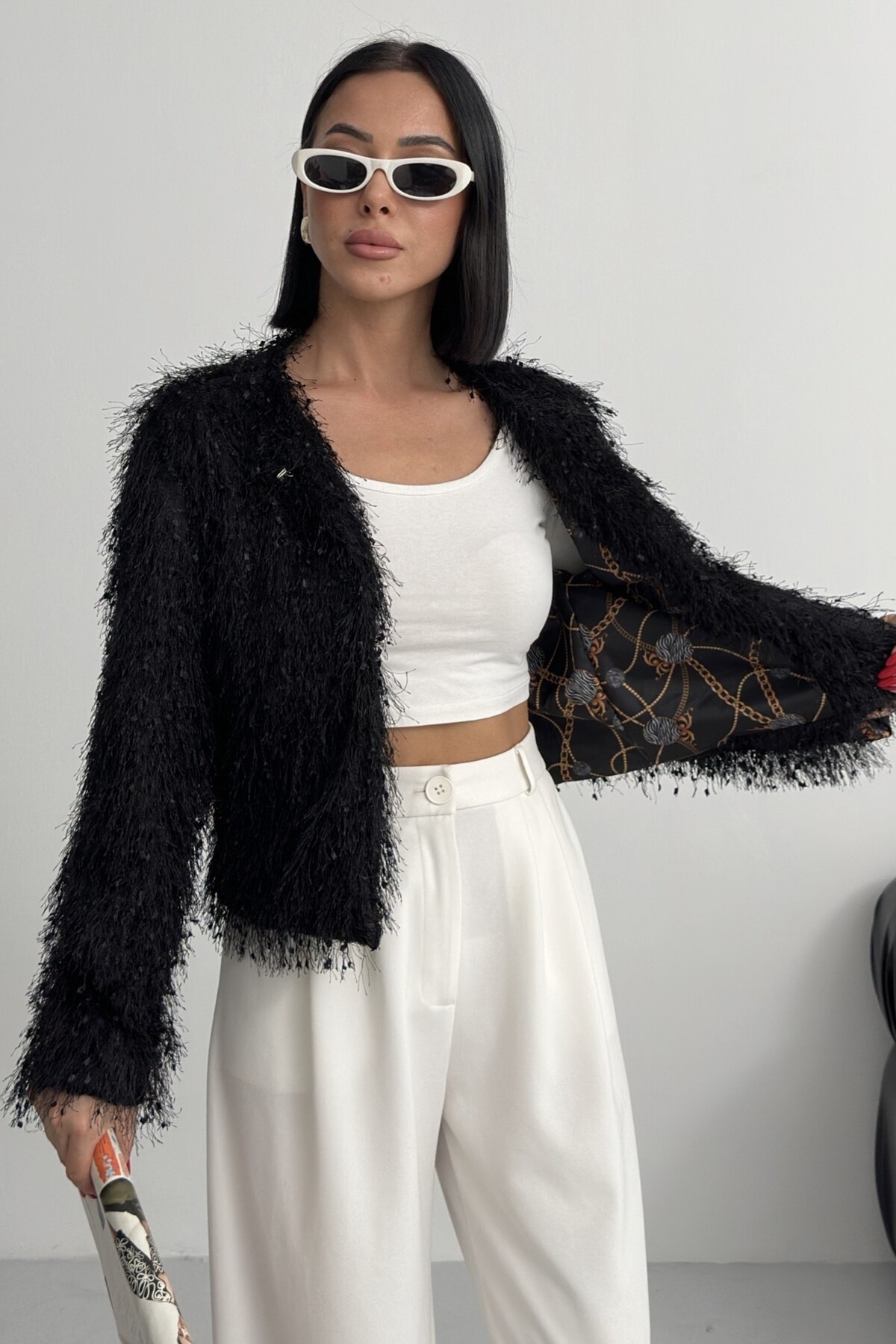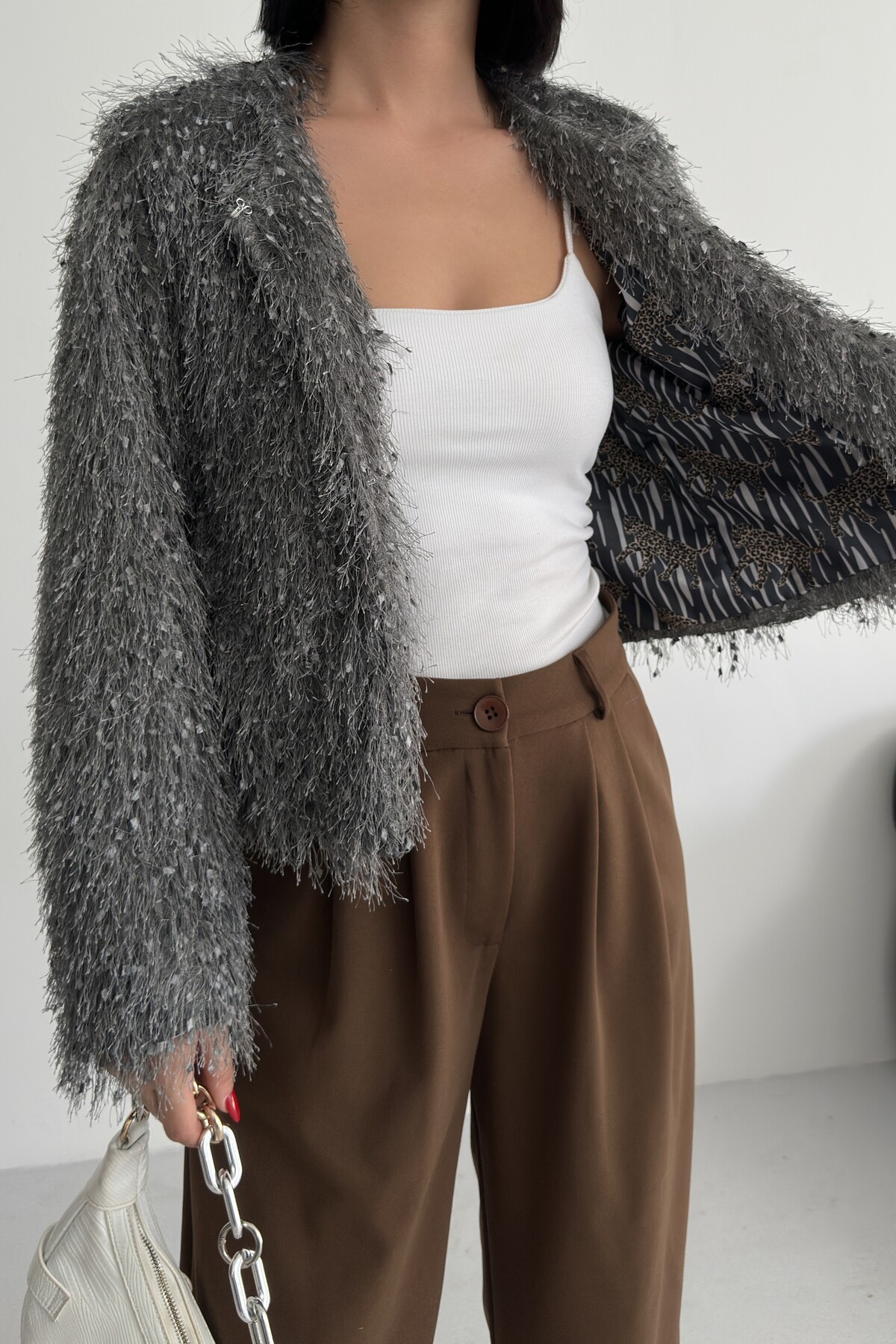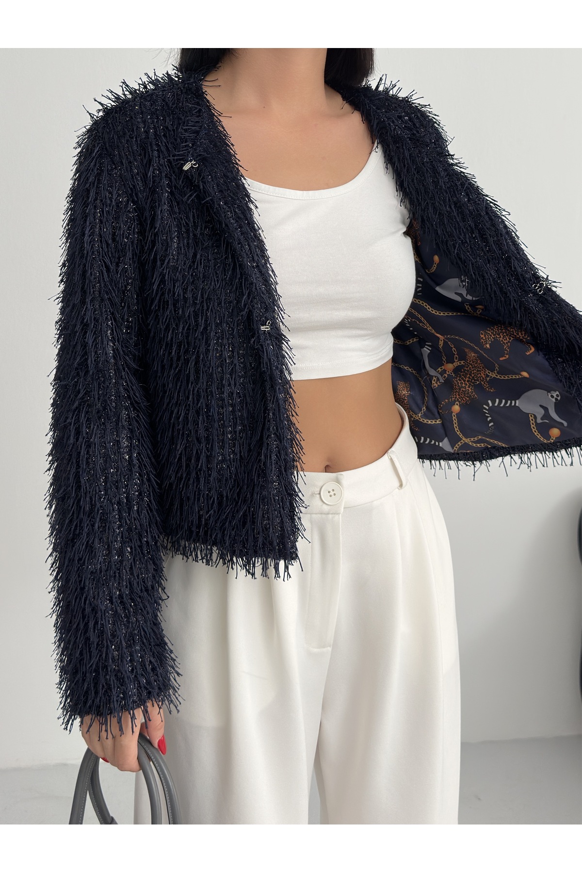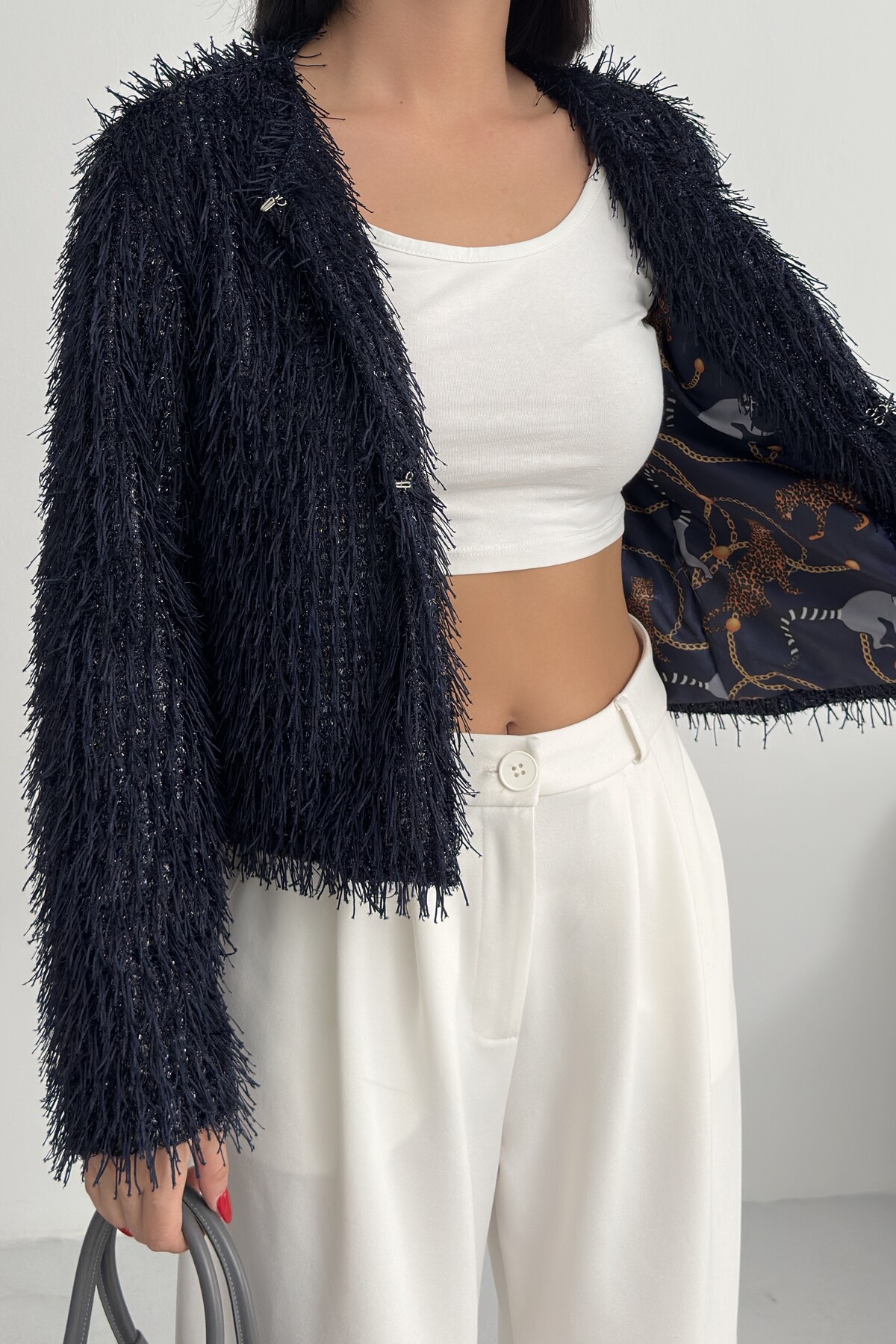 - Uzun kollu tasarımı ile mevsim geçişlerinde ve soğuk havalarda ideal bir koruma sağlar.; - Soyut deseniyle modern ve şık bir görünüm sunar, günlük kullanım için uygundur.; - Tüm sezonlara uygun yapısıyla yılın her döneminde rahatlıkla tercih edilebilir.; - Dolgusuz yapısı sayesinde hafif ve konforlu bir kullanım sunar.; - Orta kalınlıkta dokusu, soğuk havalarda yeterli sıcaklık sağlar ancak aşırı kalınlıkta değildir.; - Kemersiz tasarımı ile sade ve şık bir görünüm elde edilir, kolay kombin yapma imkanı tanır.; - Kutu içermeyen ambalajı sayesinde çevre dostu bir tercih olurken, ürünün doğrudan teslimatını sağlar.; - Sürdürülebilirlik detayına sahip olmasıyla çevreye duyarlı tüketiciler için idealdir.; - Dokuma materyali dayanıklılığı artırırken, cepsiz tasarım minimalist bir stil oluşturur.; - Dolgusuz yapısı hafifliği koruyarak hareket özgürlüğünüzü kısıtlamaz.; - Basic siluetiyle her türden kıyafetle uyum sağlayarak gardırobunuzdaki