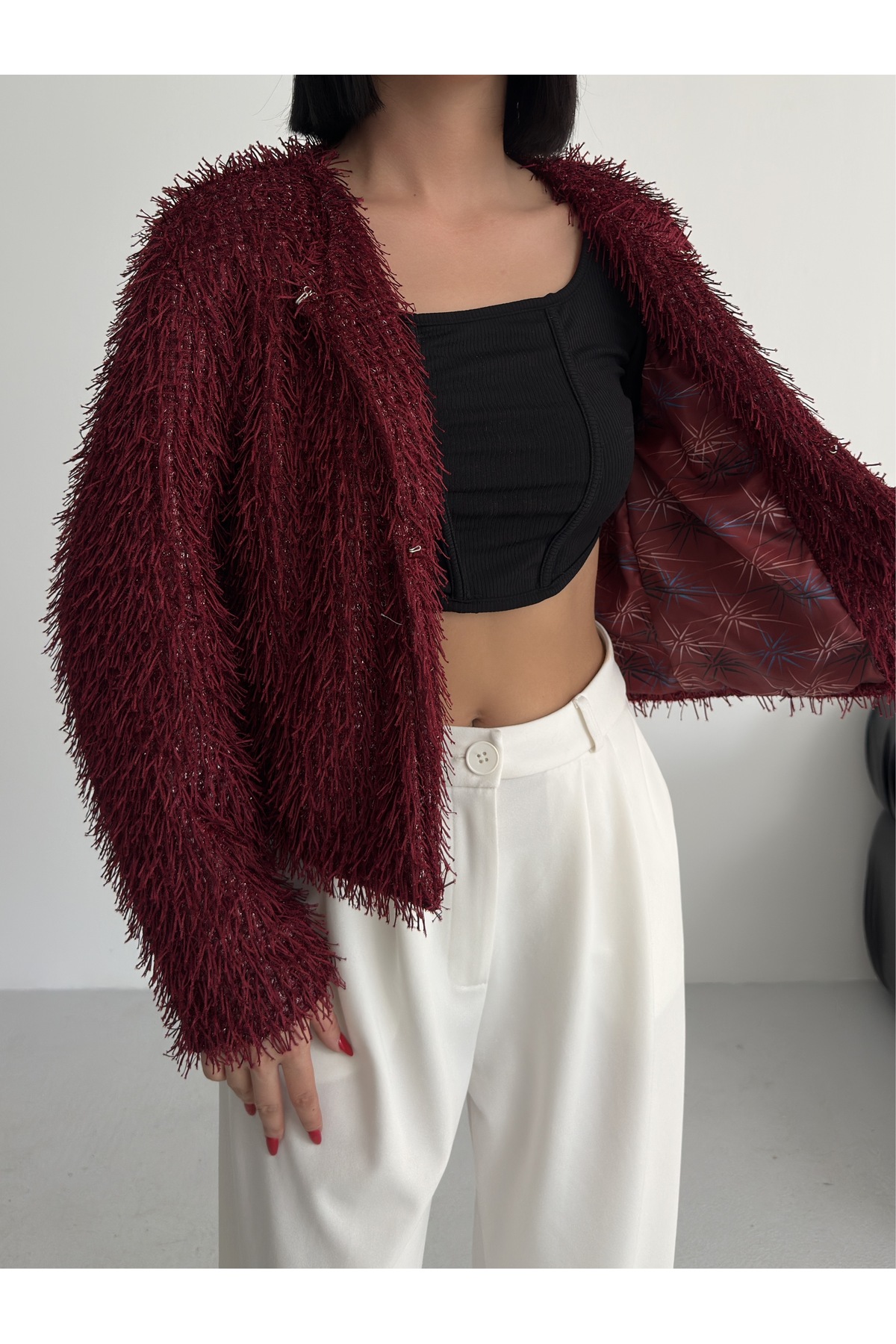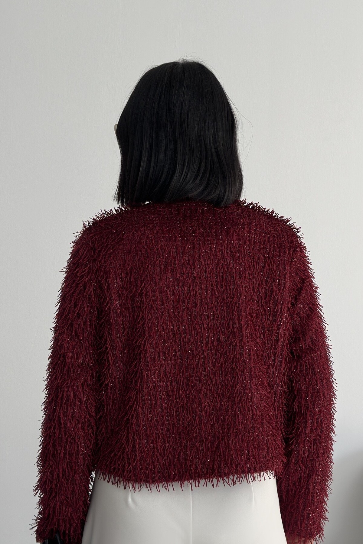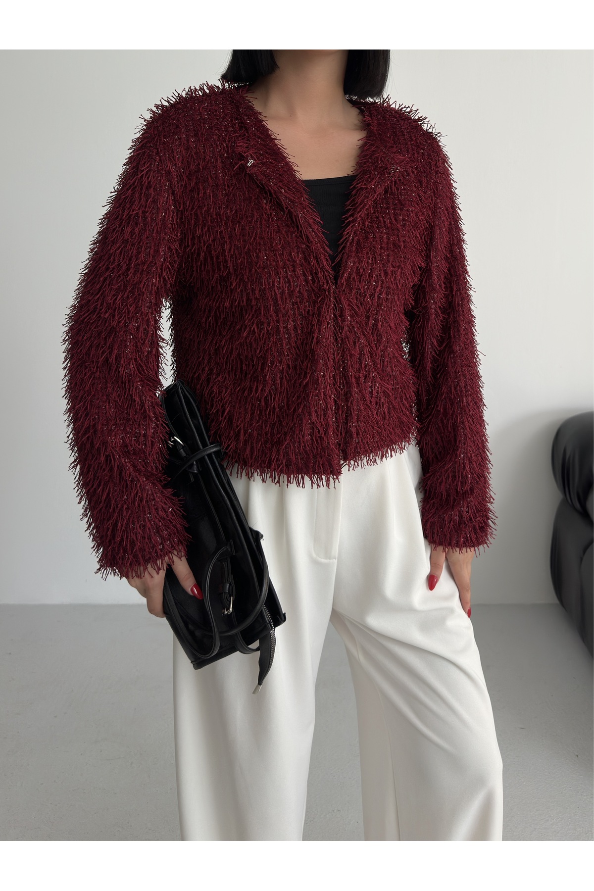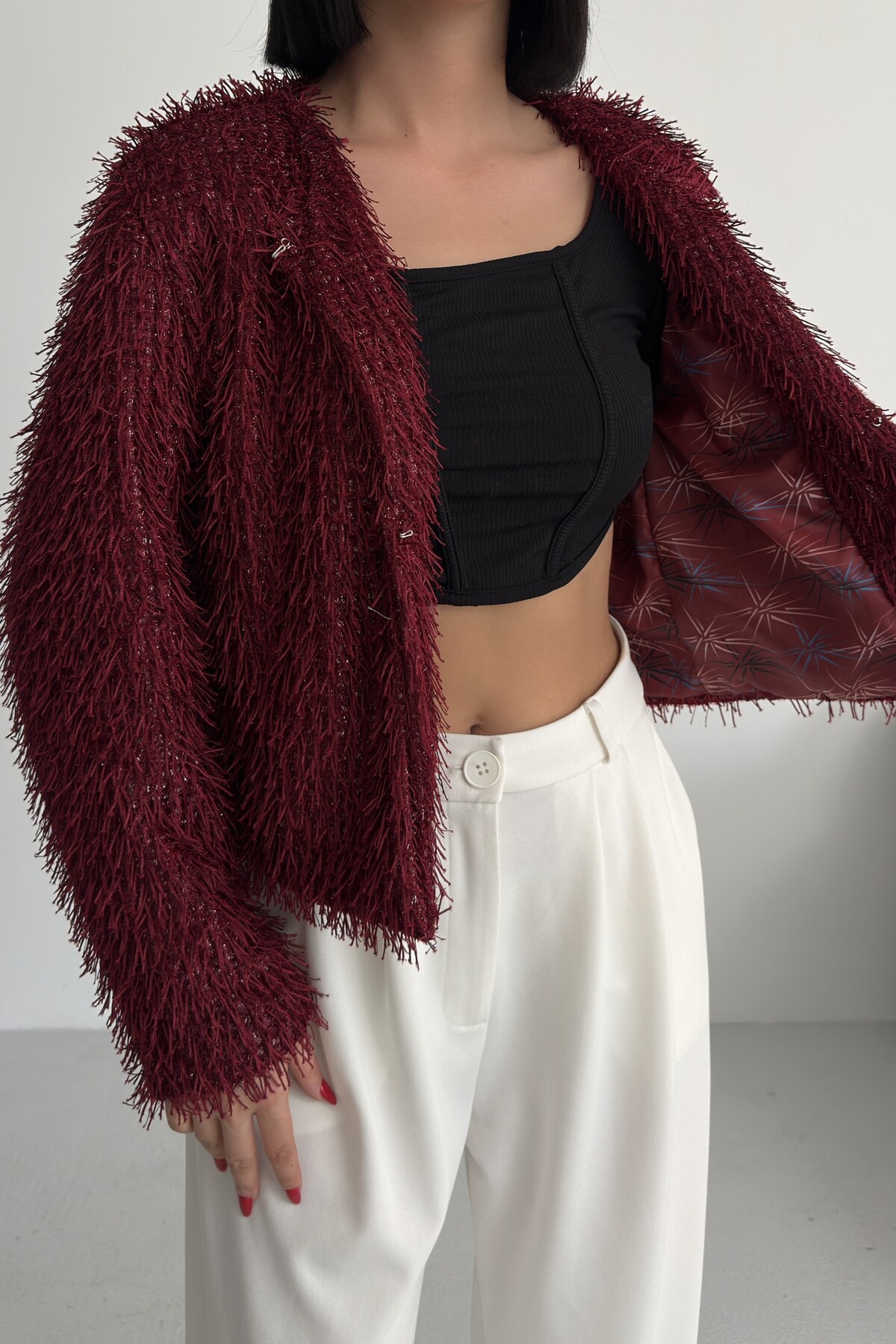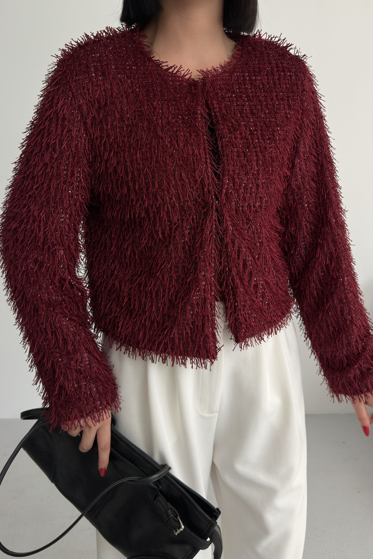 Yakasız İthal Püsküllü Bordo Kürk Mont