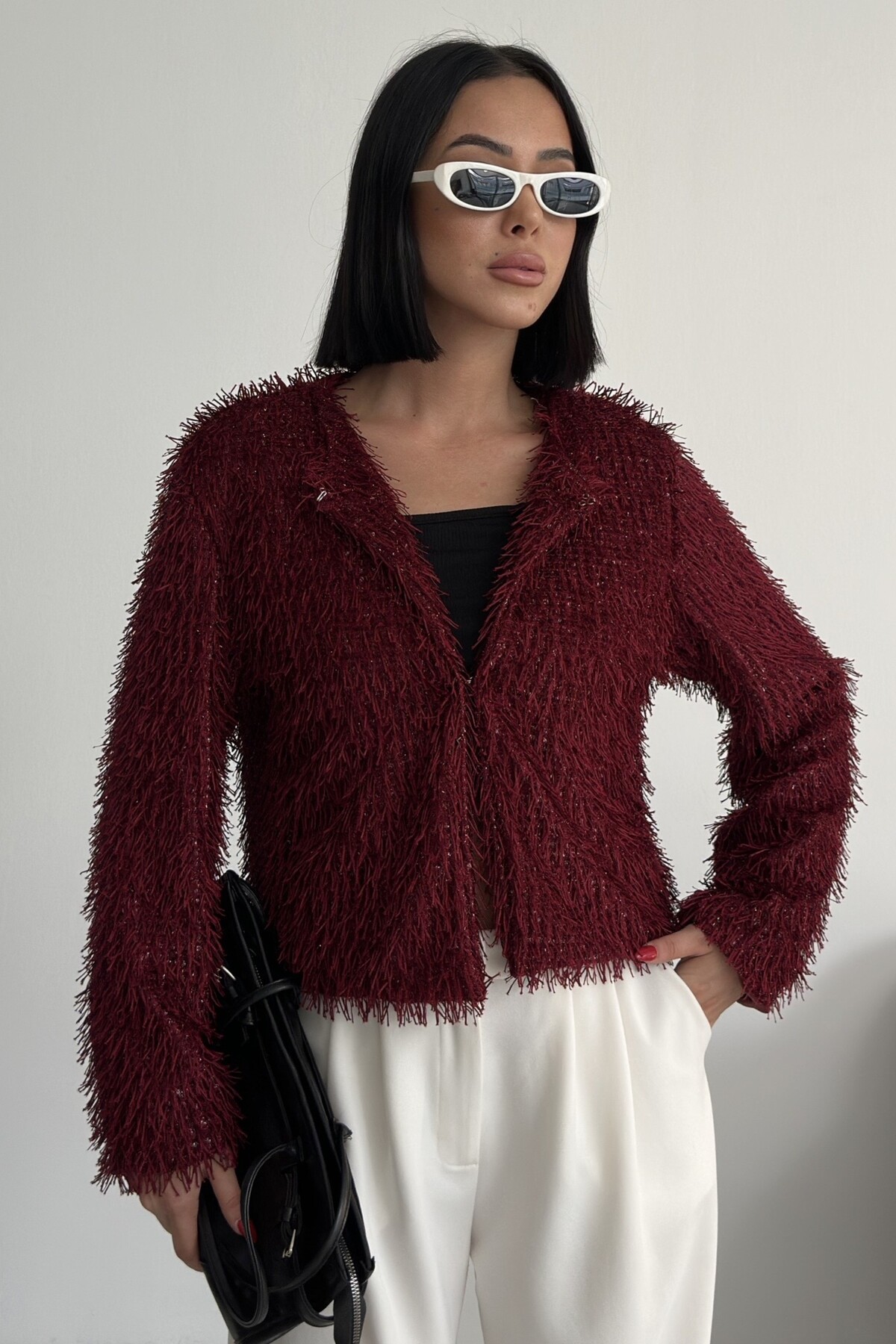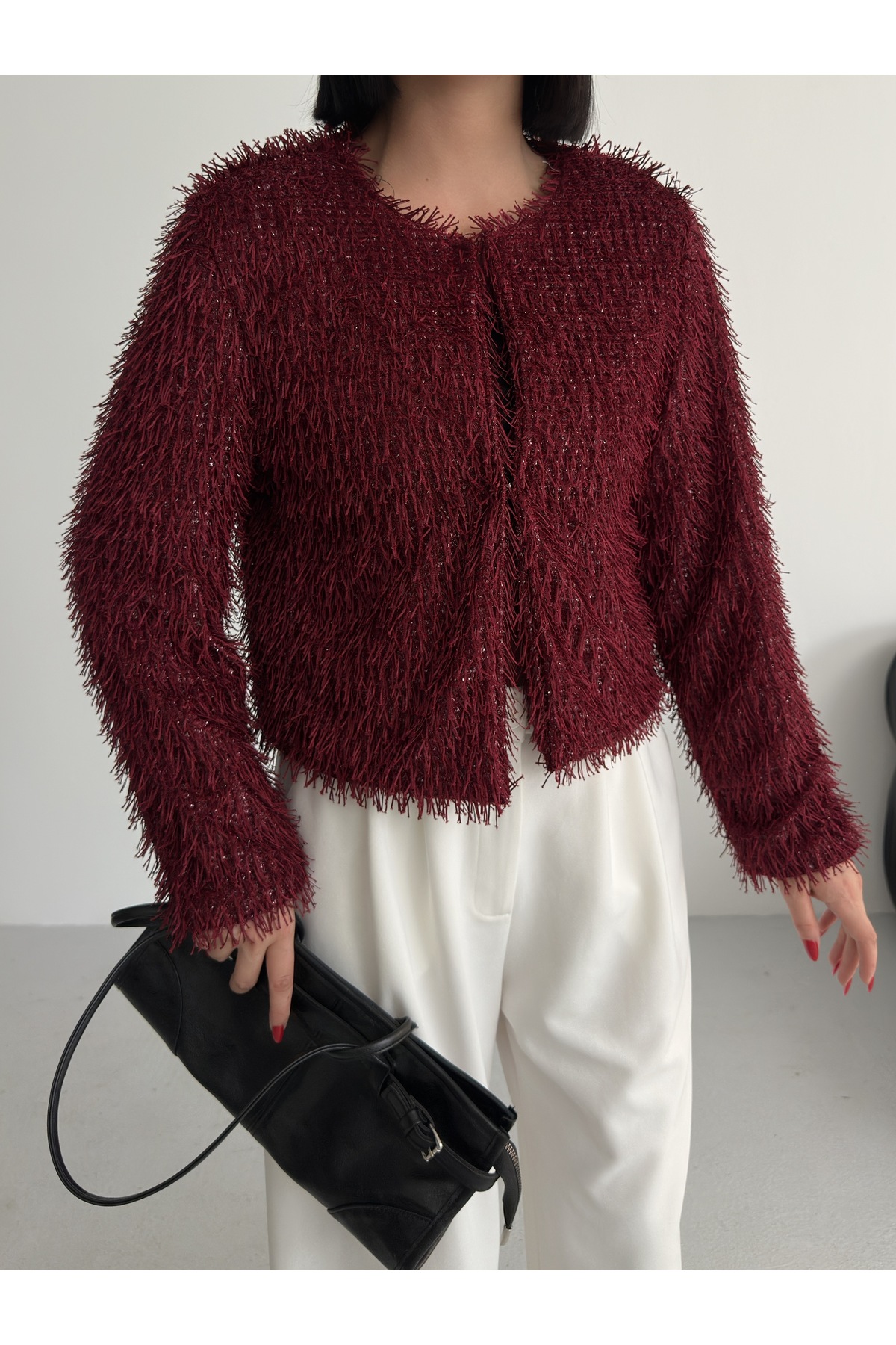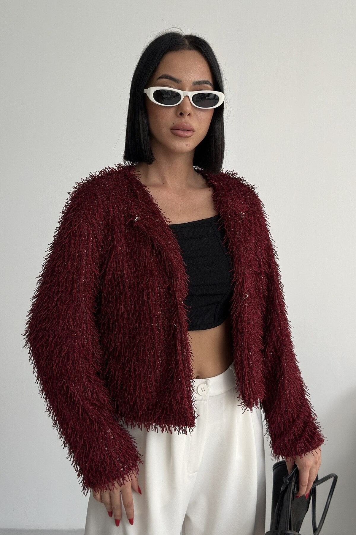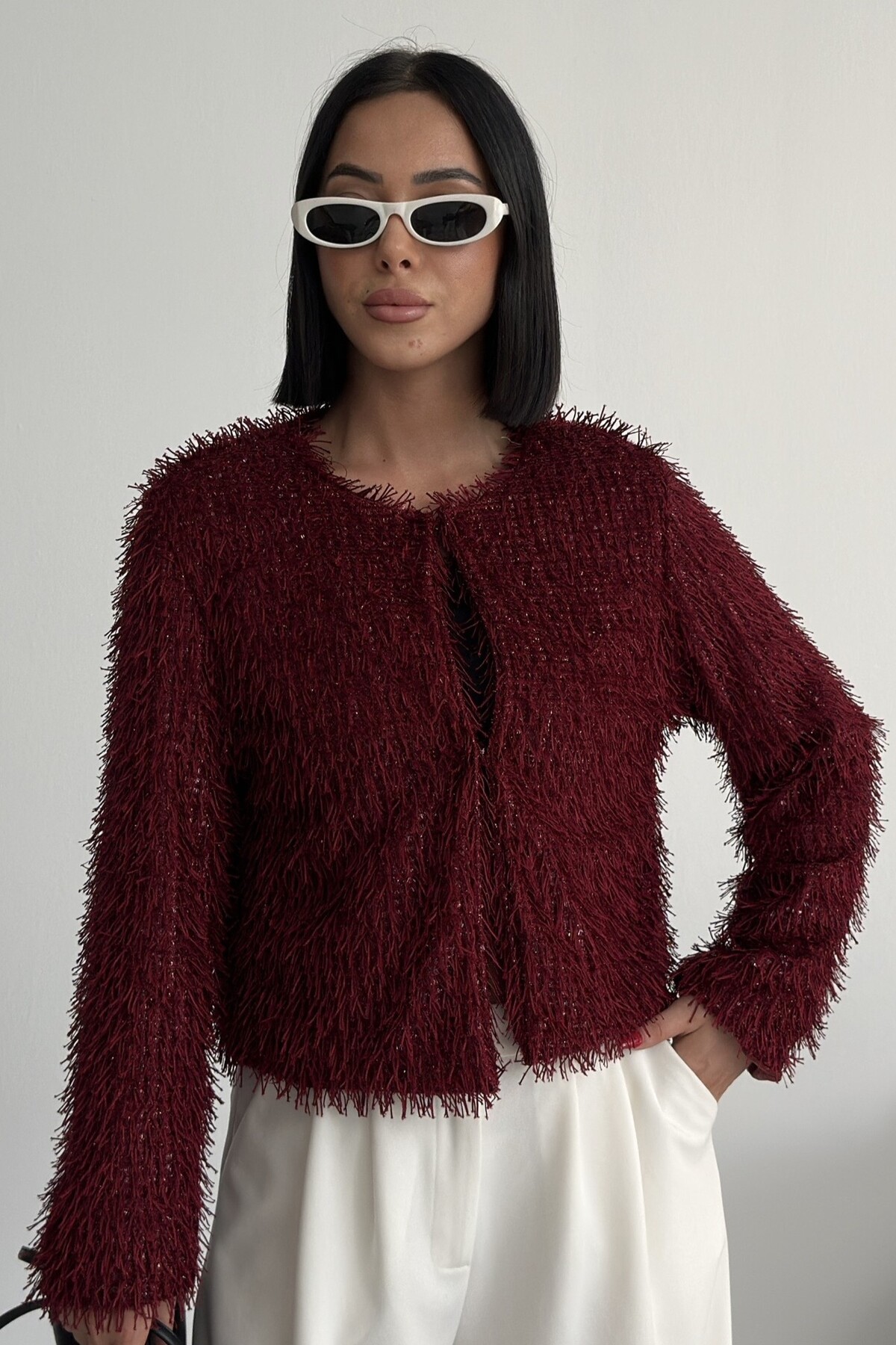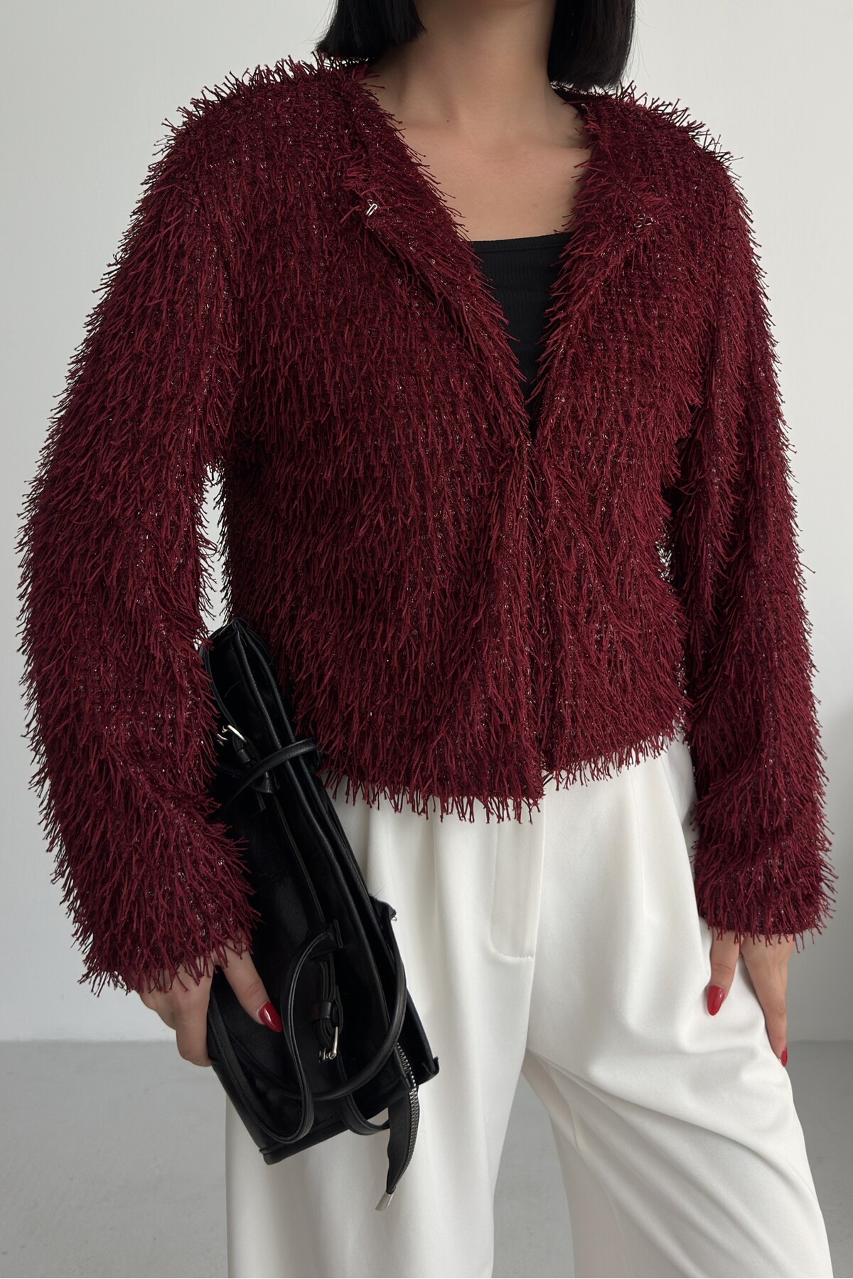 Yakasız İthal Püsküllü Bordo Kürk Mont
