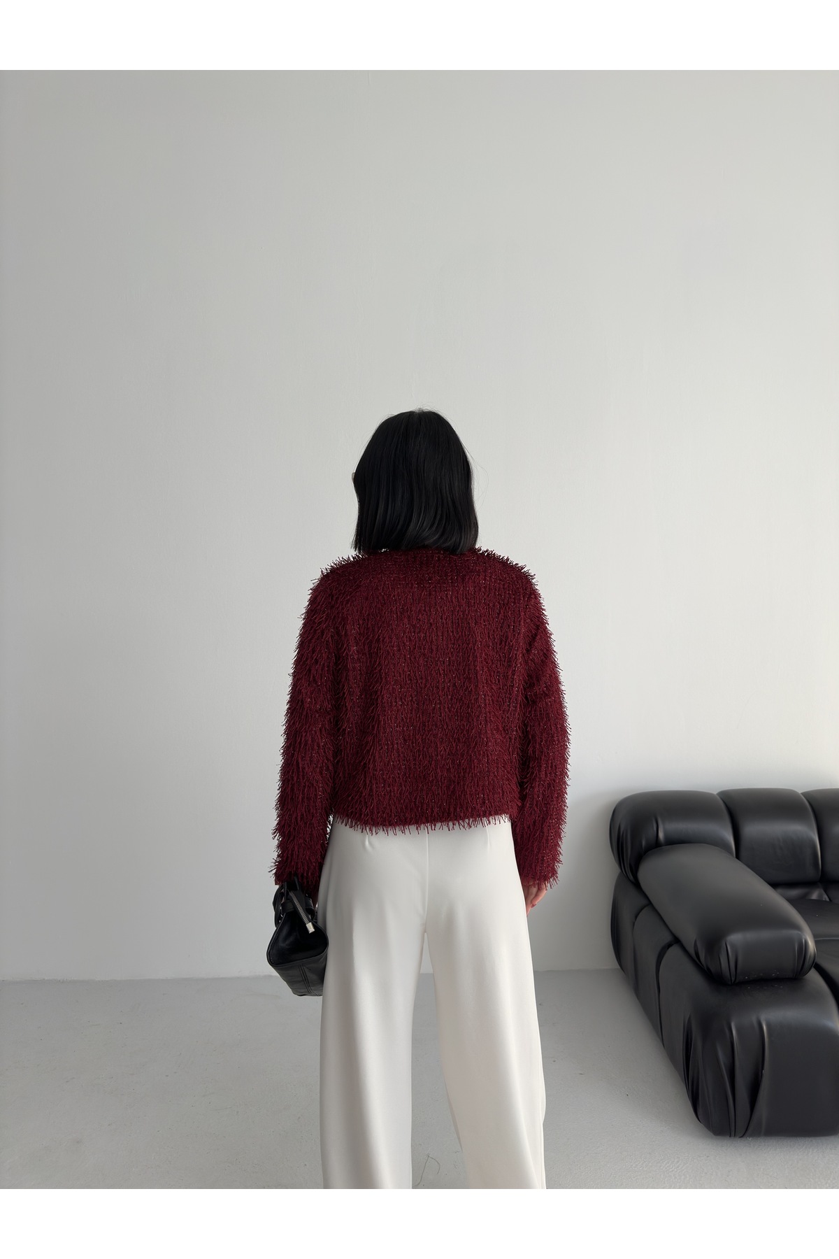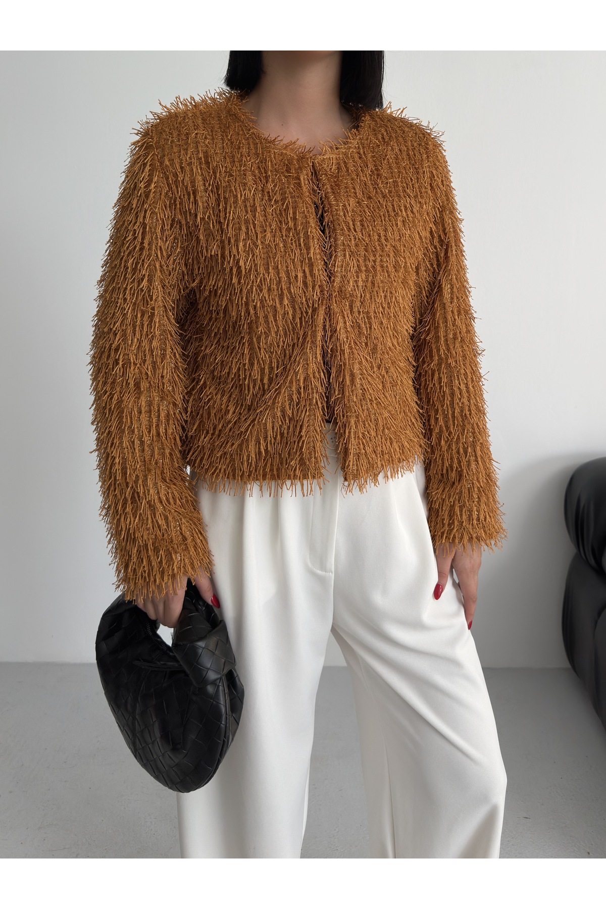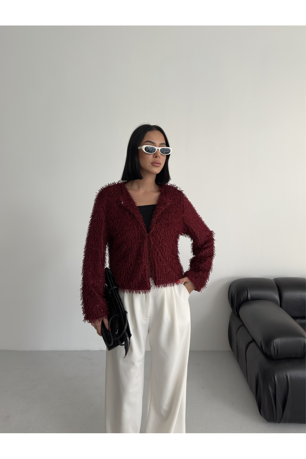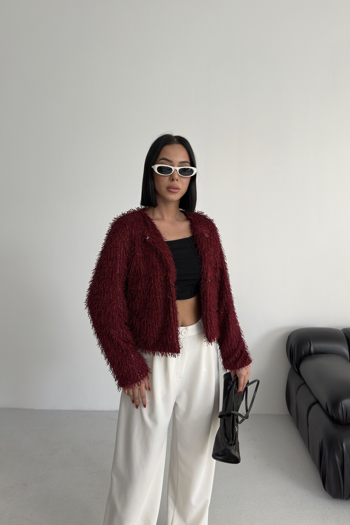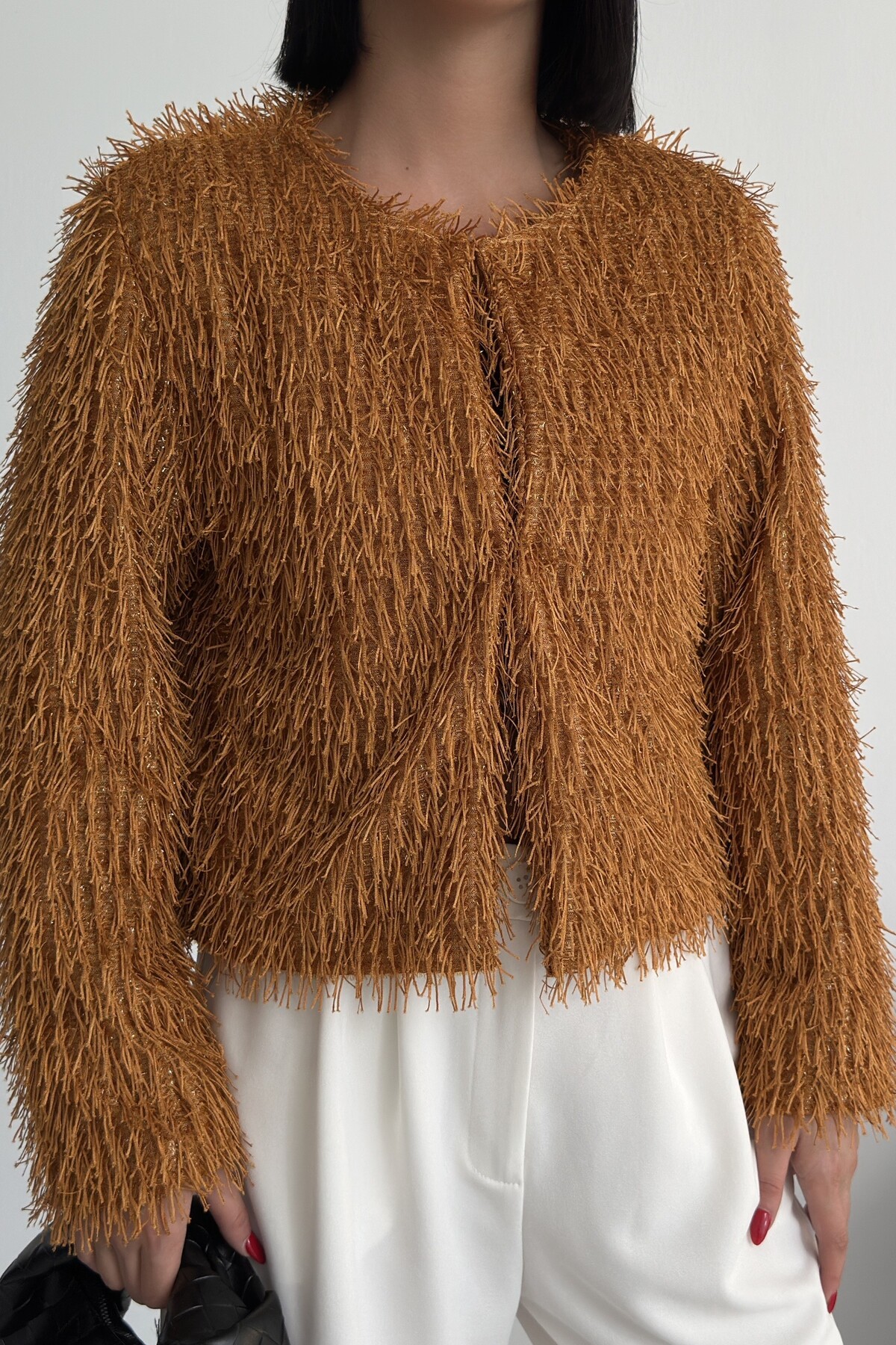 Yakasız İthal Püsküllü Bordo Kürk Mont