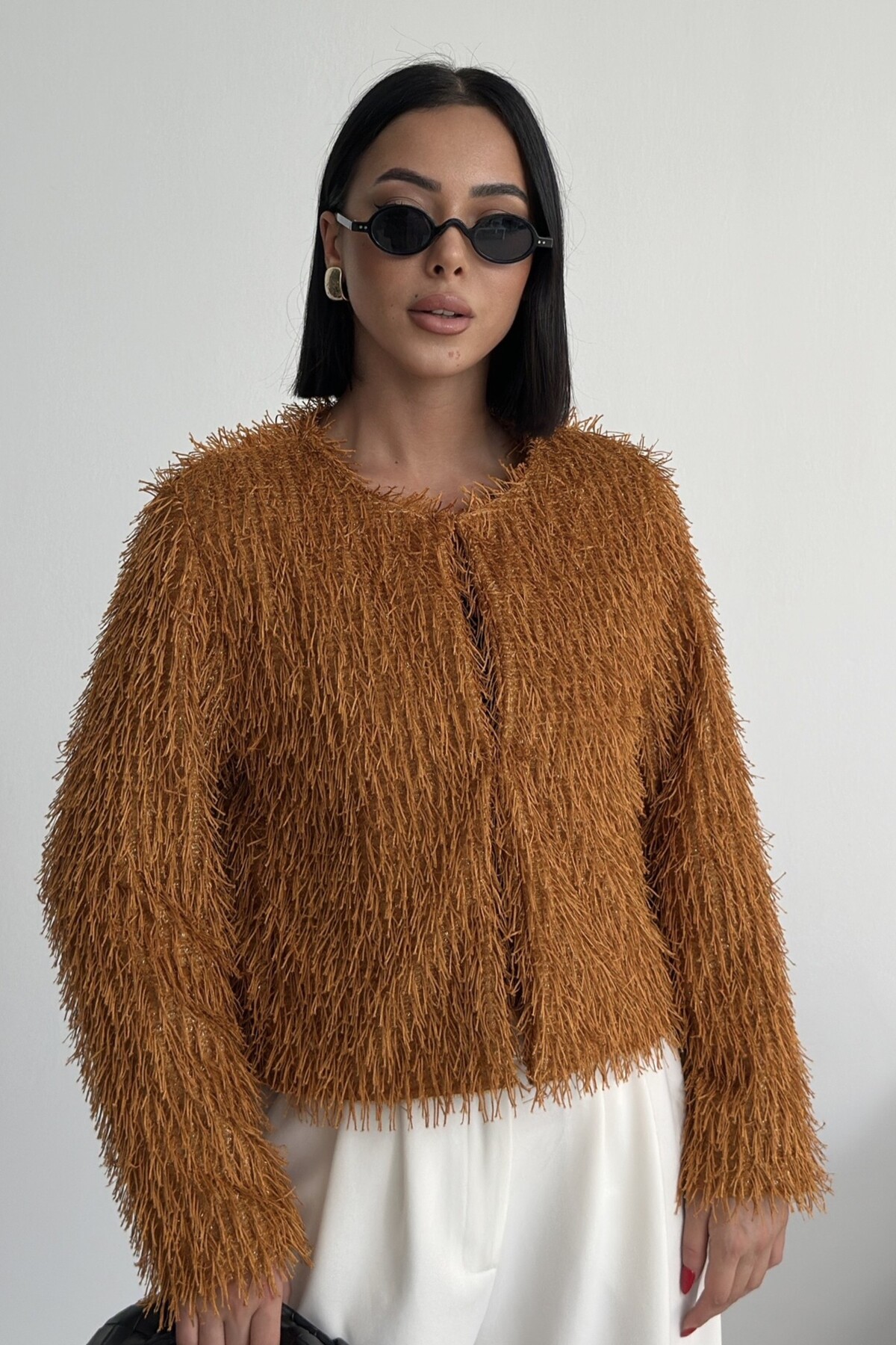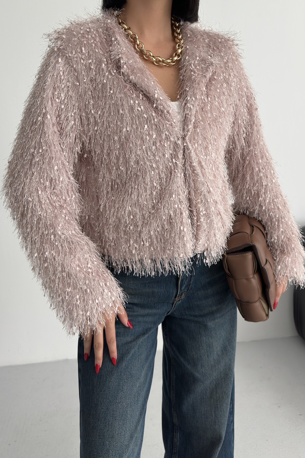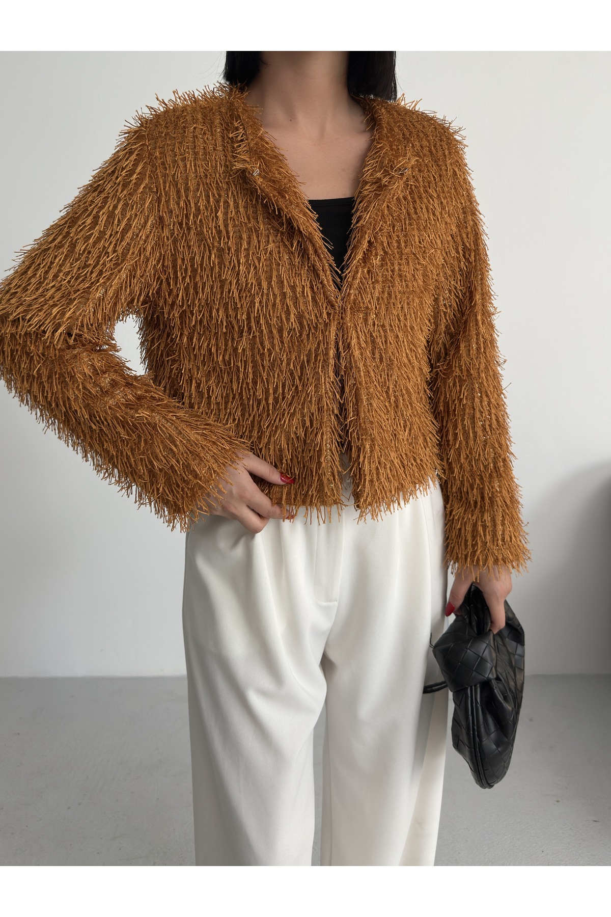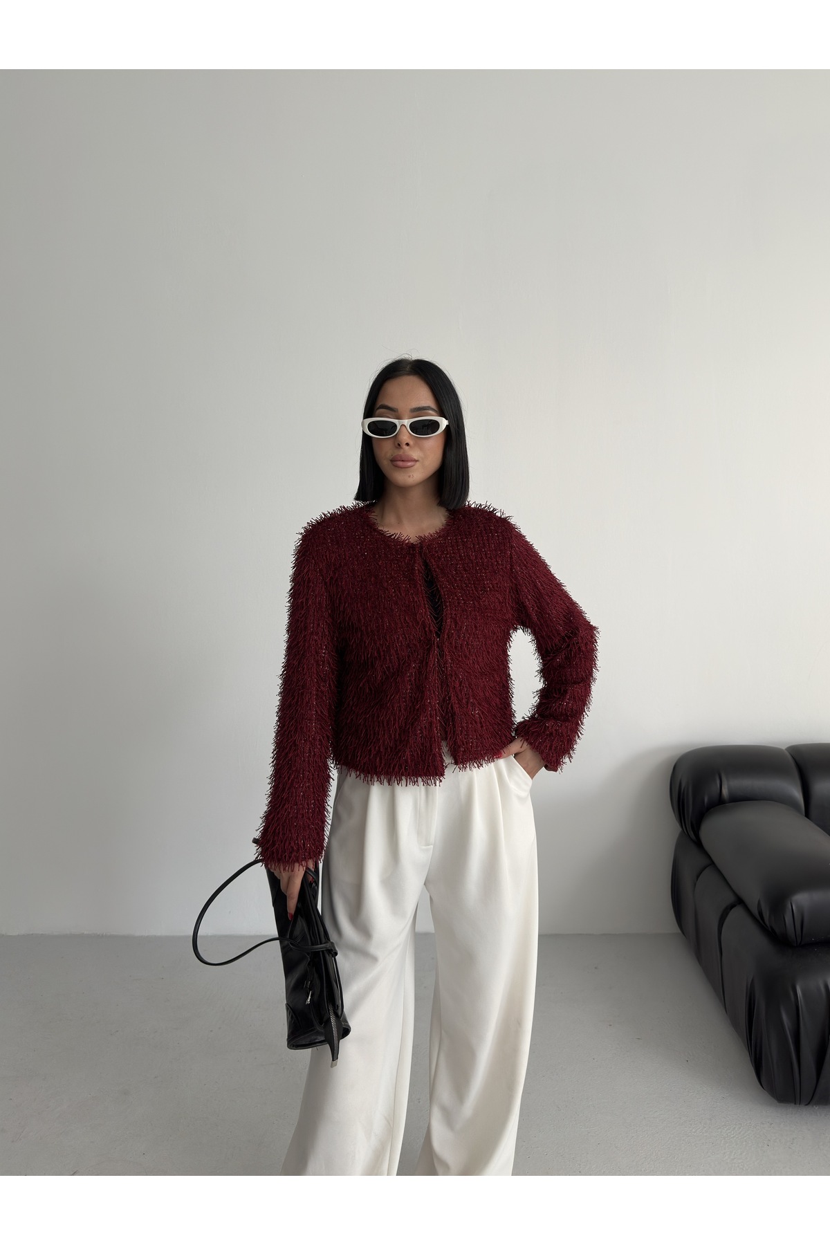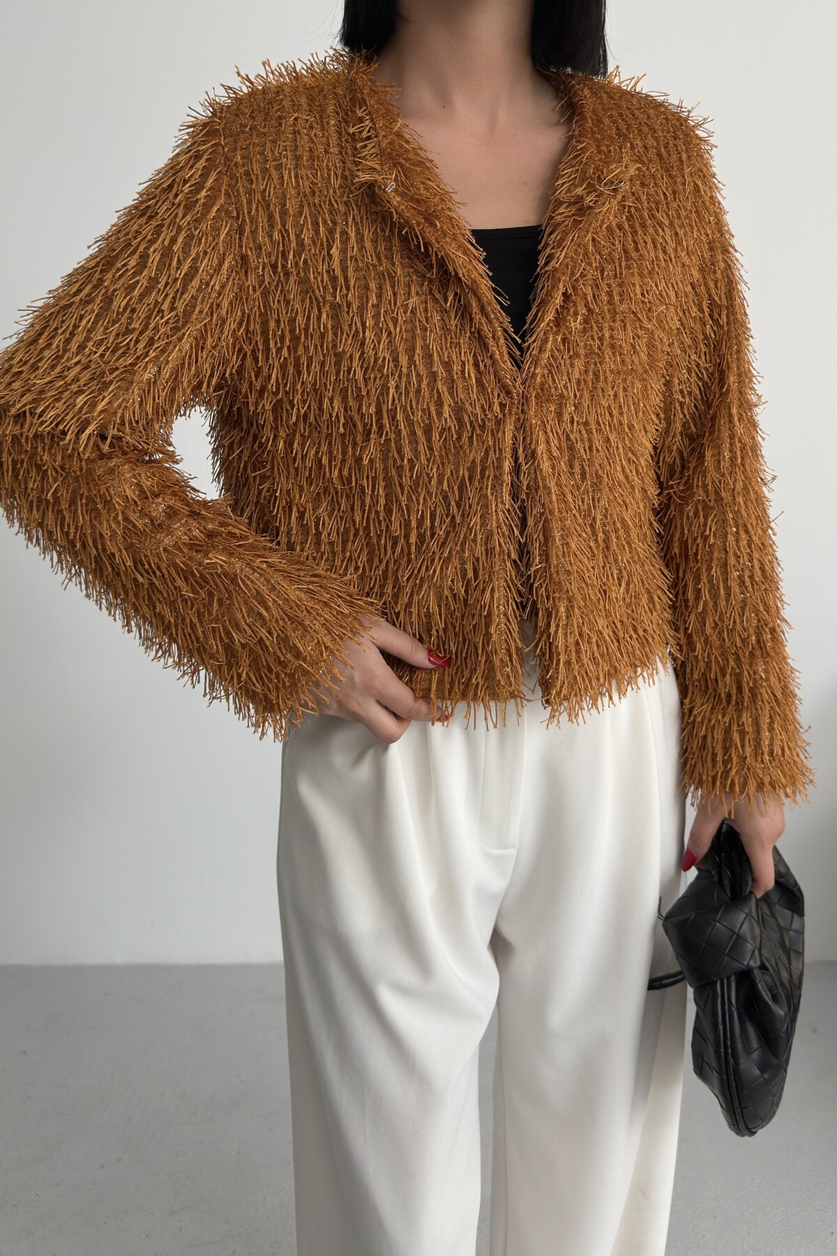 Yakasız İthal Püsküllü Bordo Kürk Mont