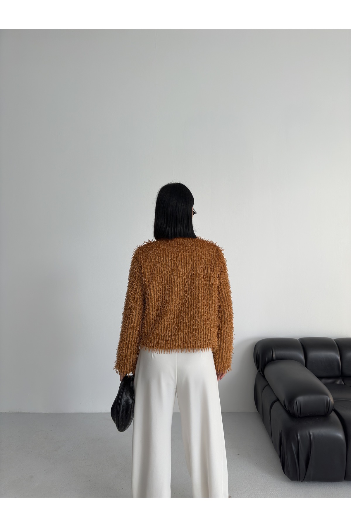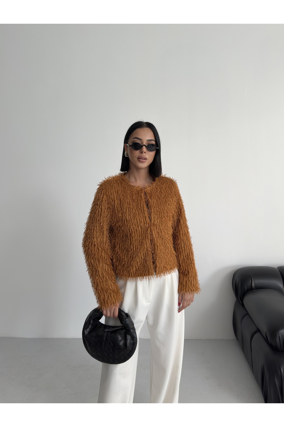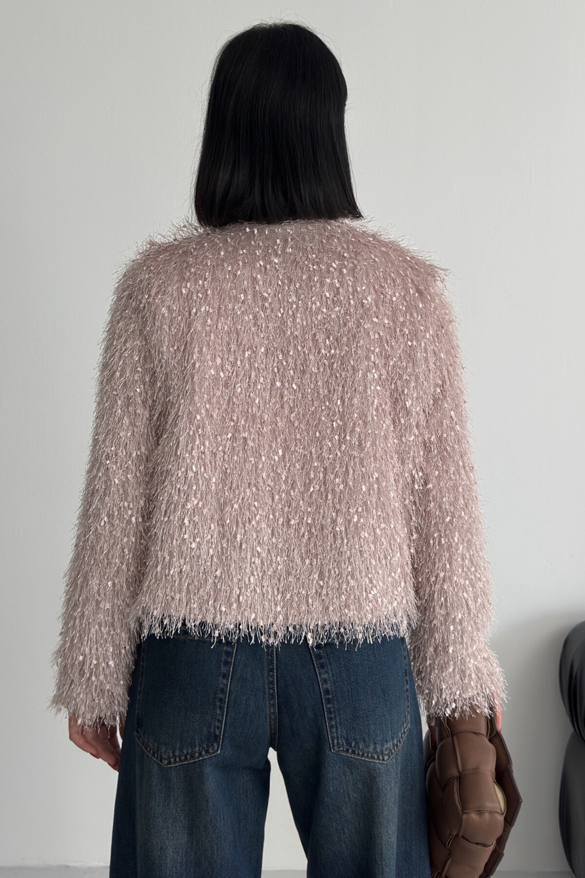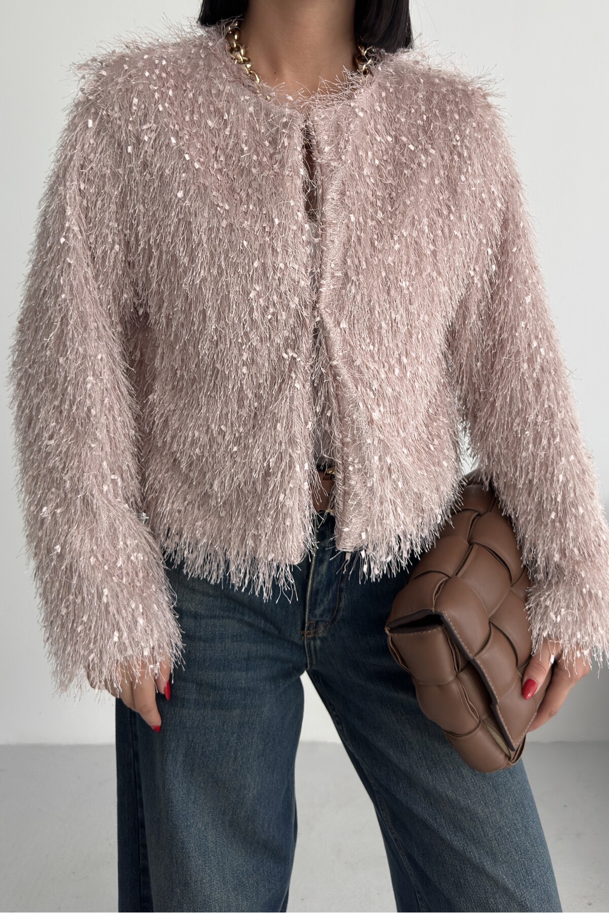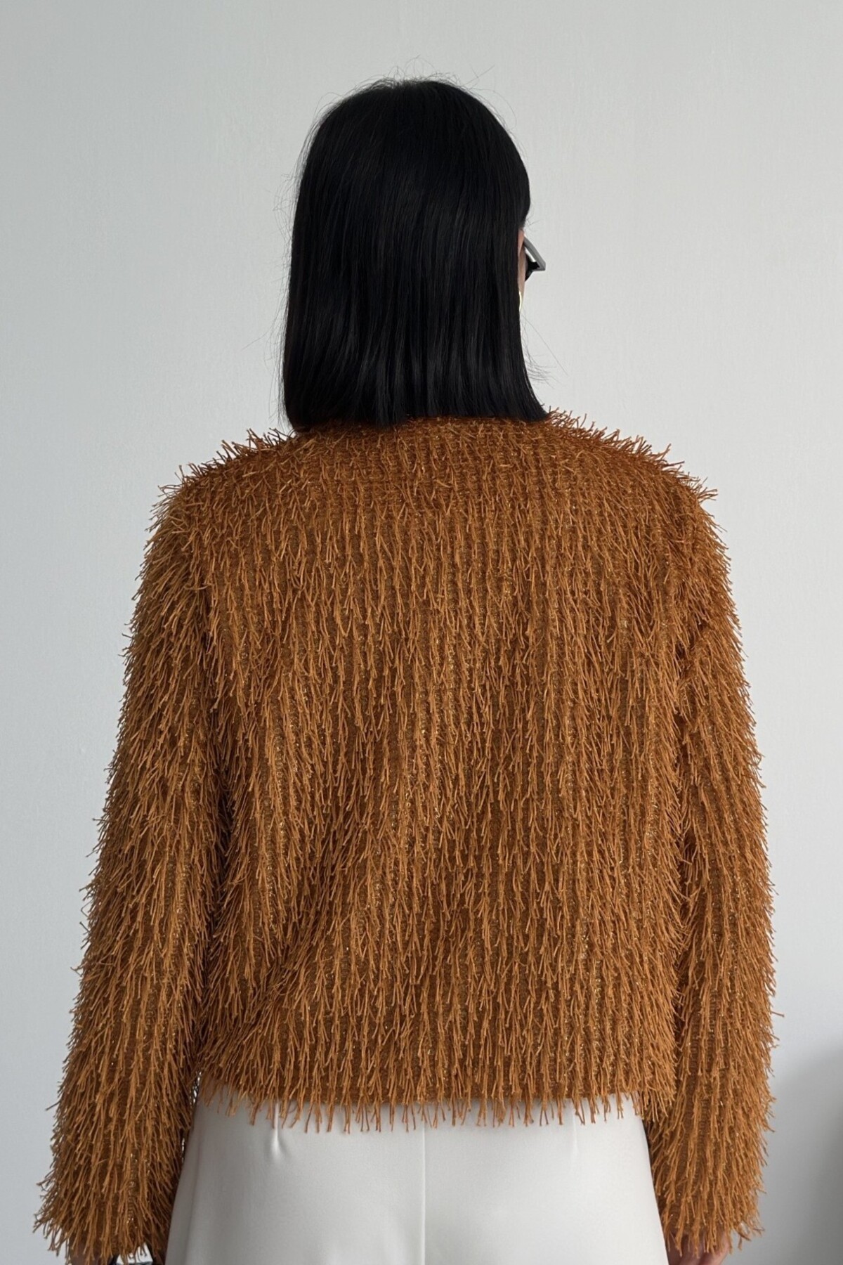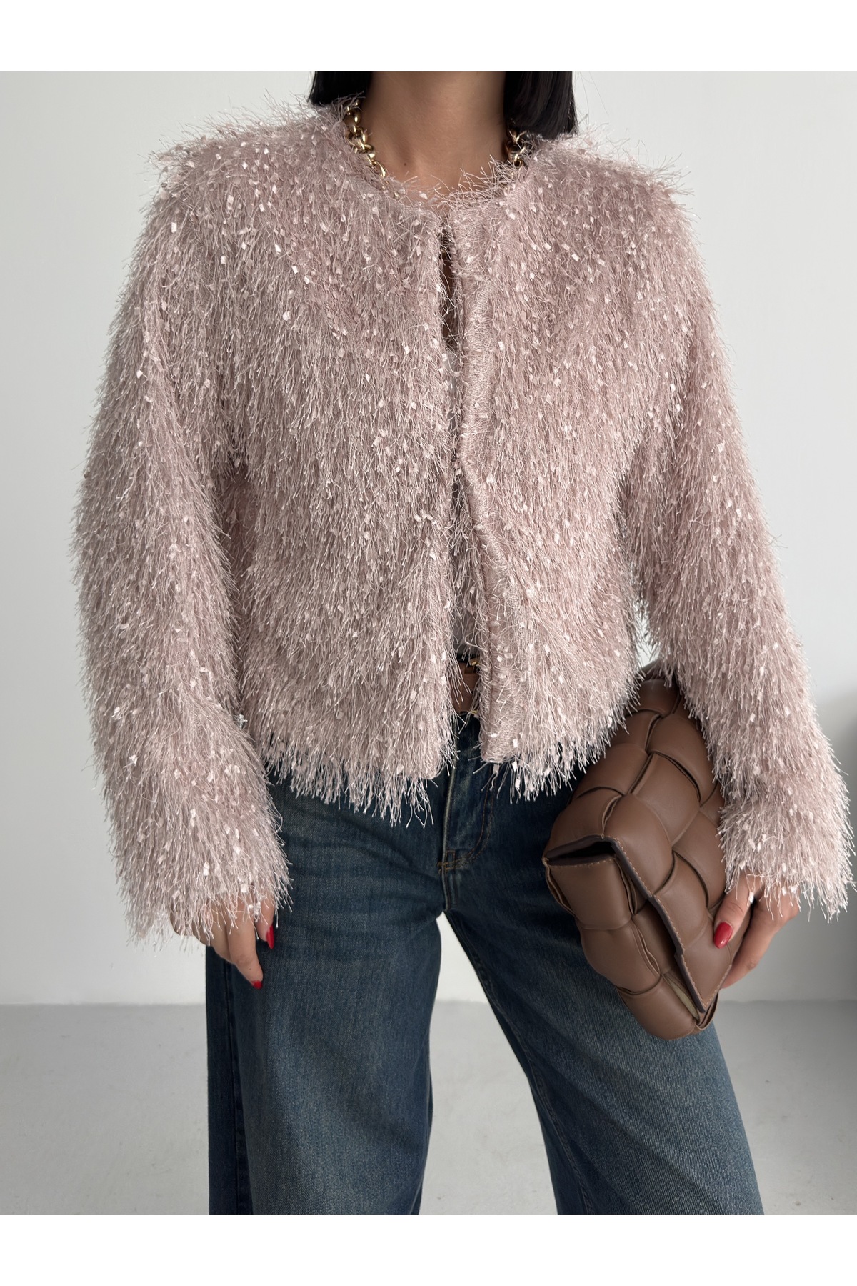 Yakasız İthal Püsküllü Bordo Kürk Mont