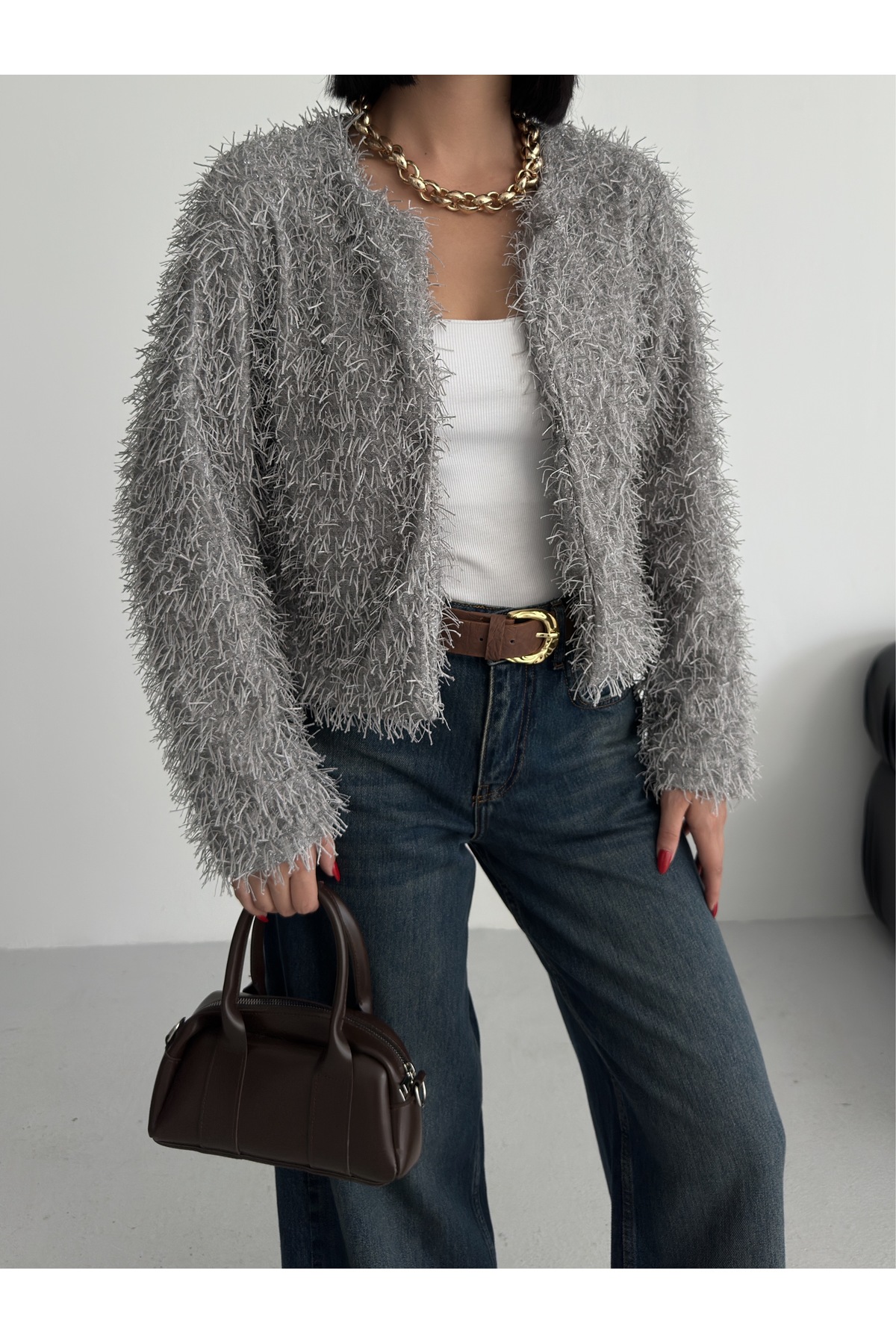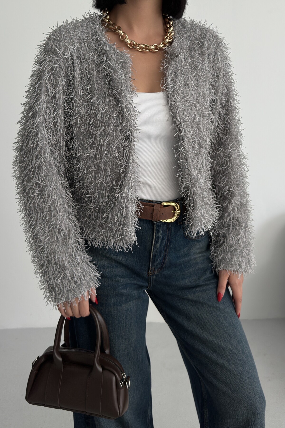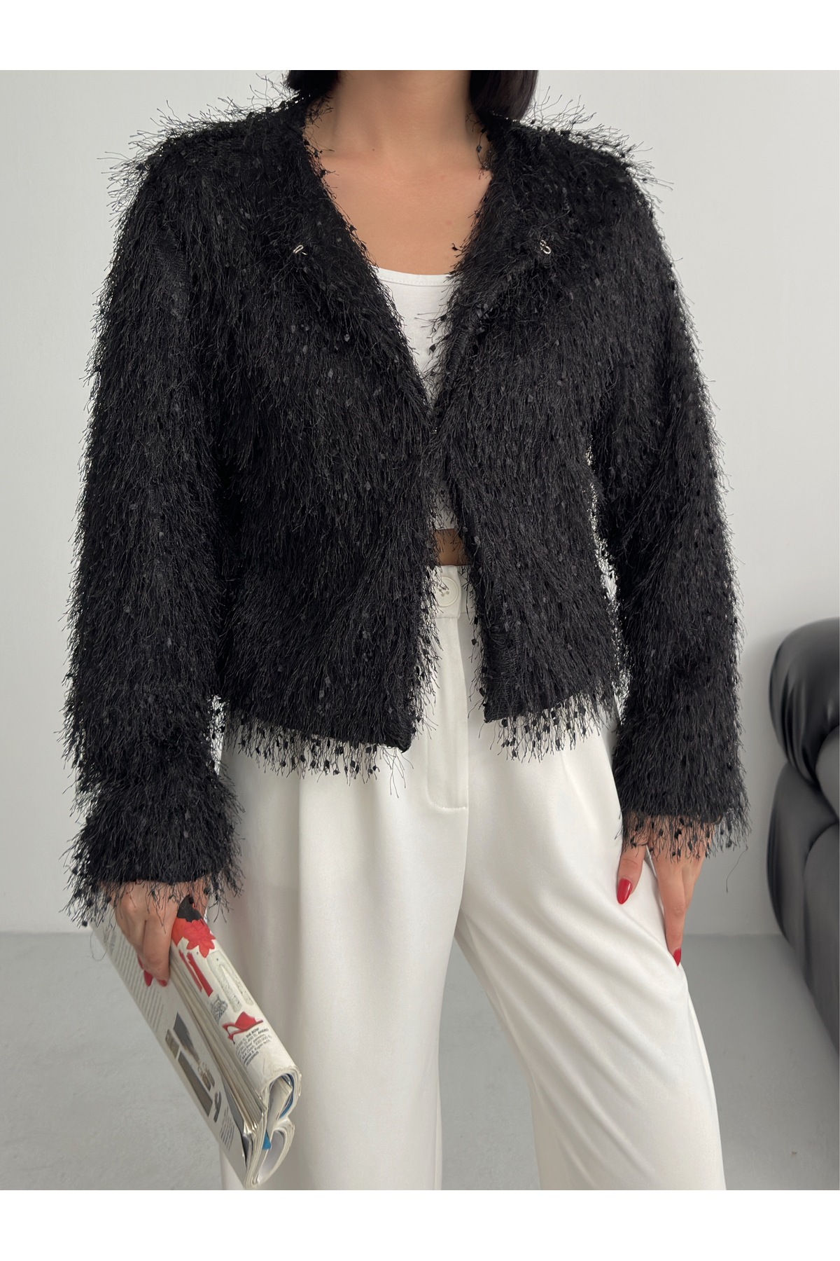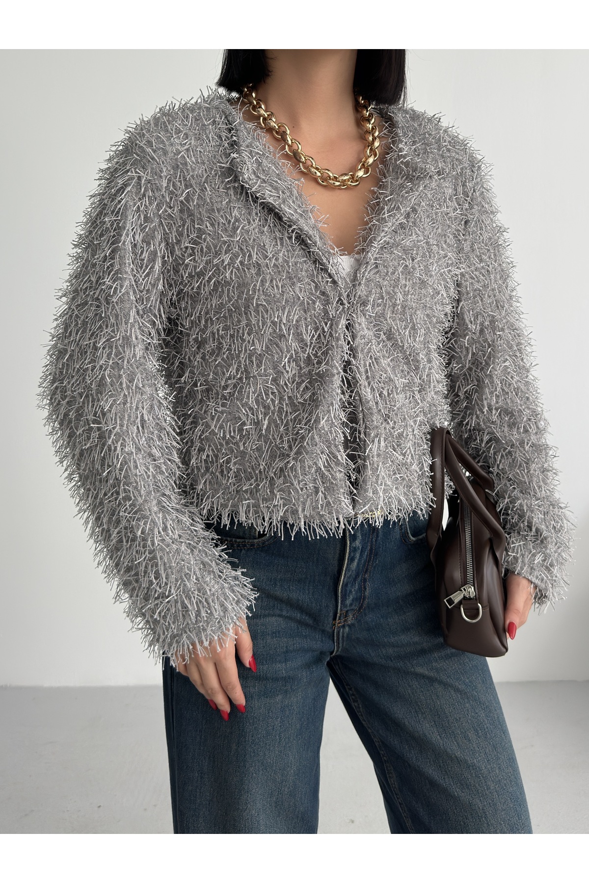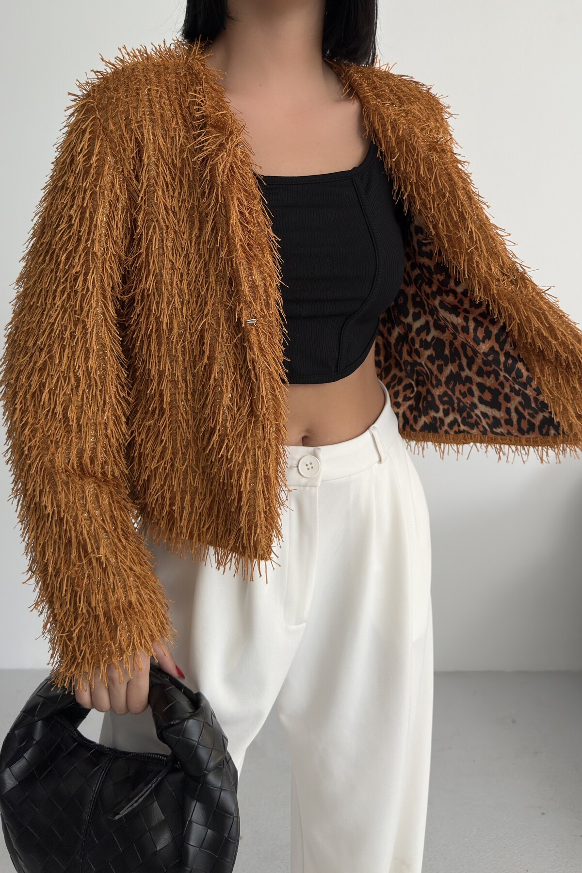 Yakasız İthal Püsküllü Bordo Kürk Mont