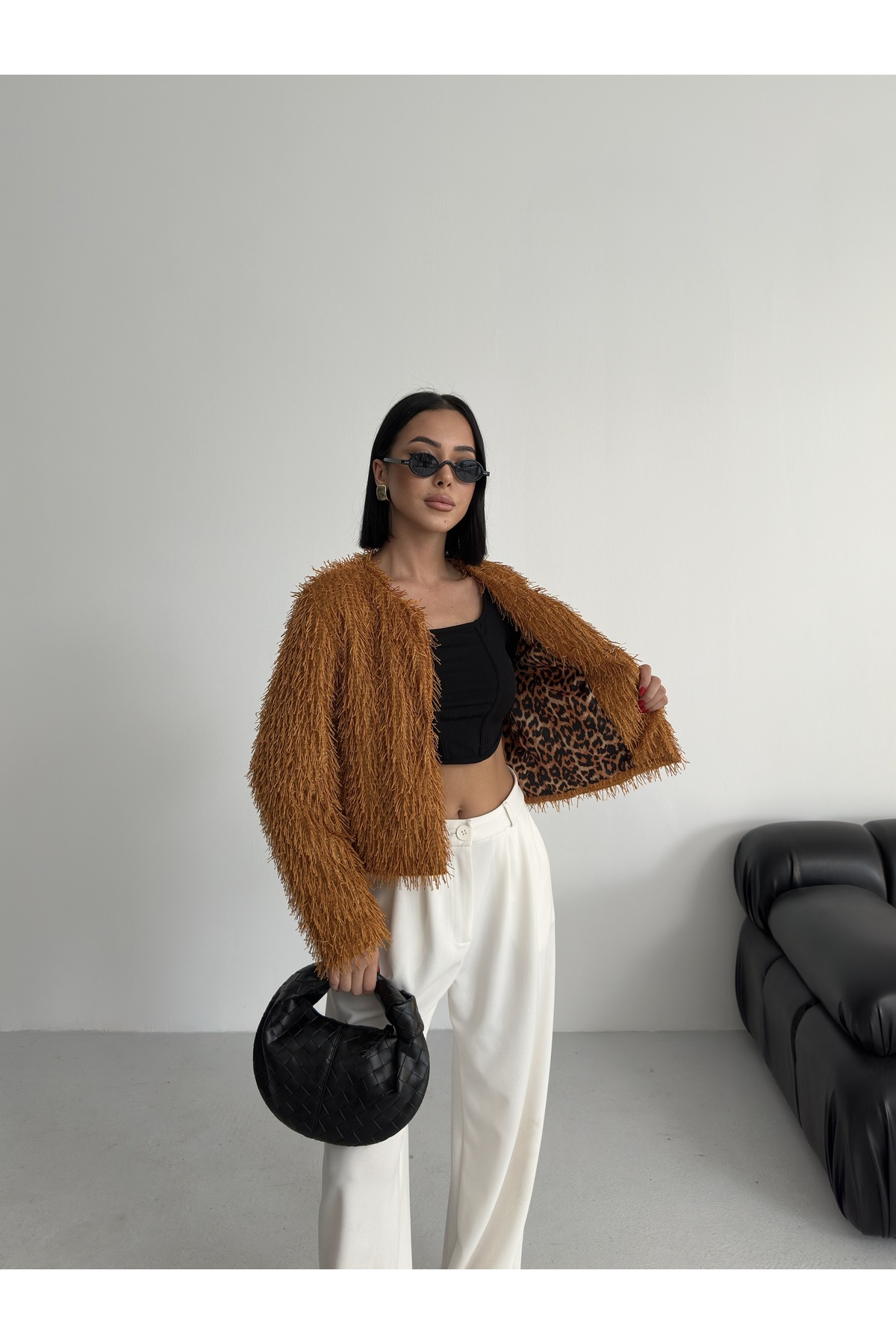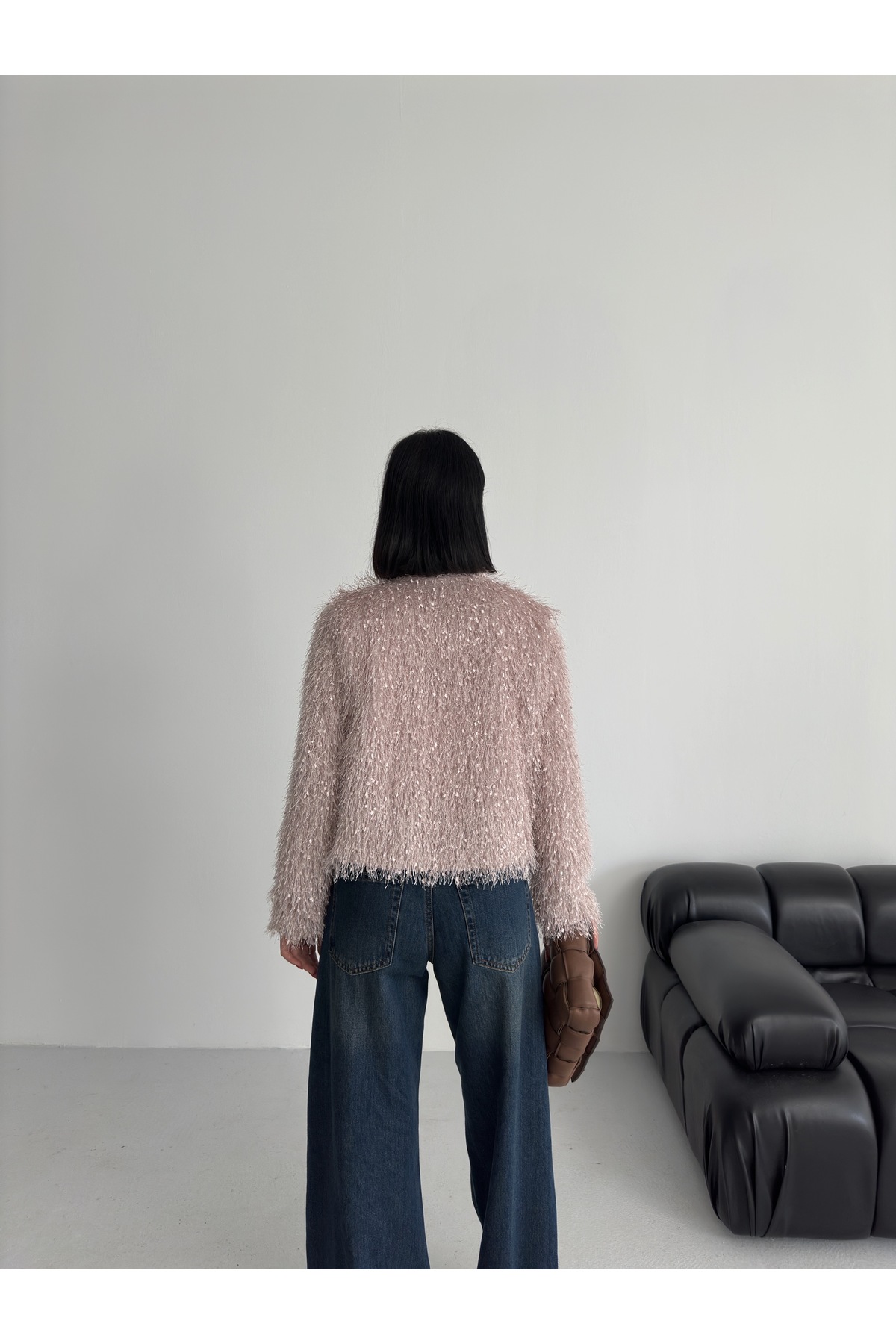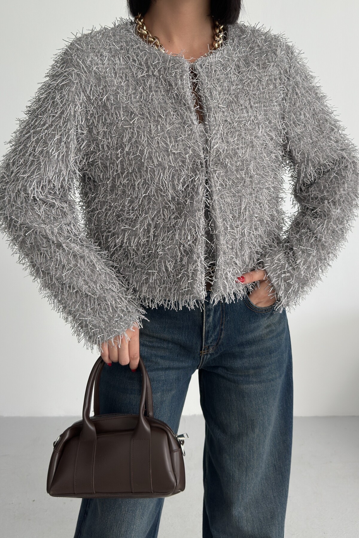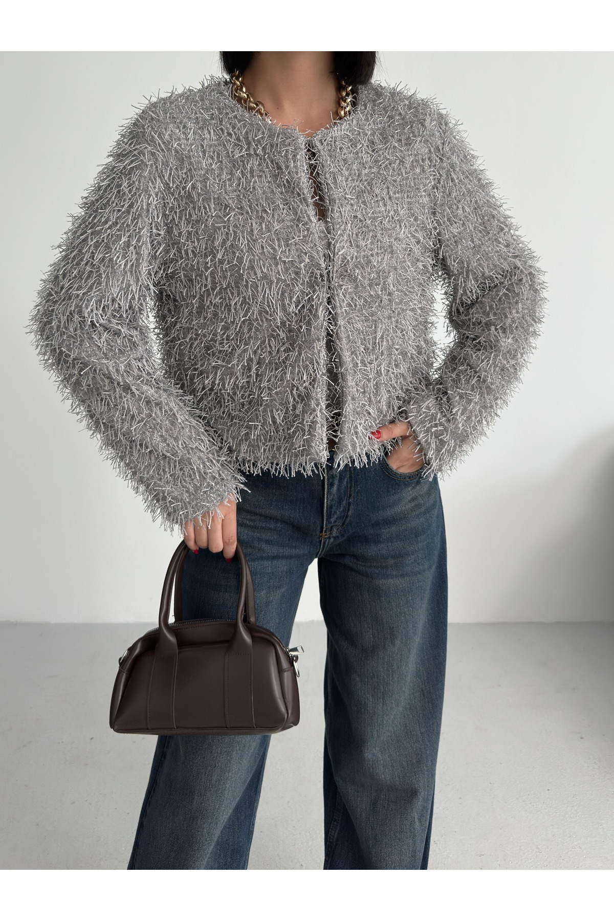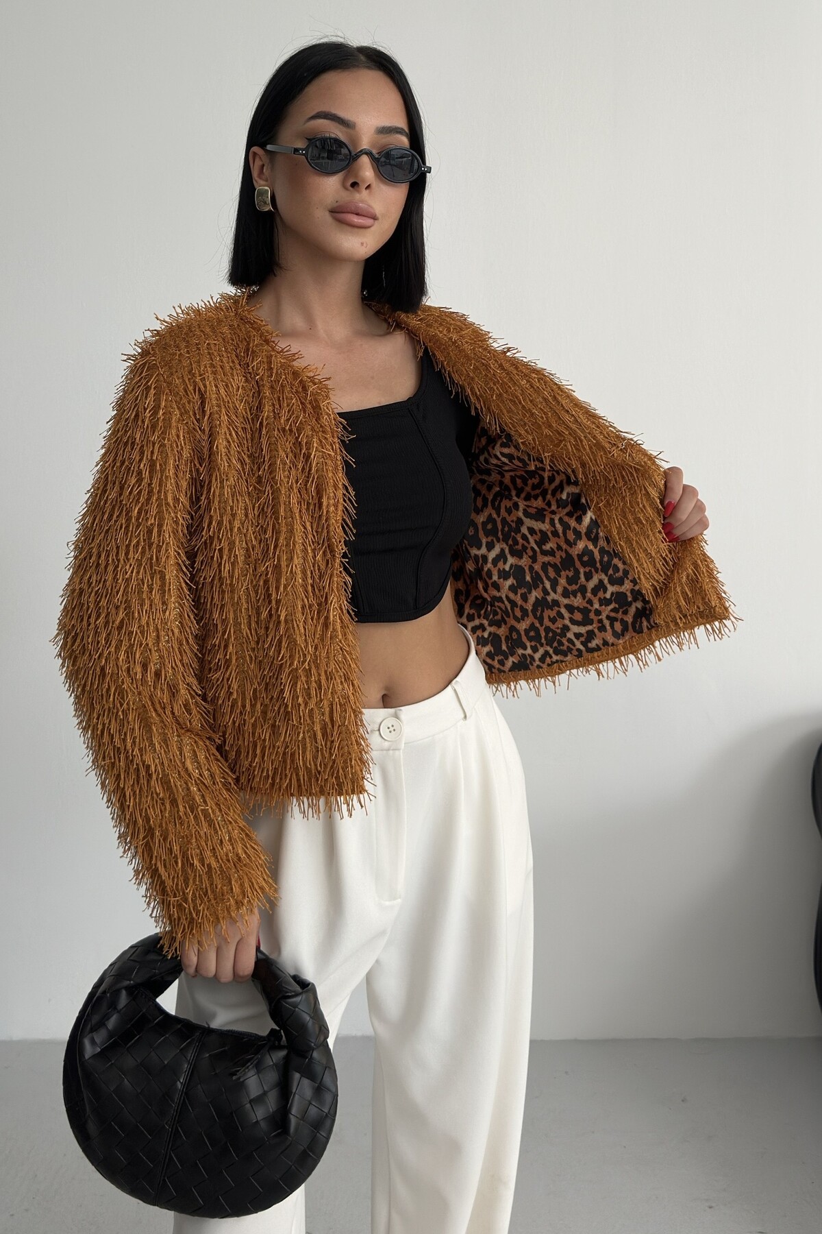 Yakasız İthal Püsküllü Bordo Kürk Mont