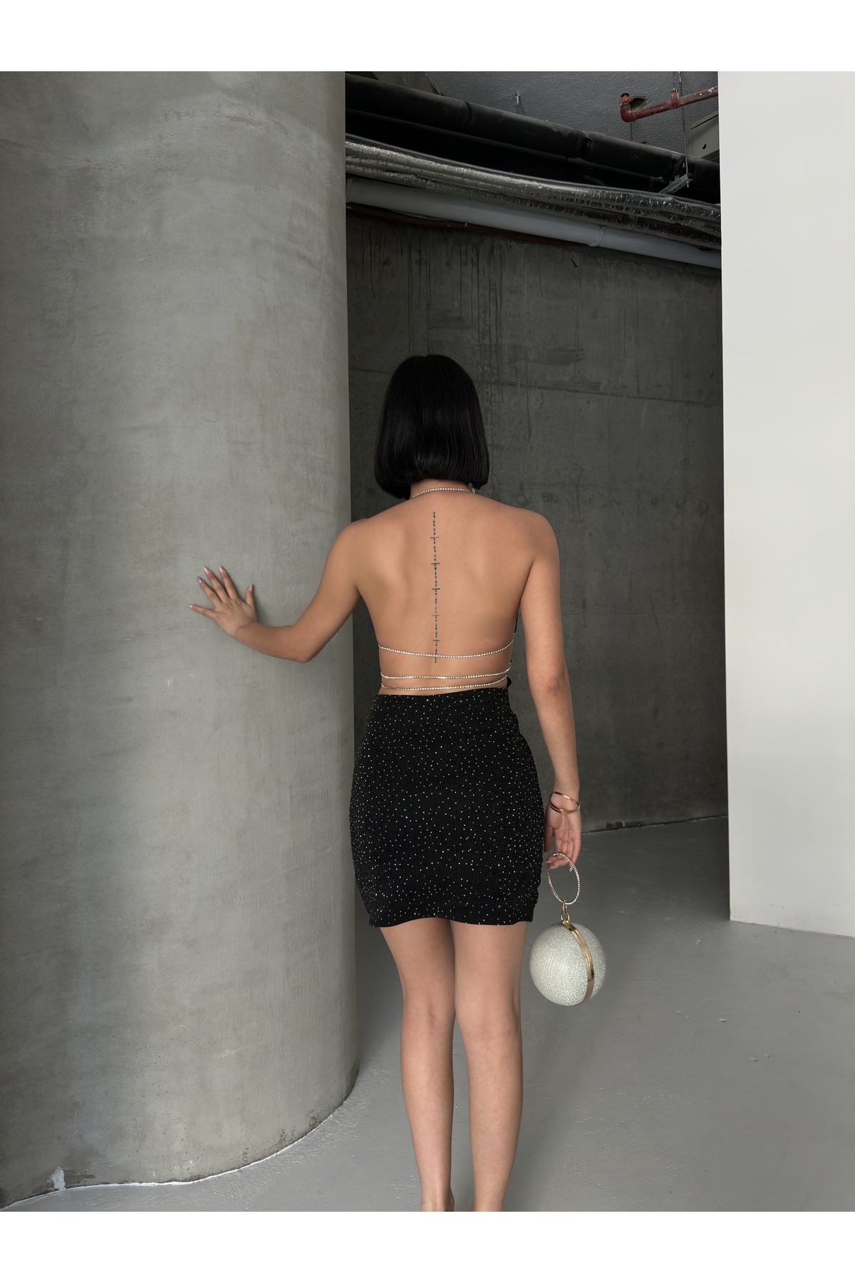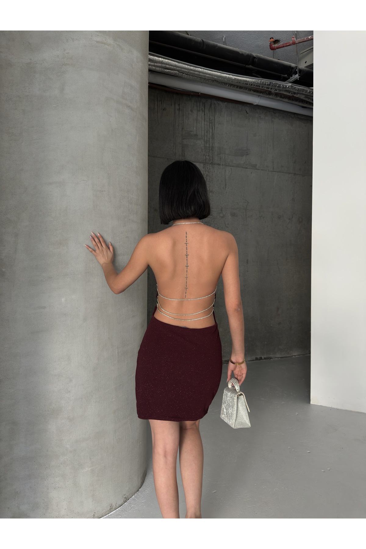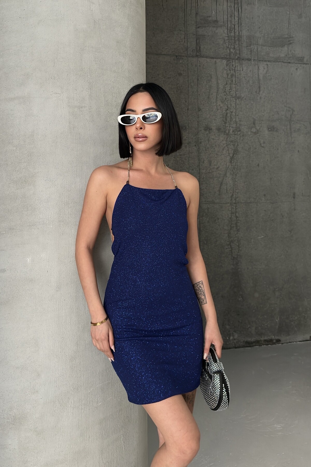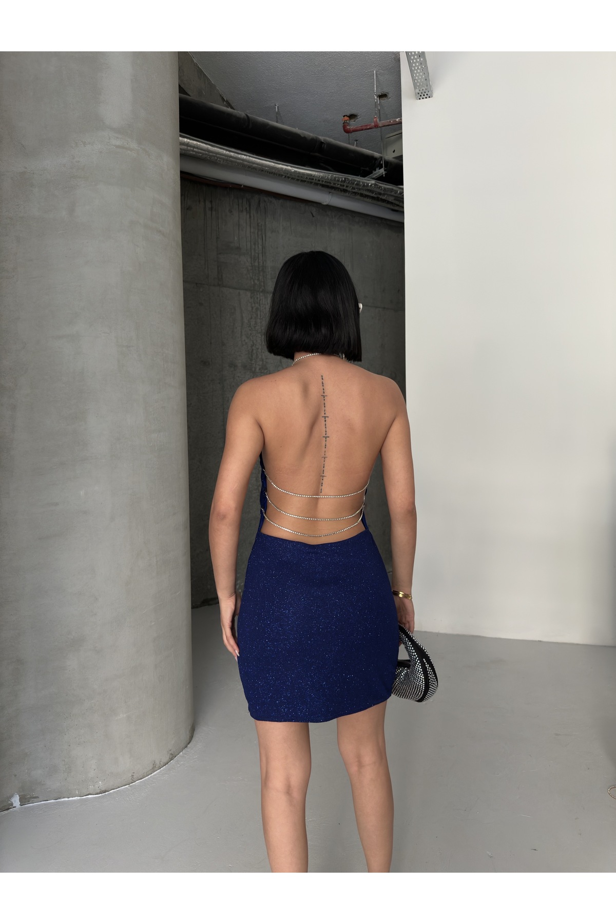 Yılbaşı Özel Sırt Dekolte Ve Taş Zincir Detaylı Lacivert Elbise